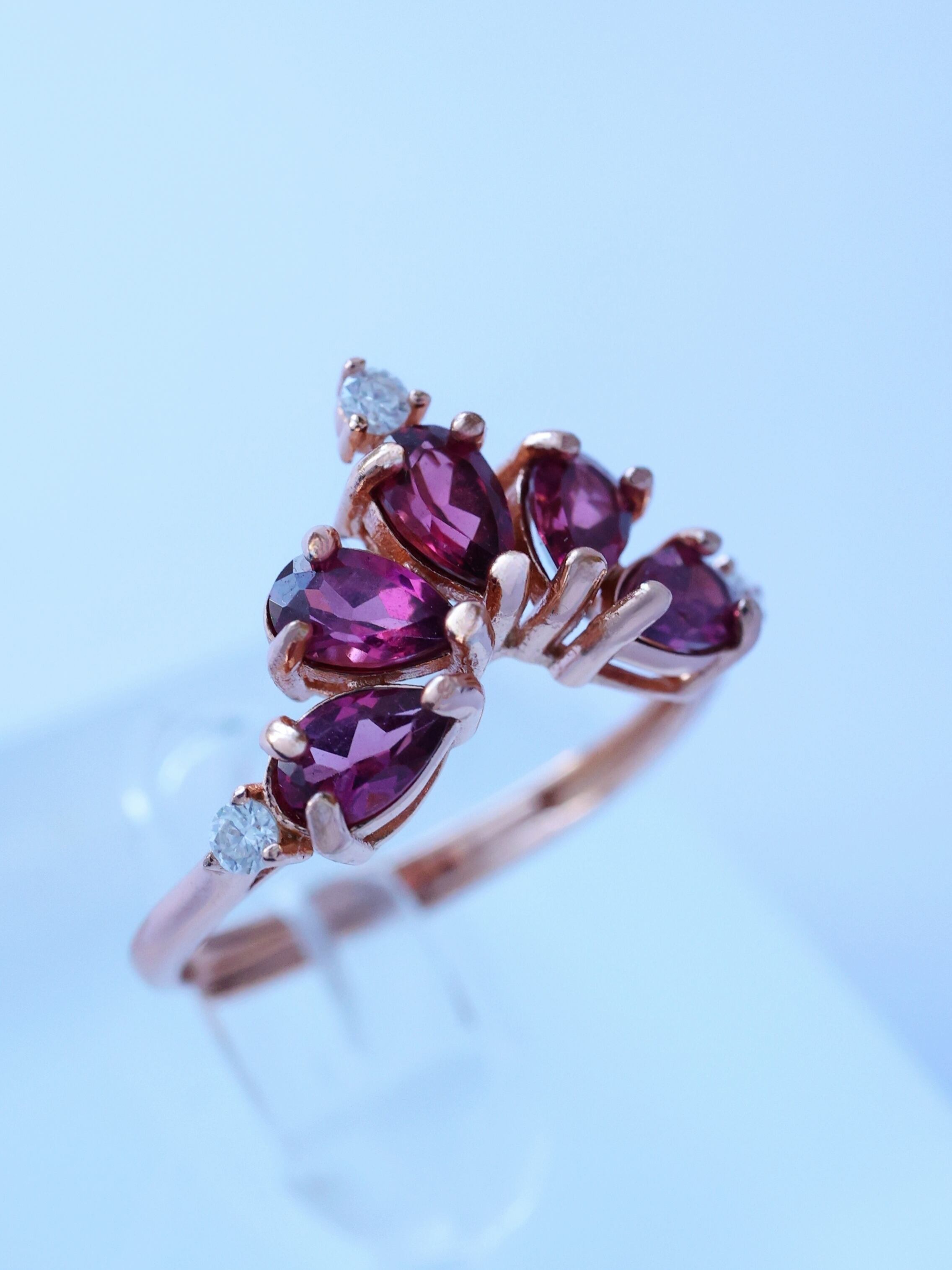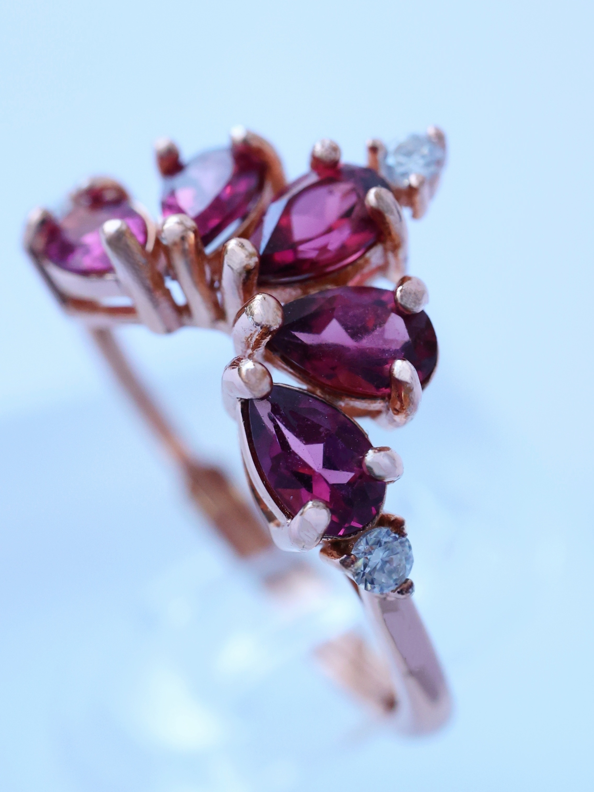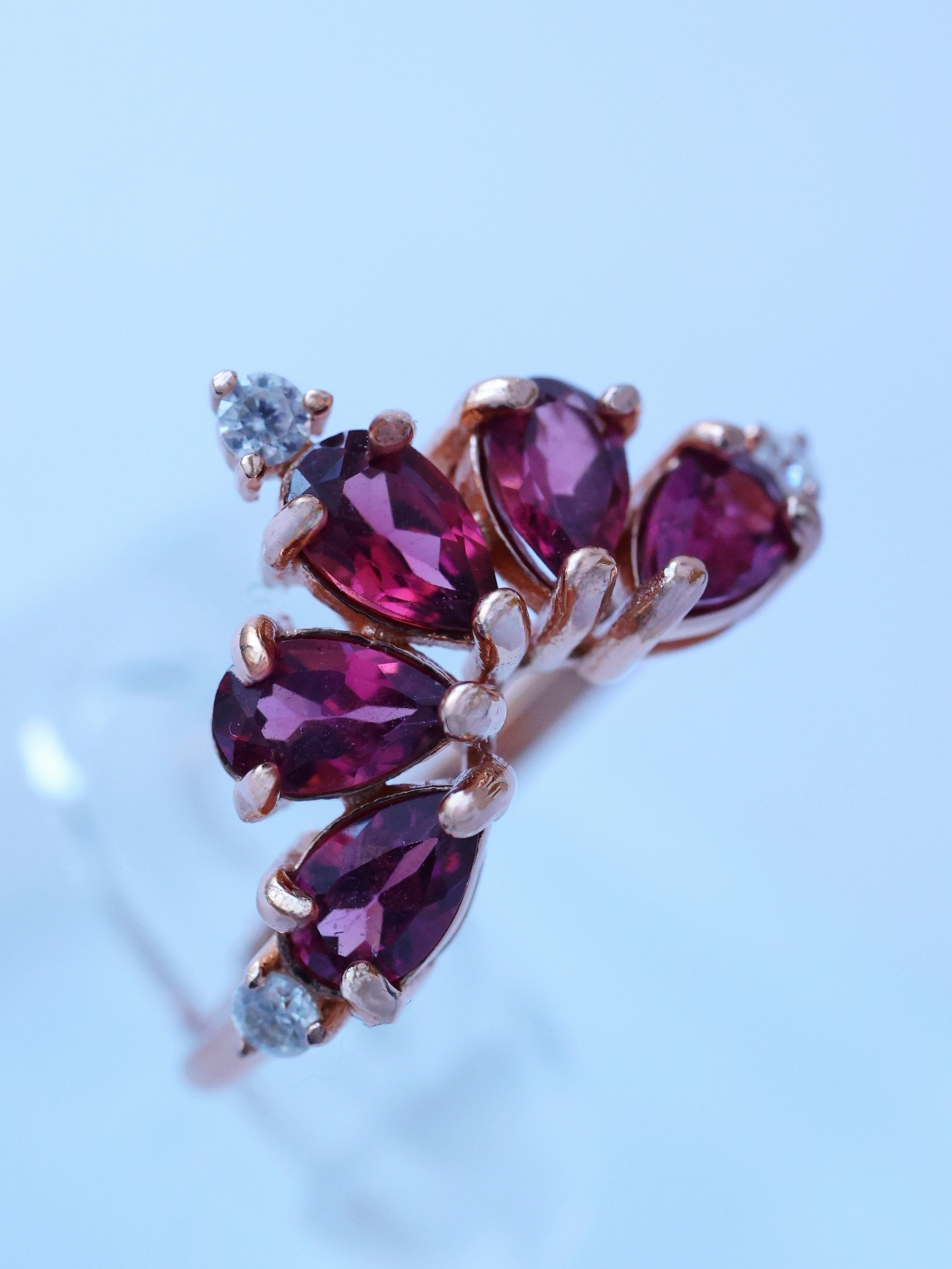 ピンクゴールドカラーの地金との組み合わせにより、ロードライトガーネットの持つ艶やかさがより引き立ち、優美さと温もりを感じさせる印象に。
