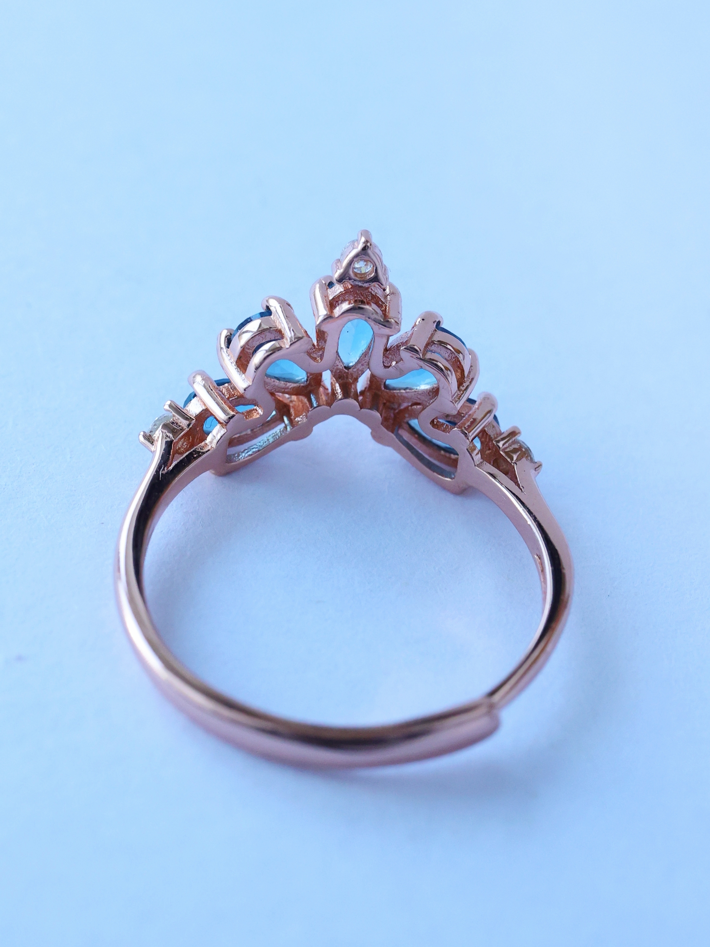 ペアシェイプカットのルースを王冠状に配することで、石の奥から滲むような深みと、立体的な輝きを引き出しています。