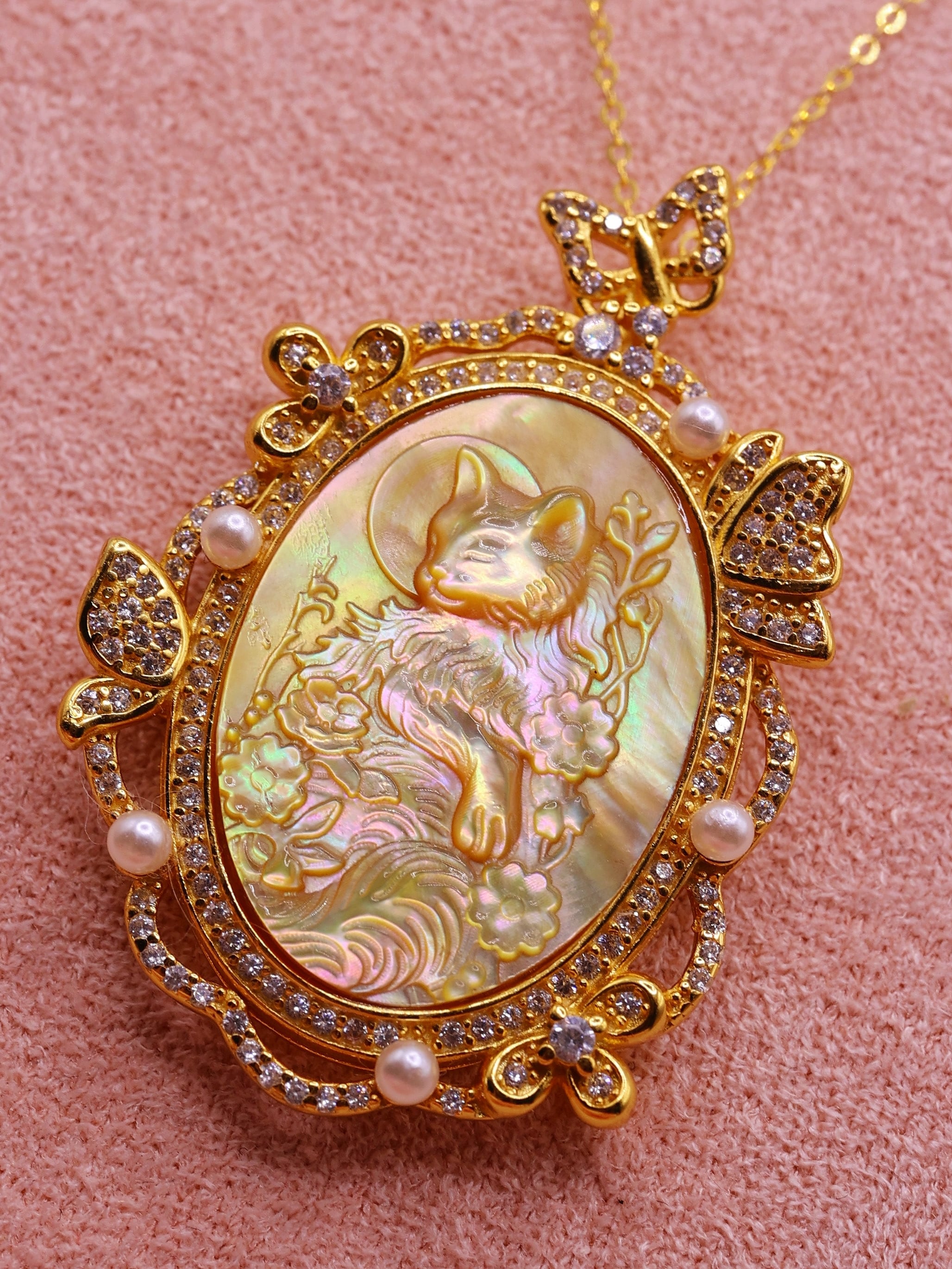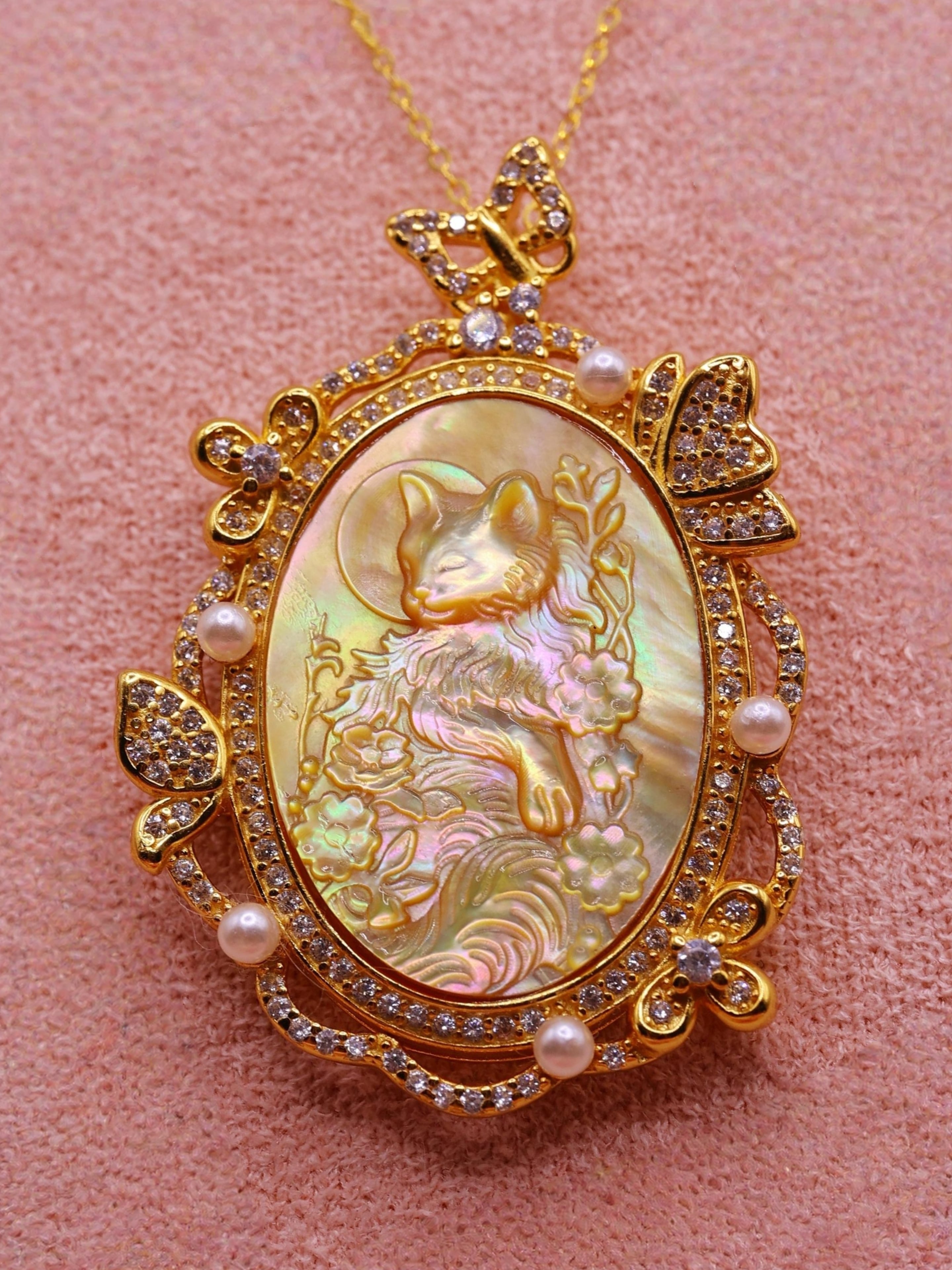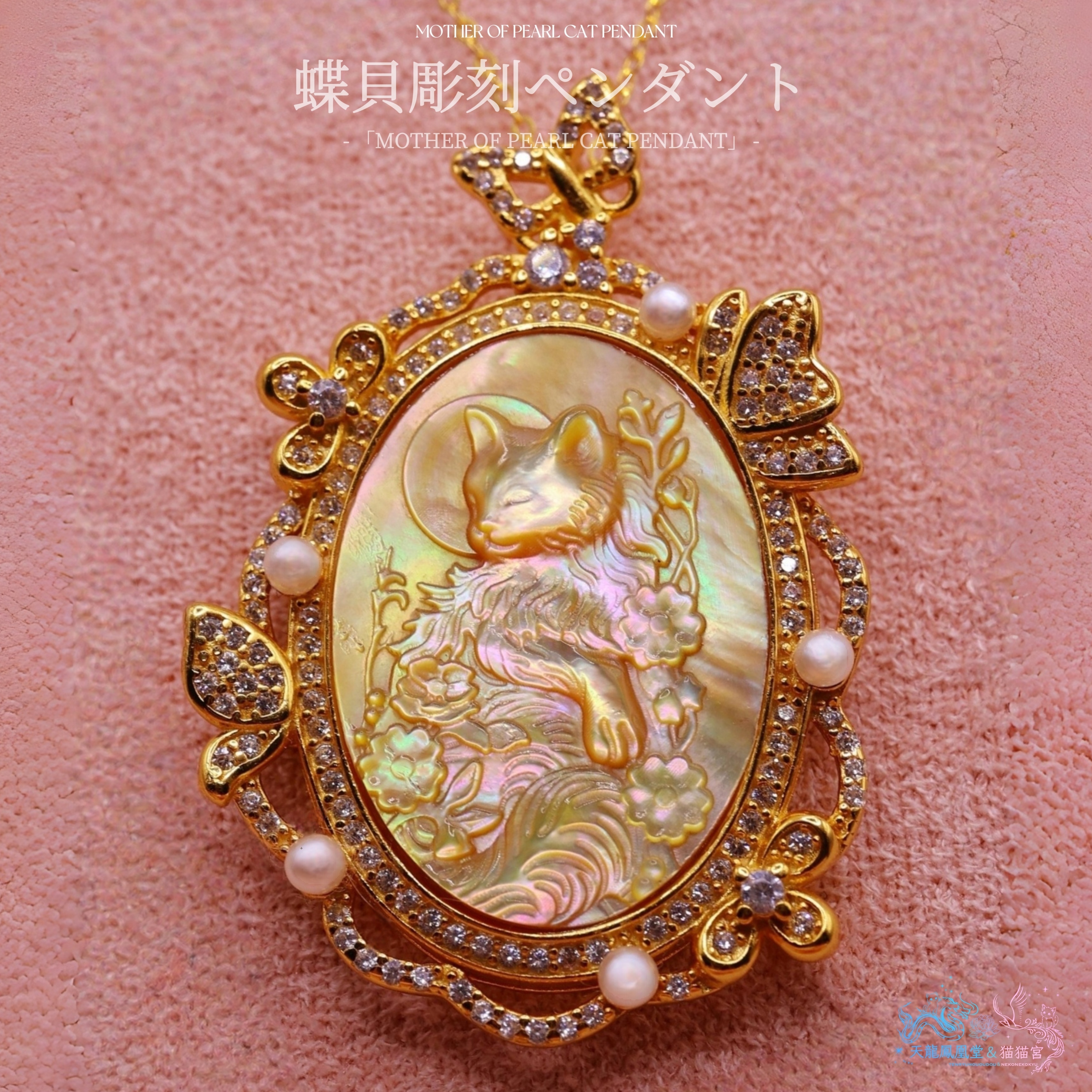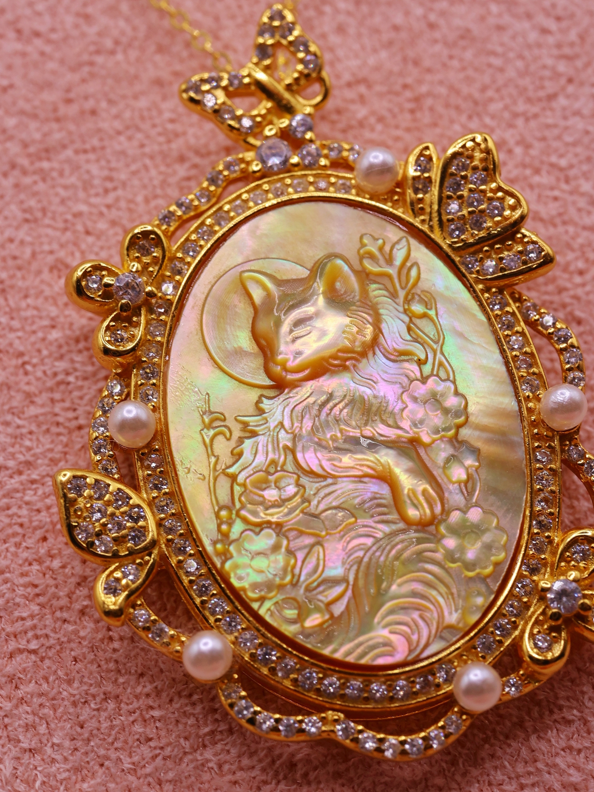 柔らかな黄金色の光を帯びた金蝶貝に、優雅に佇む猫の姿を繊細に彫刻した、気品あふれる2WAYジュエリー。
