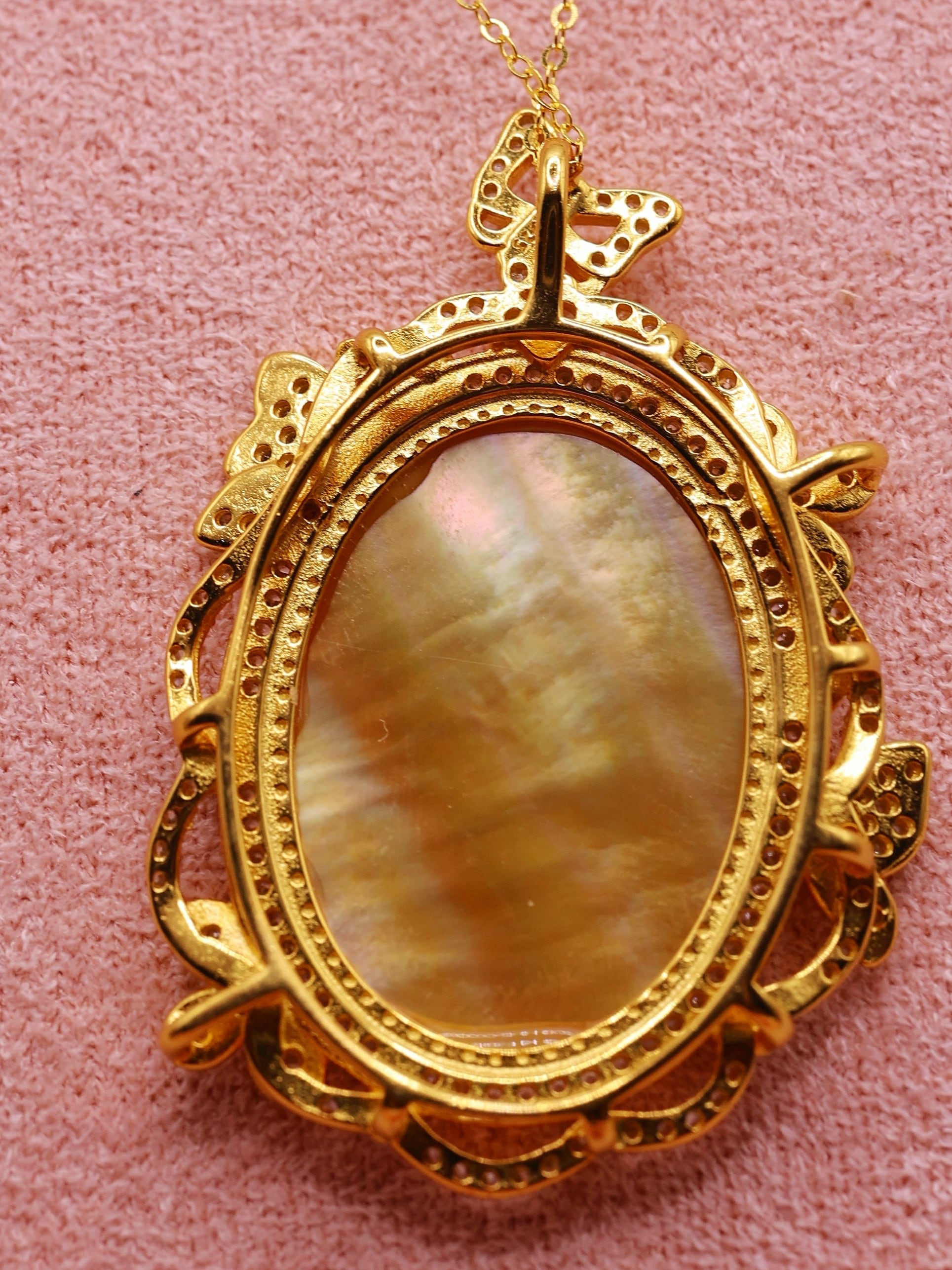 リボンや蝶のモチーフ、小粒ストーン、淡水パールを組み合わせたクラシカルで華やかな造形が、中央の金蝶貝彫刻を額縁のように引き立てています。