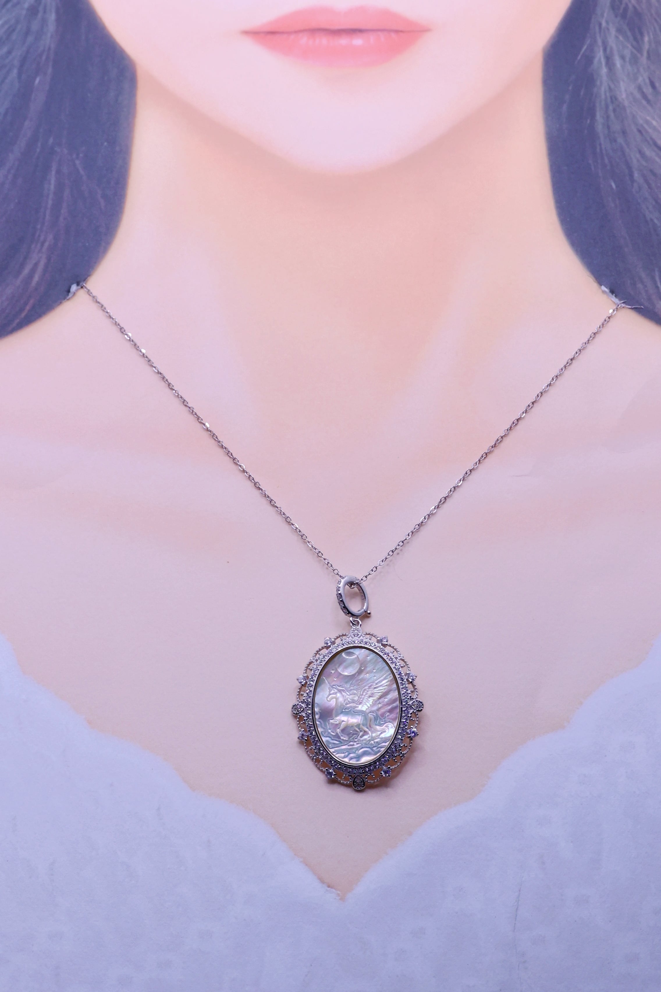 月光のように澄んだ輝きを湛えた白蝶貝に、夜空を駆けるペガサスの姿を繊細に彫刻した、幻想的なペンダント。