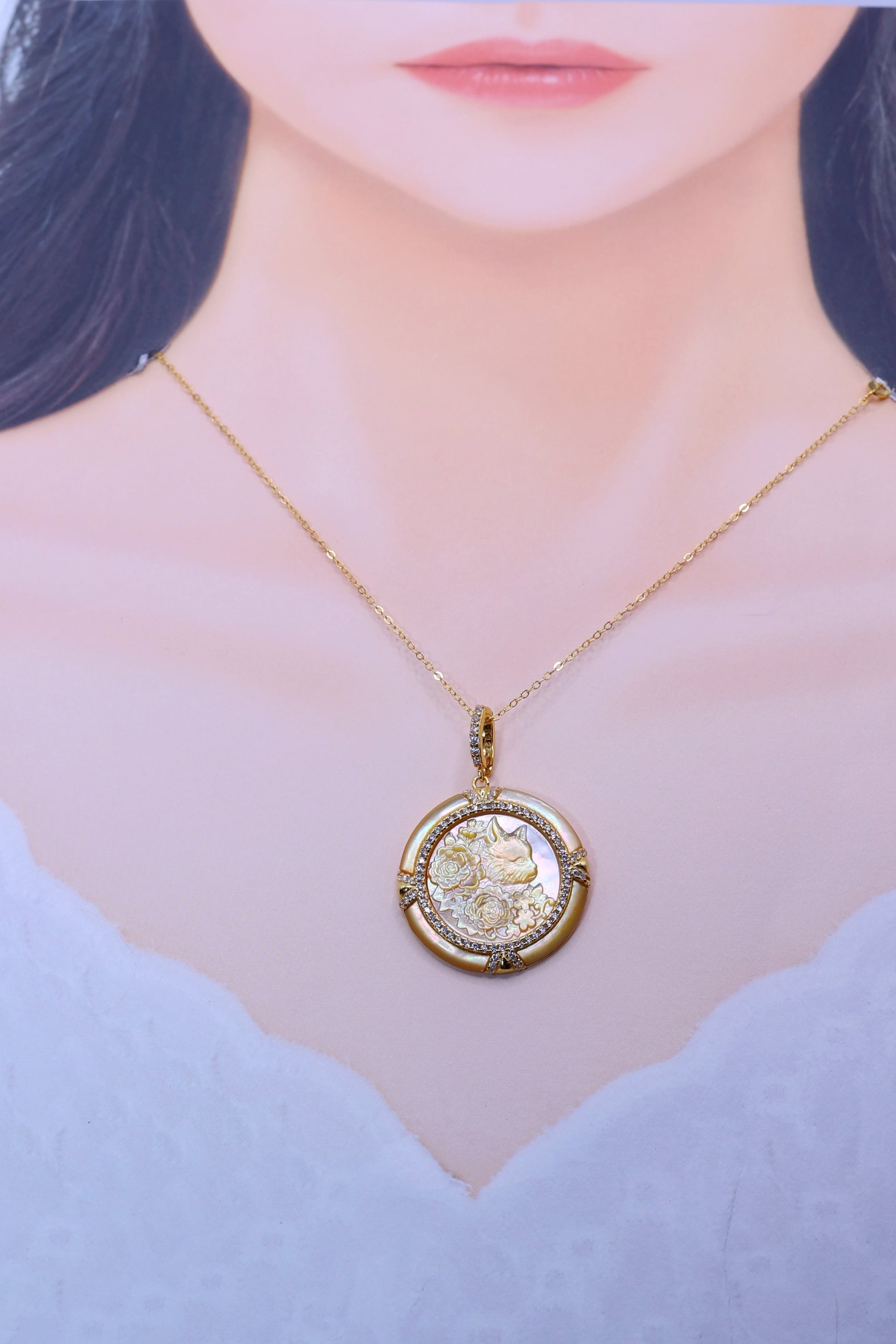 柔らかな黄金色の干渉光を湛えた金蝶貝に、気品ある猫の横顔と花々を繊細に彫刻した、華やかで優雅なペンダント。