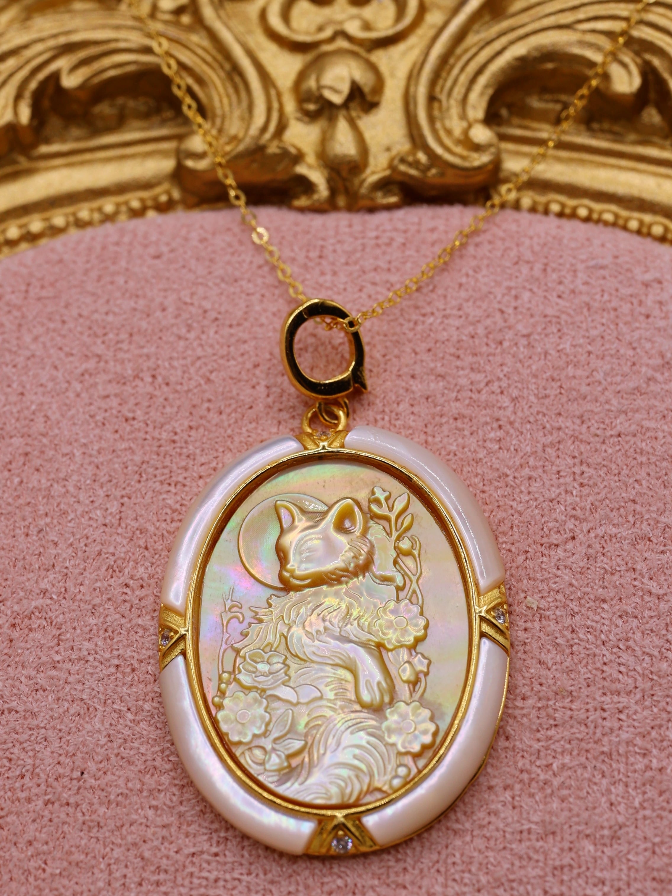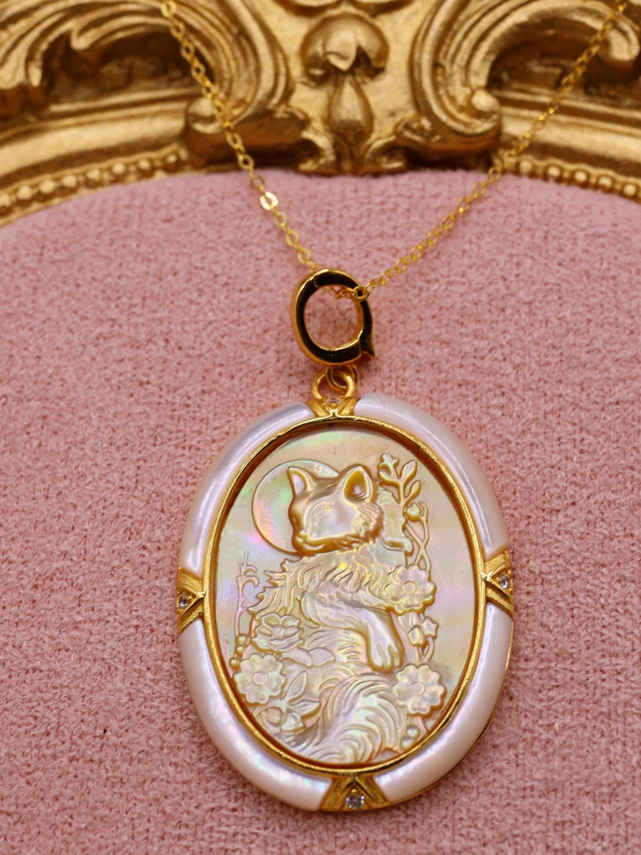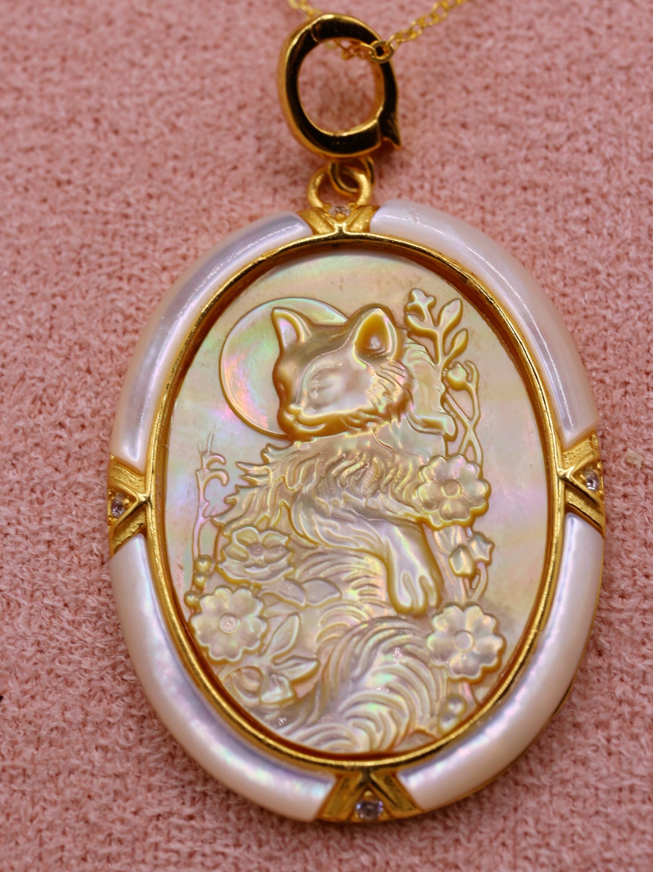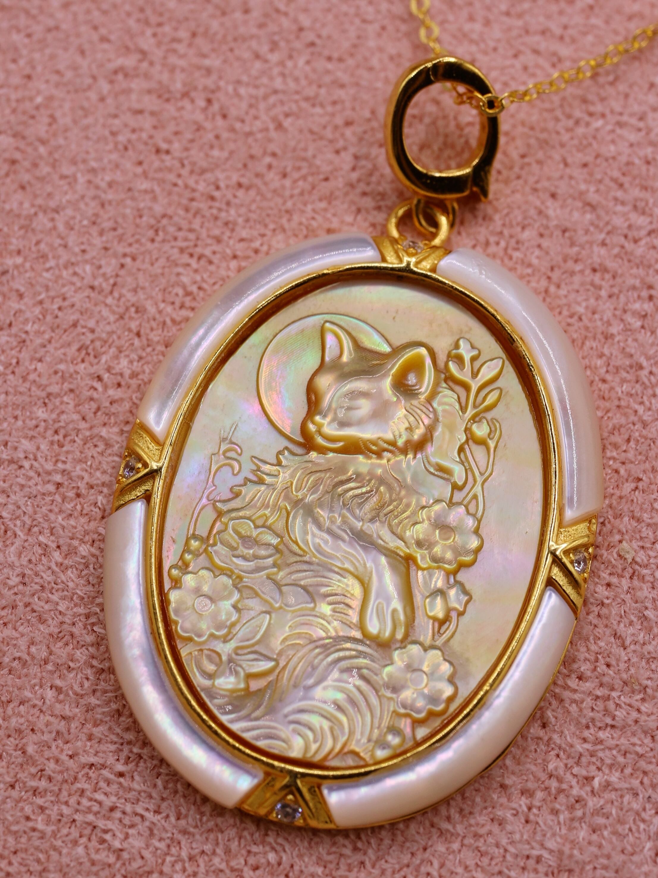 柔らかな黄金色の光を帯びた金蝶貝に、優雅に佇む猫の姿を繊細に彫刻した、気品あふれるジュエリー。