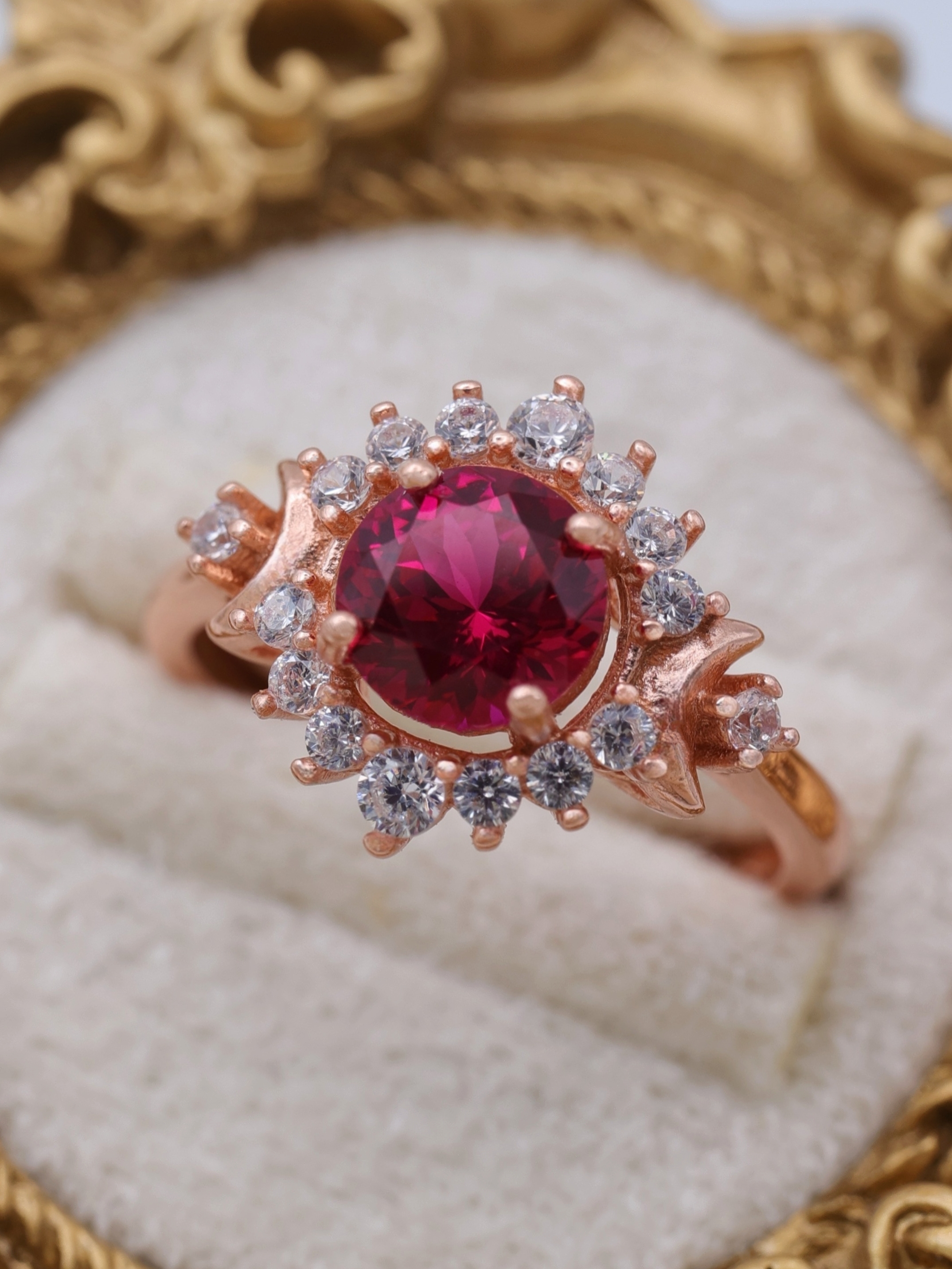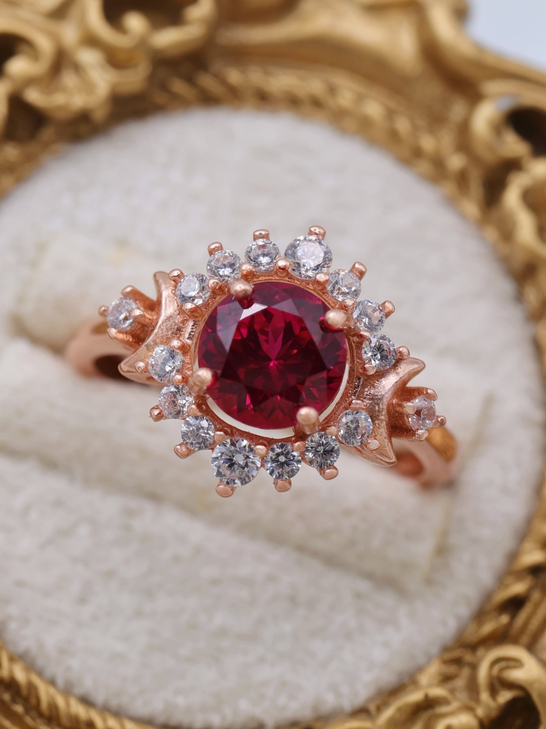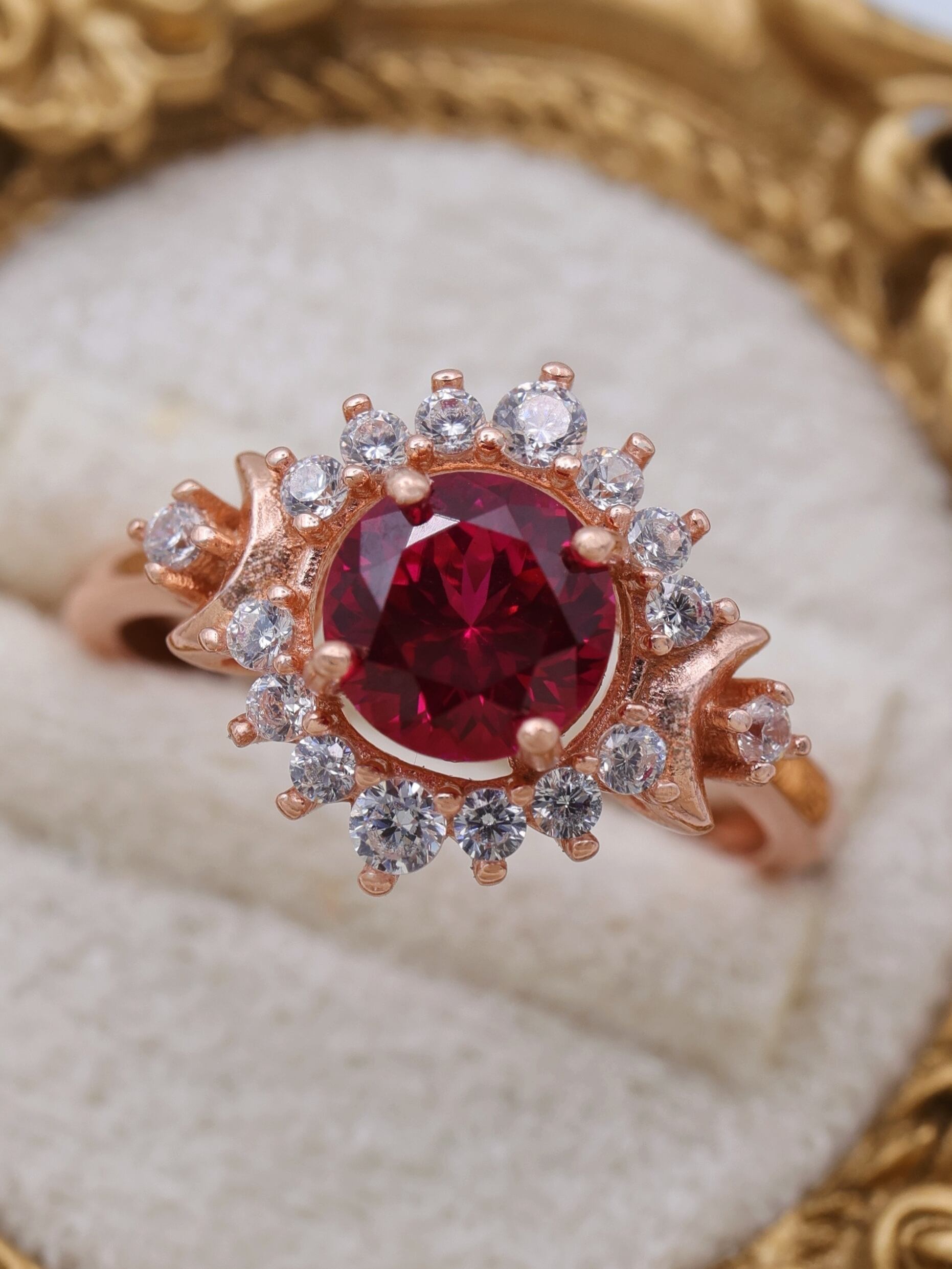 両サイドに配された新月と満月を象徴するモチーフが、中心のルビーを優しく包み込み、