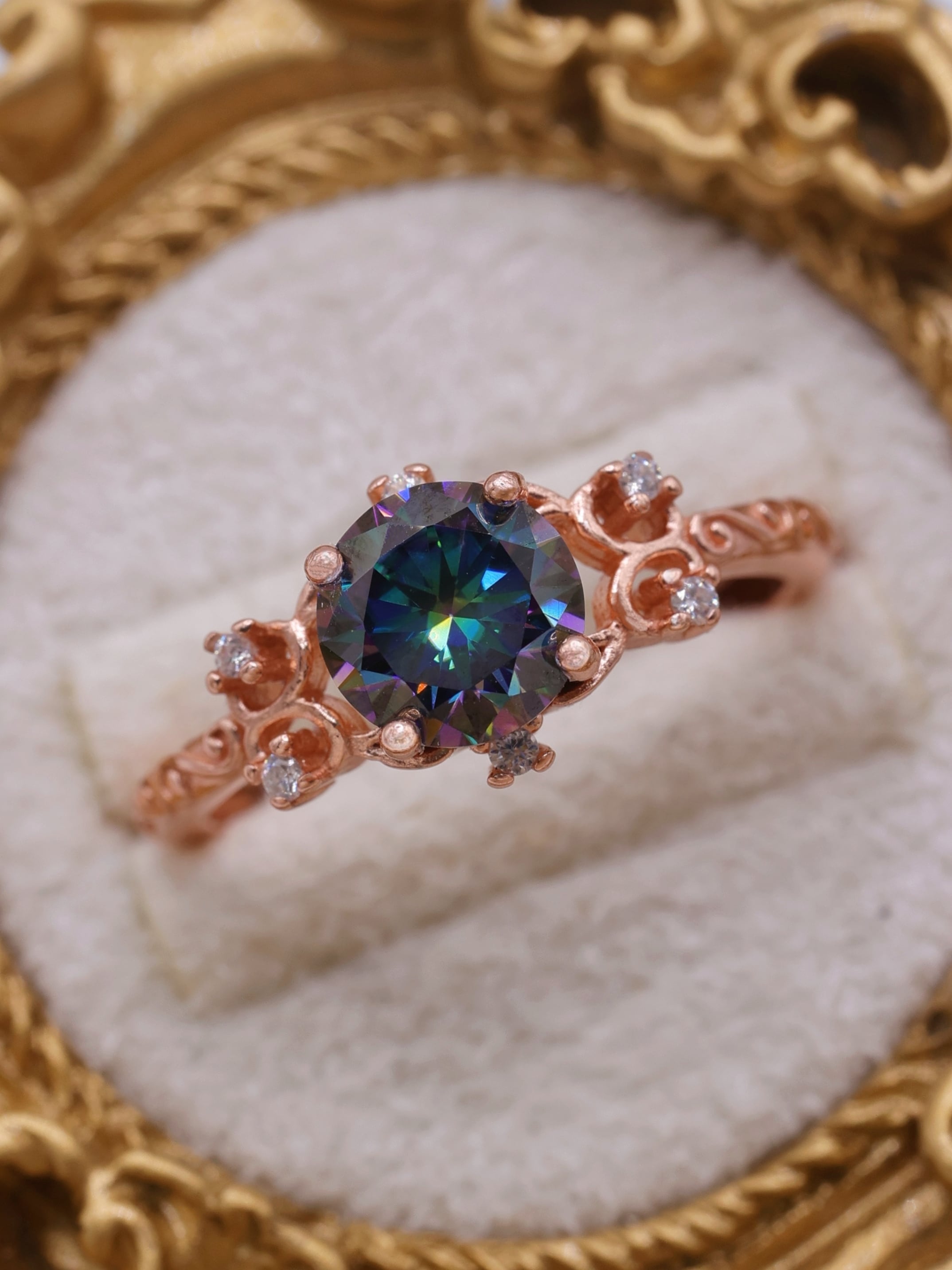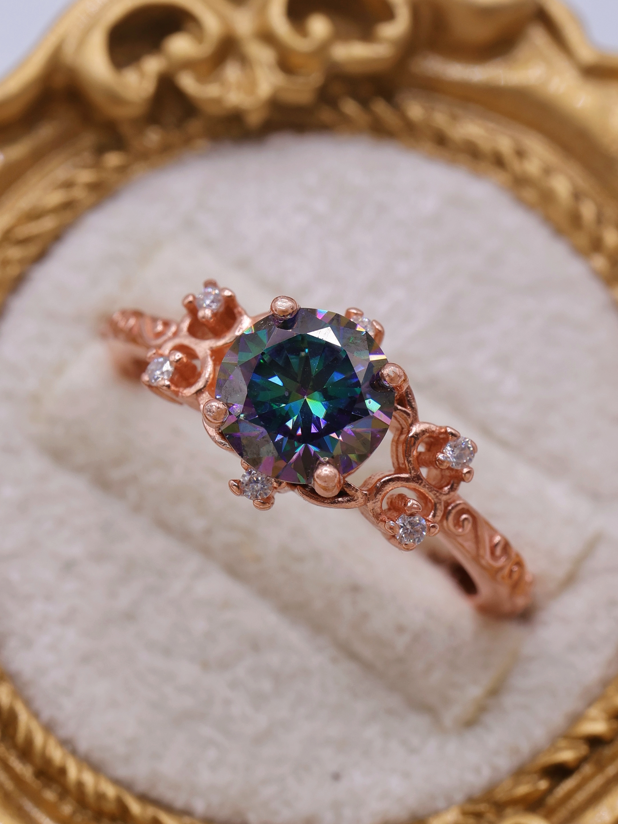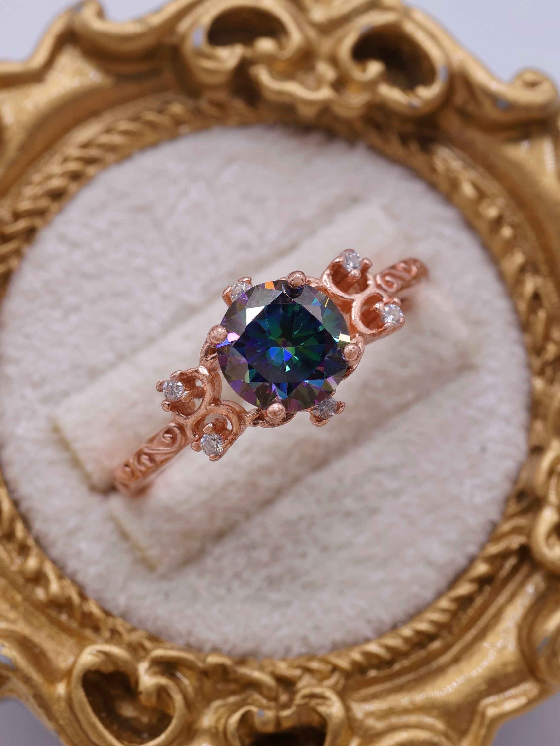落ち着いた金属の色味が、ミスティックブラックモアッサナイトの奥深い輝きを引き立てます。