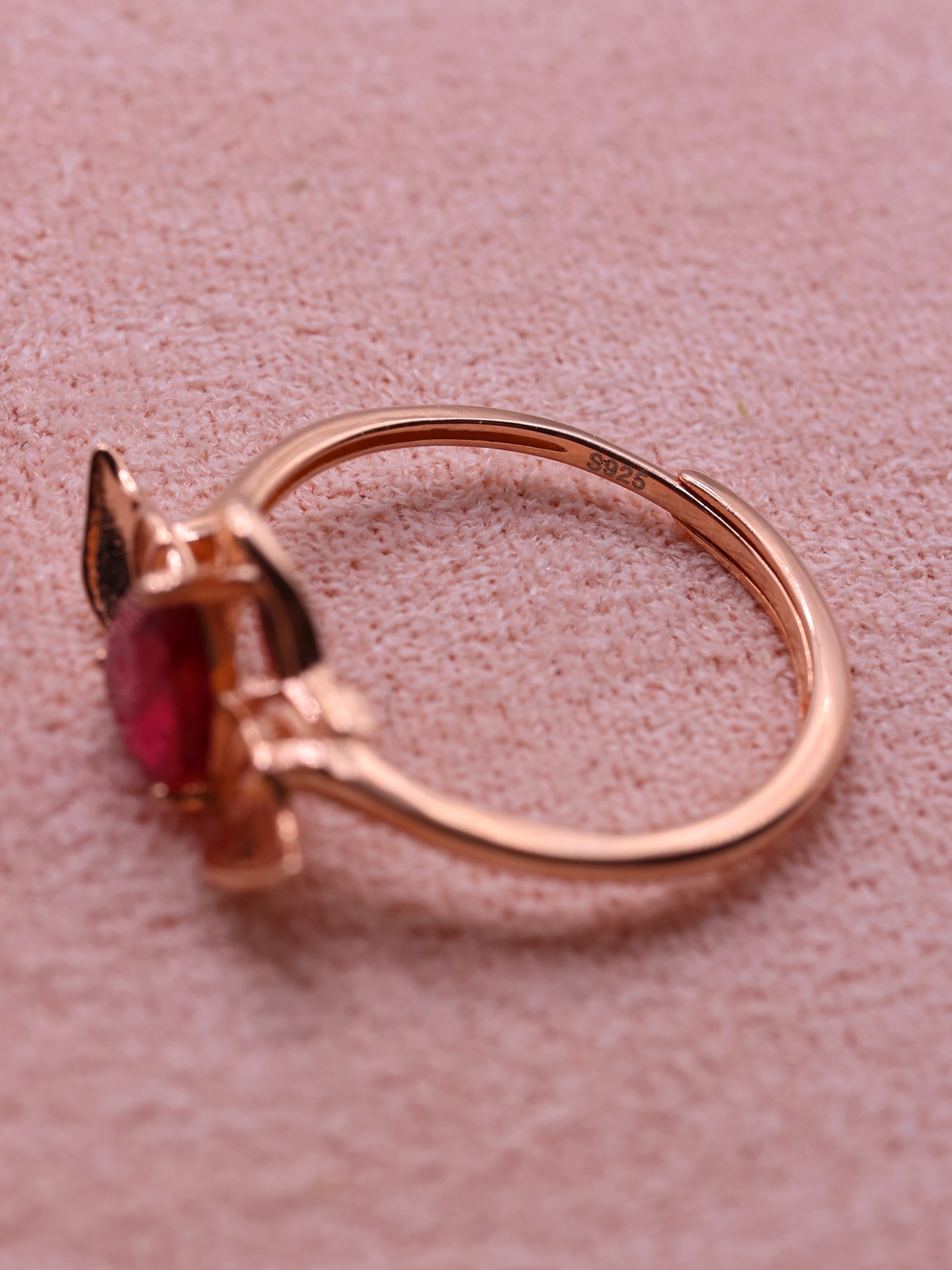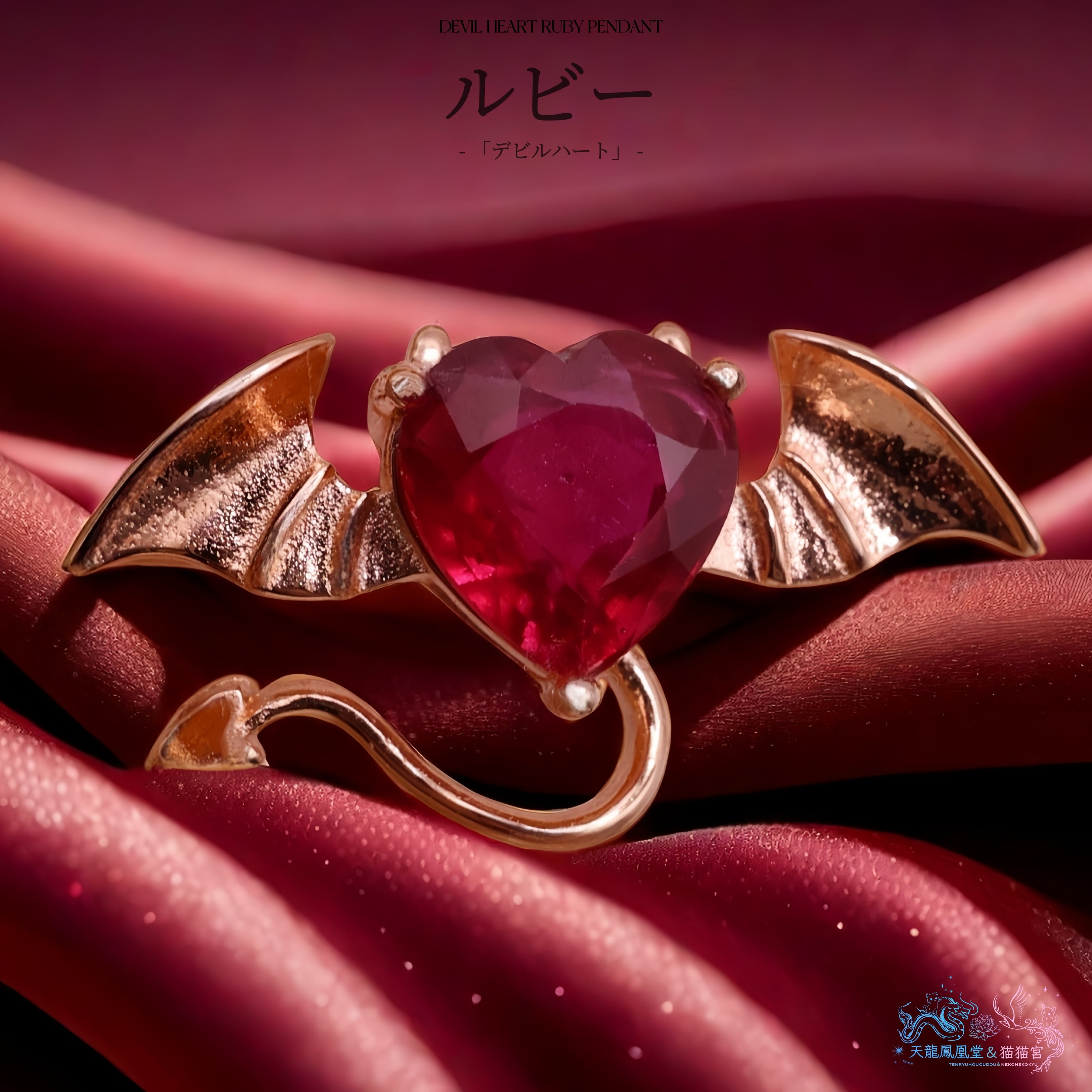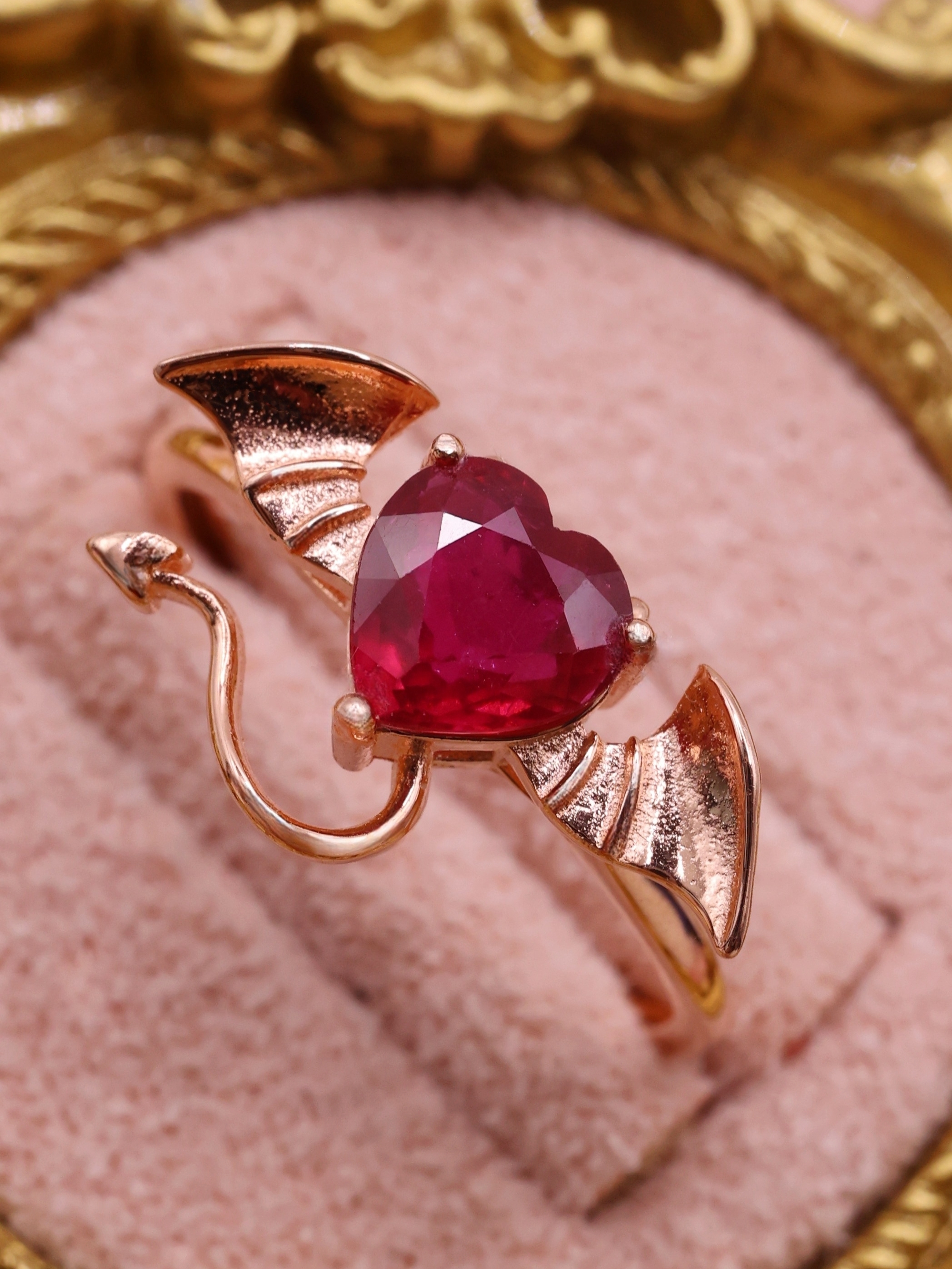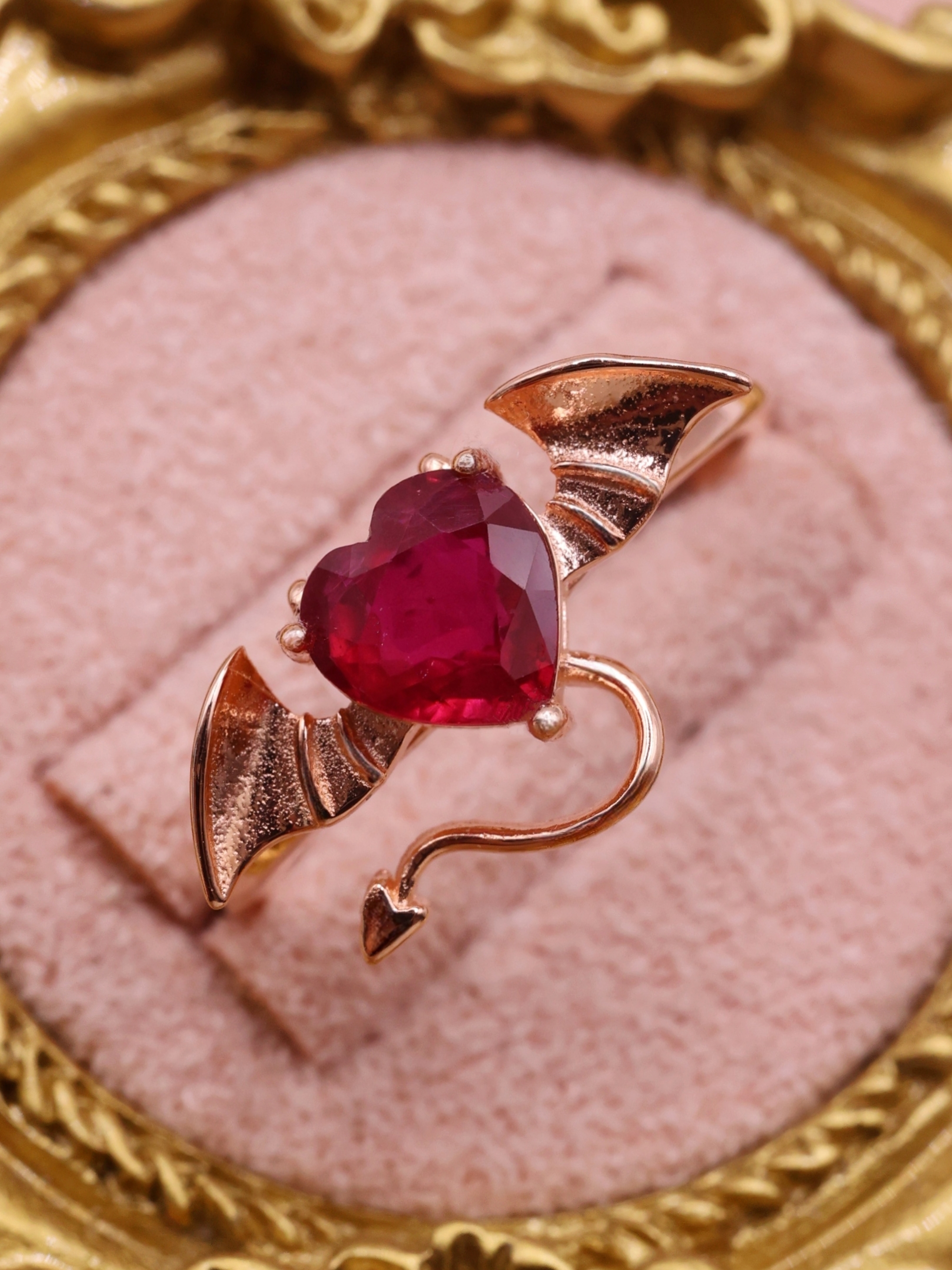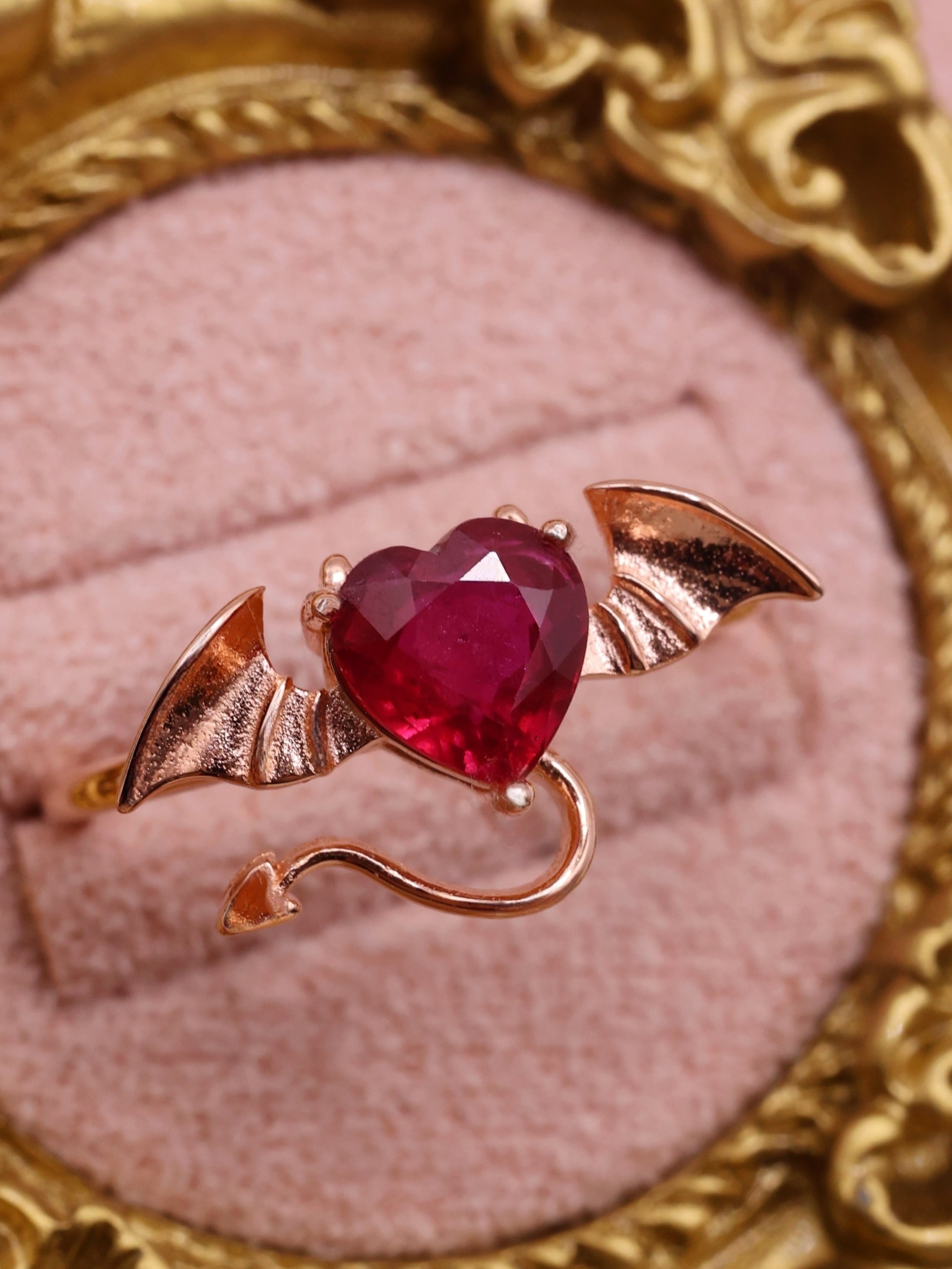 6mm・ハートシェイプカットの含浸ルビーを主役に、悪魔モチーフで仕立てたリングです。