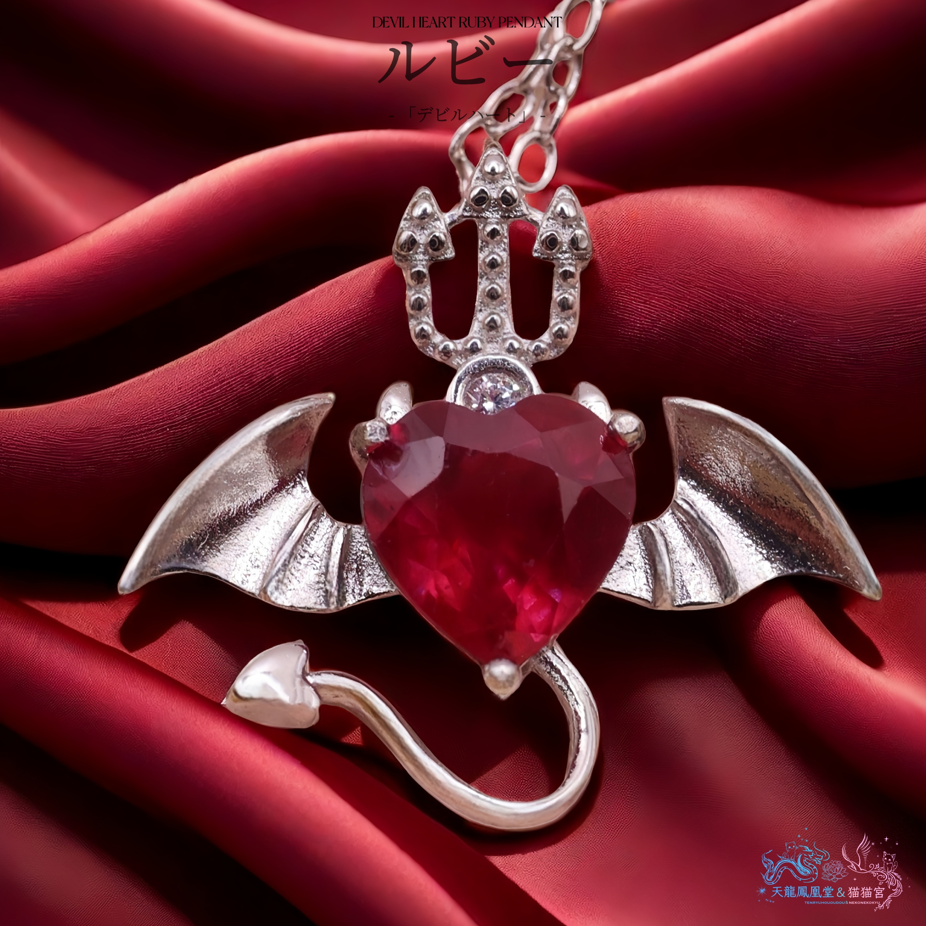6mm・ハートシェイプカットの含浸ルビーを主役に、悪魔モチーフで仕立てたペンダントのロジウムカラーバージョンです。