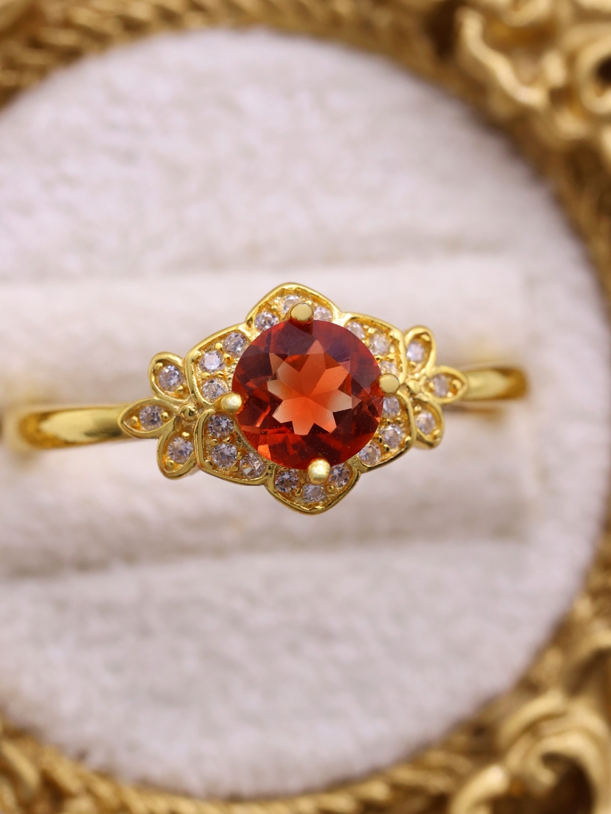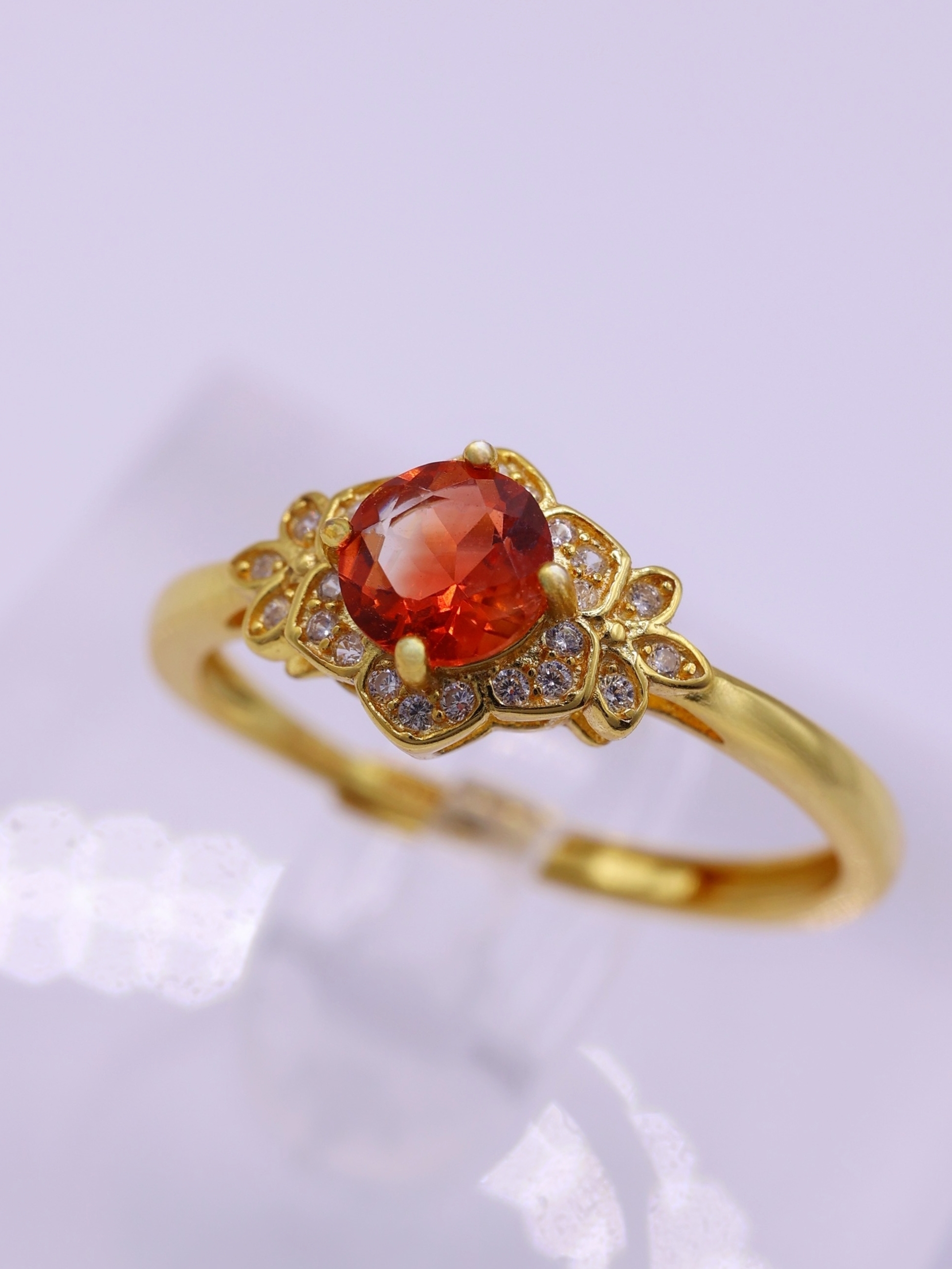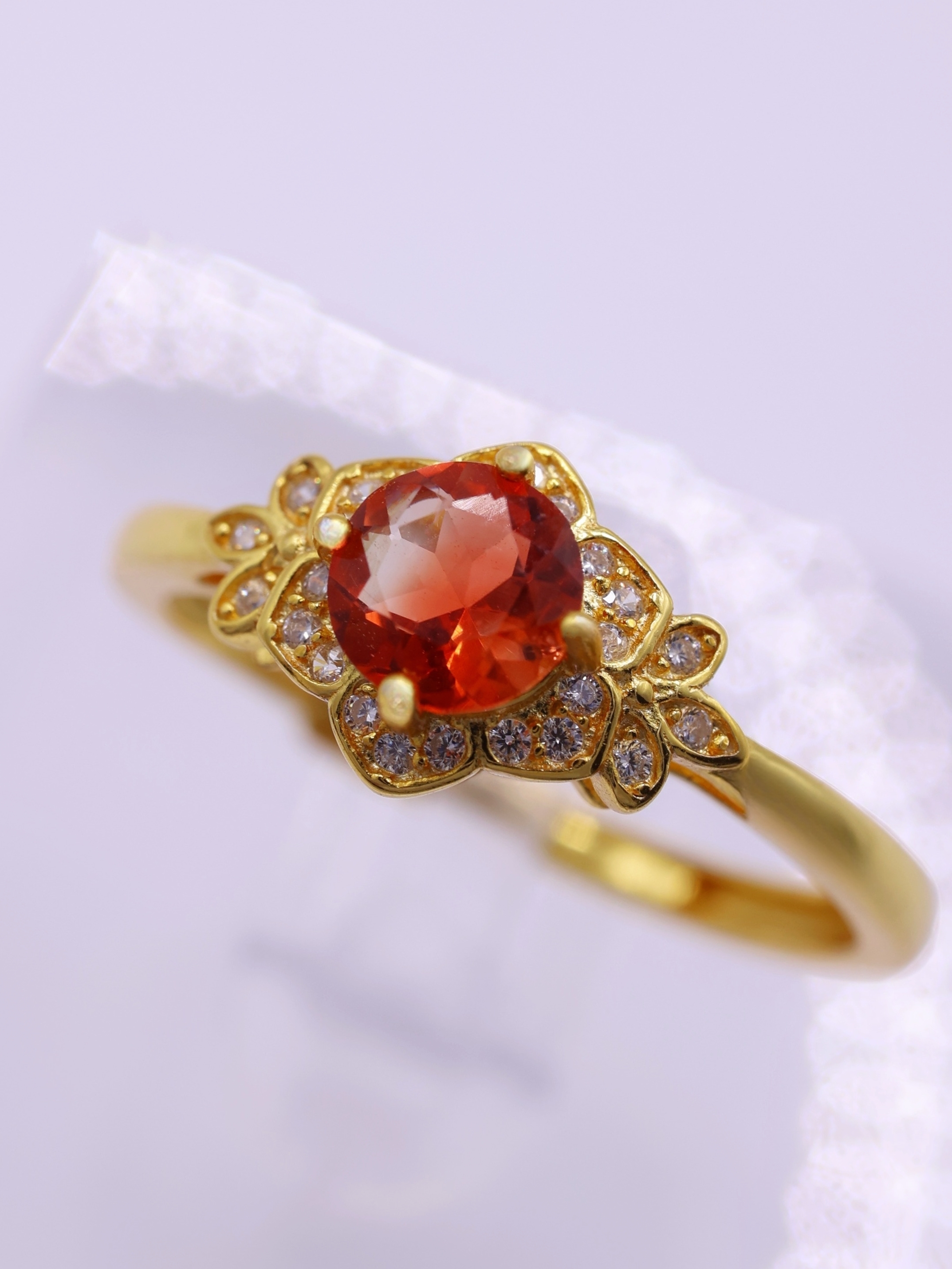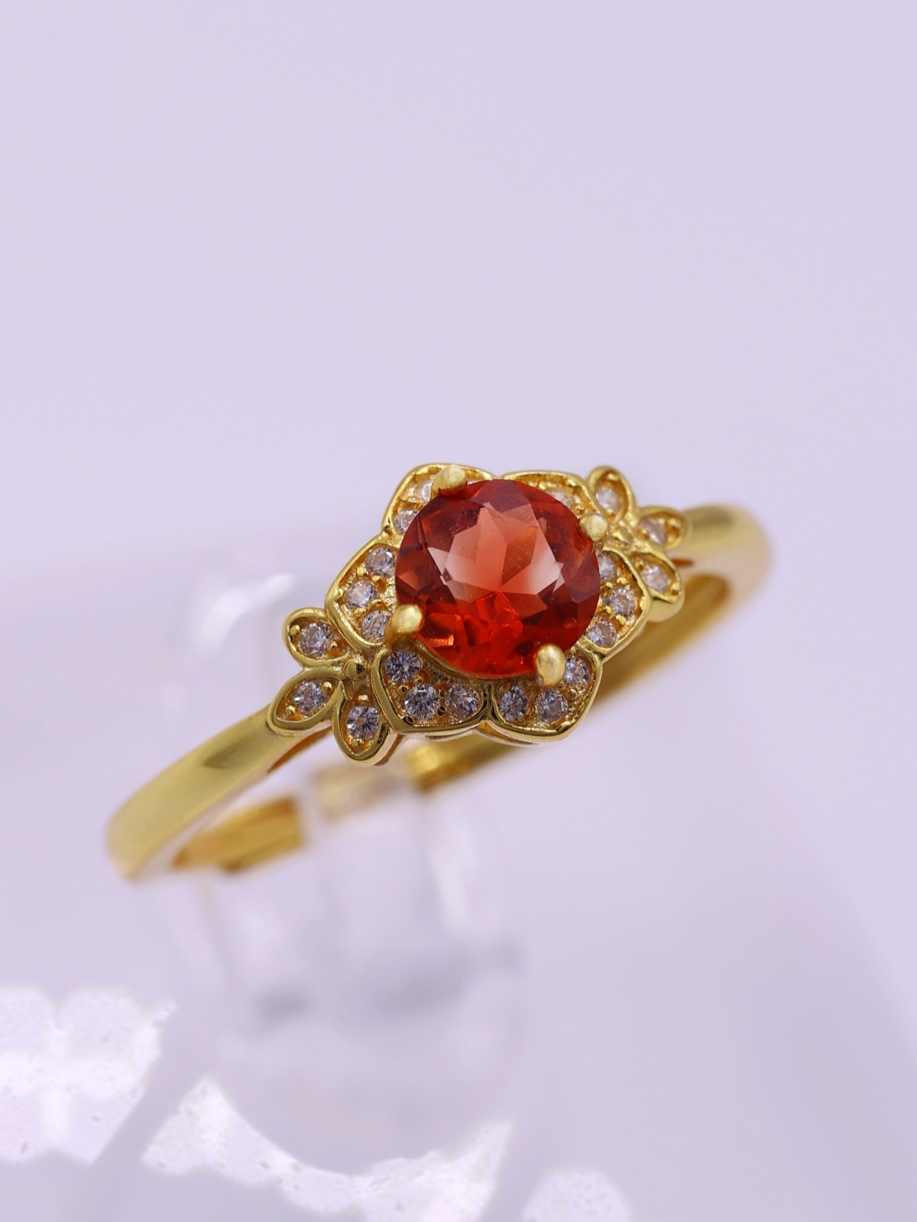 地金の反射光が石の内部に回り込み、赤みが中心に集まるような印象を与えます。