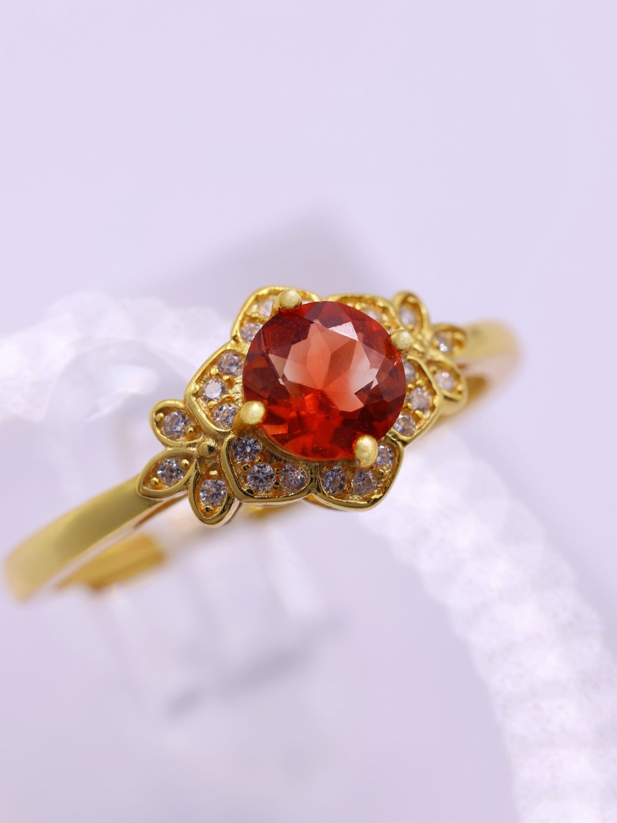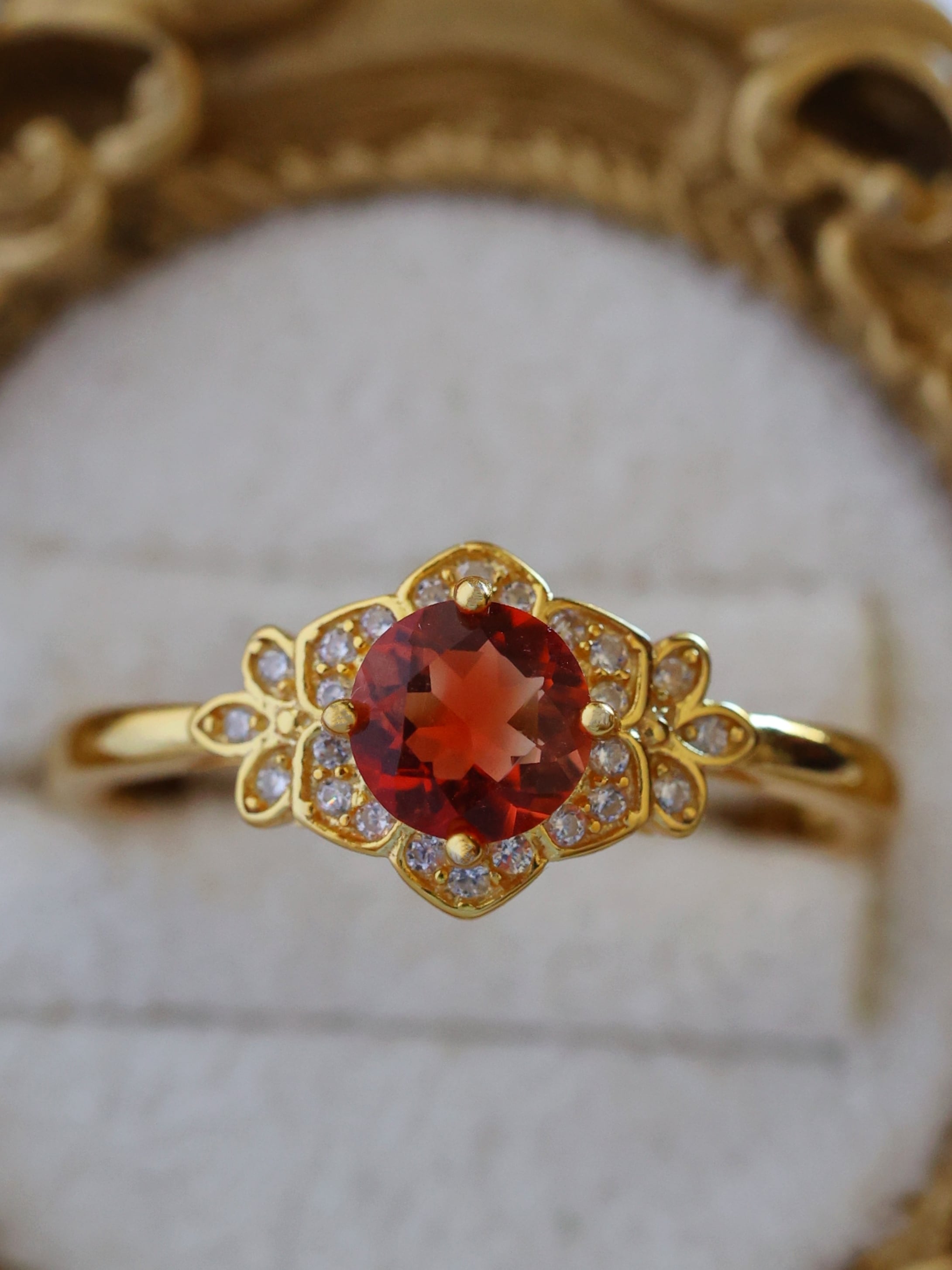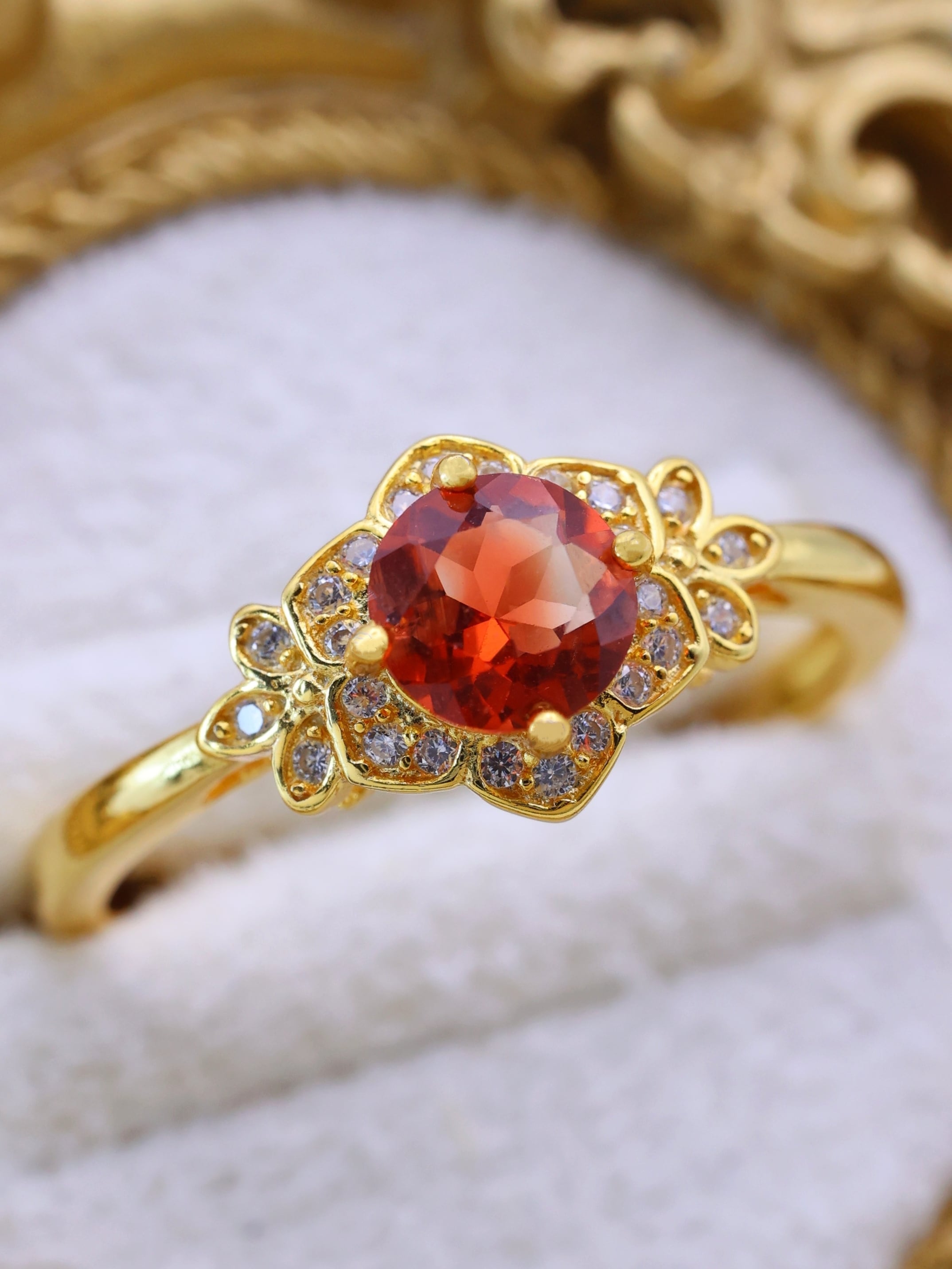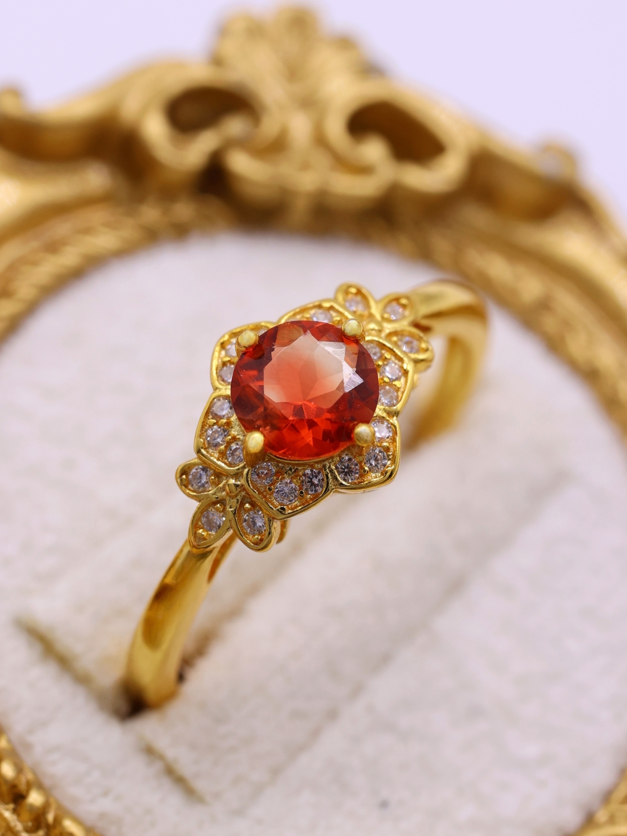 地金の反射光が石の内部に回り込み、赤みが中心に集まるような印象を与えます。