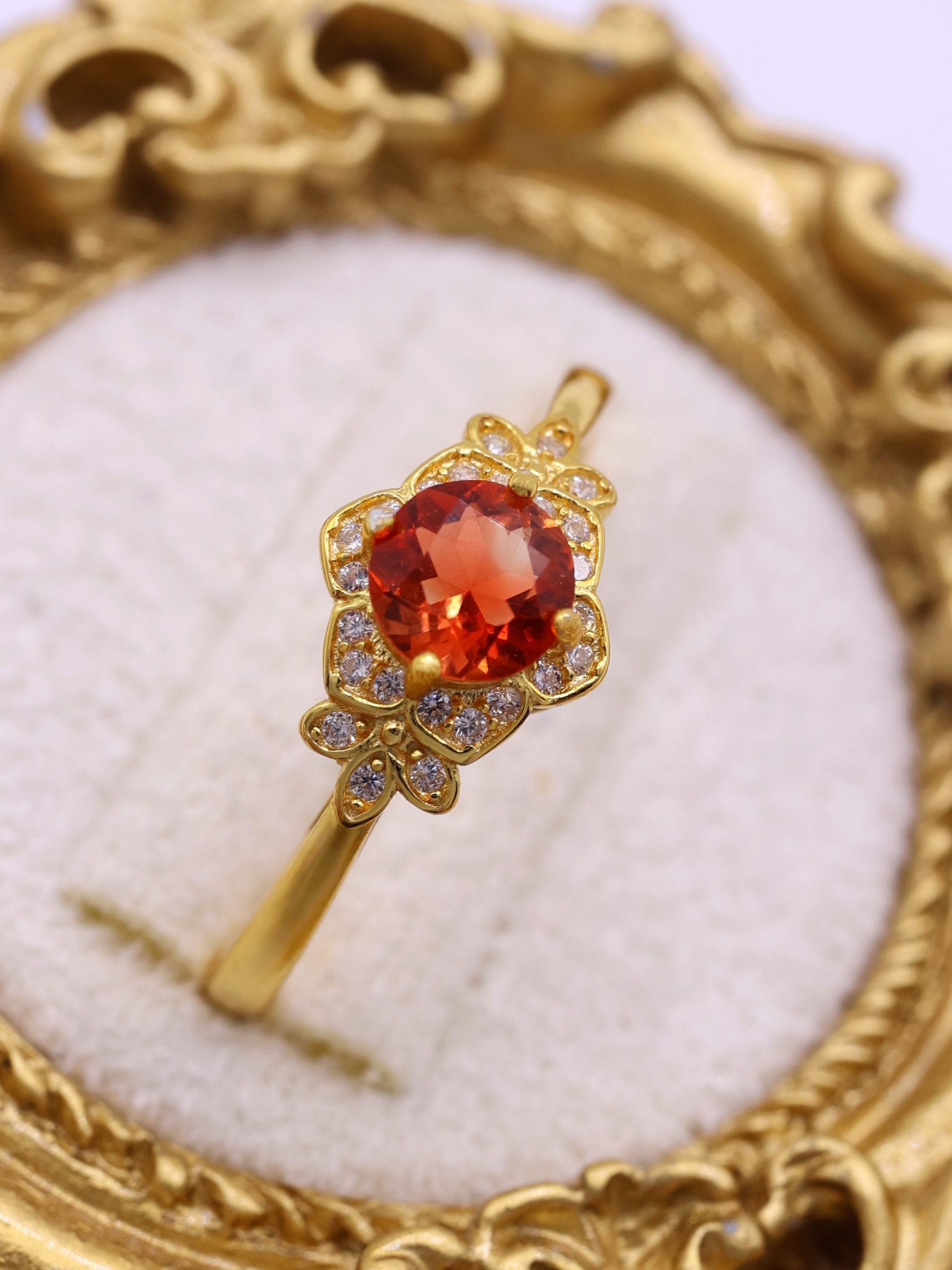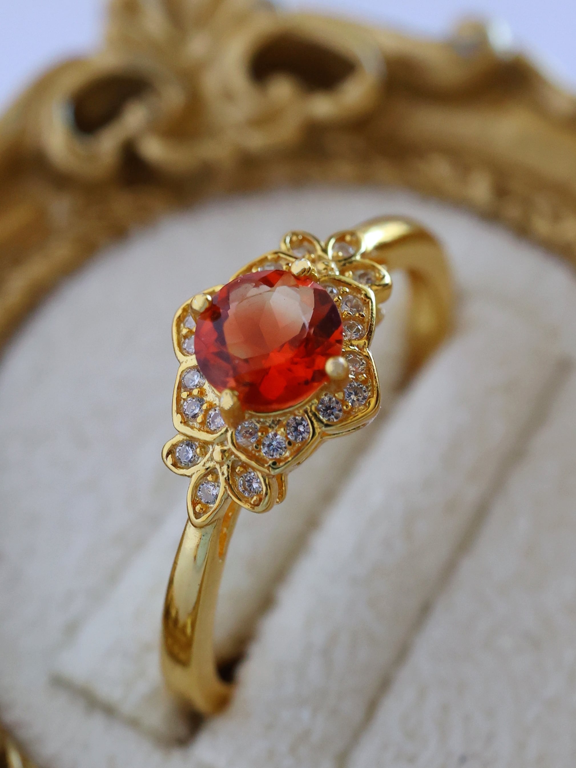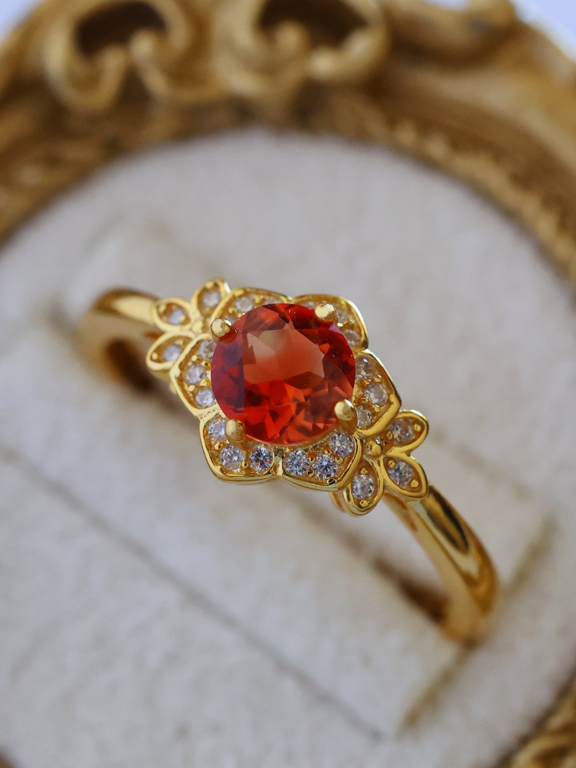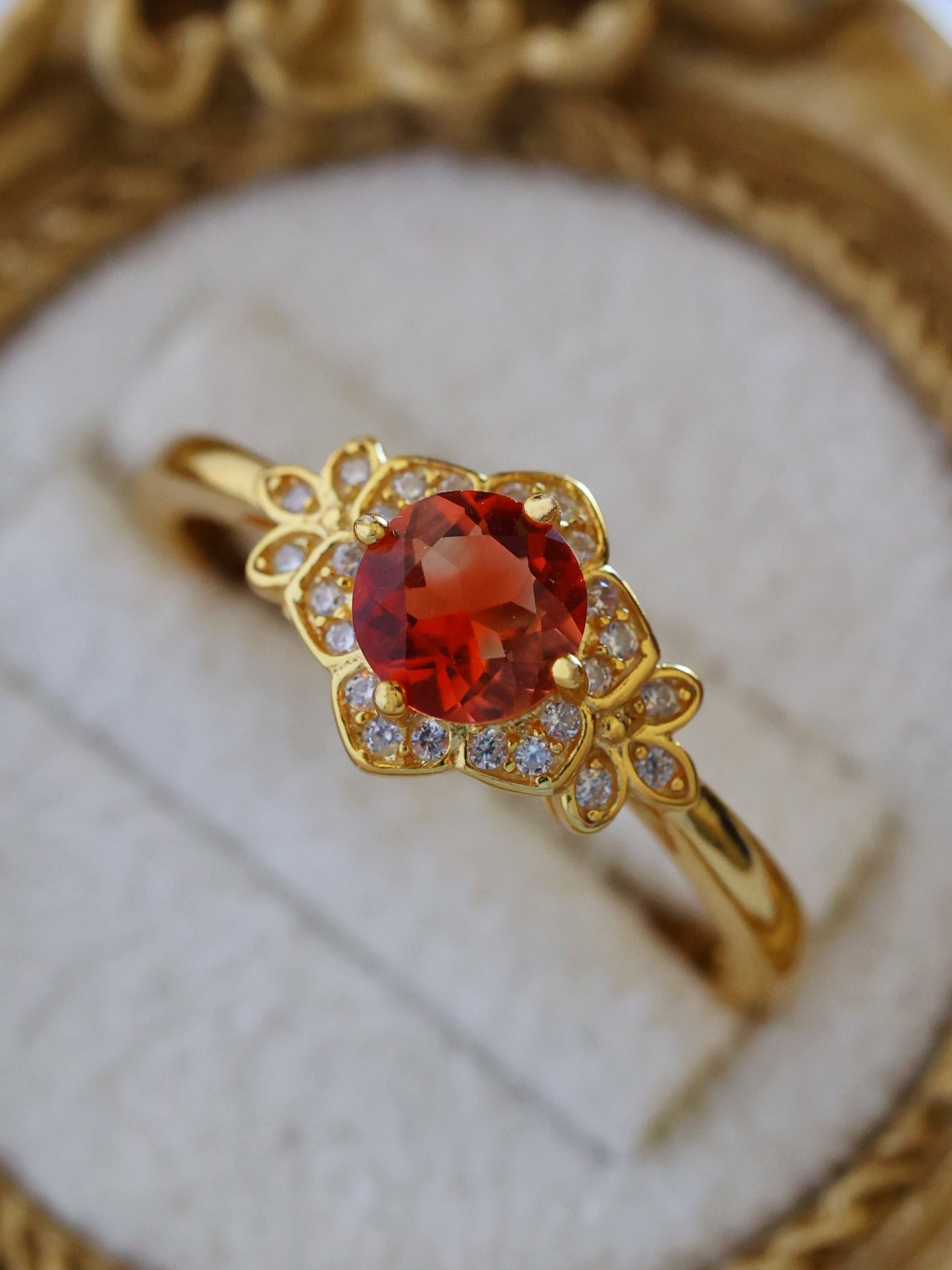 地金の反射光が石の内部に回り込み、赤みが中心に集まるような印象を与えます。