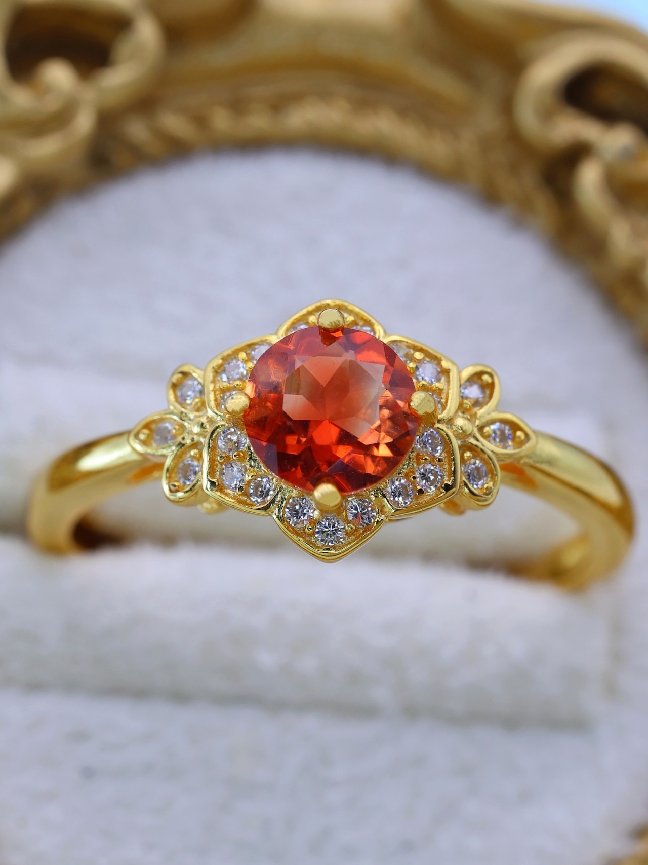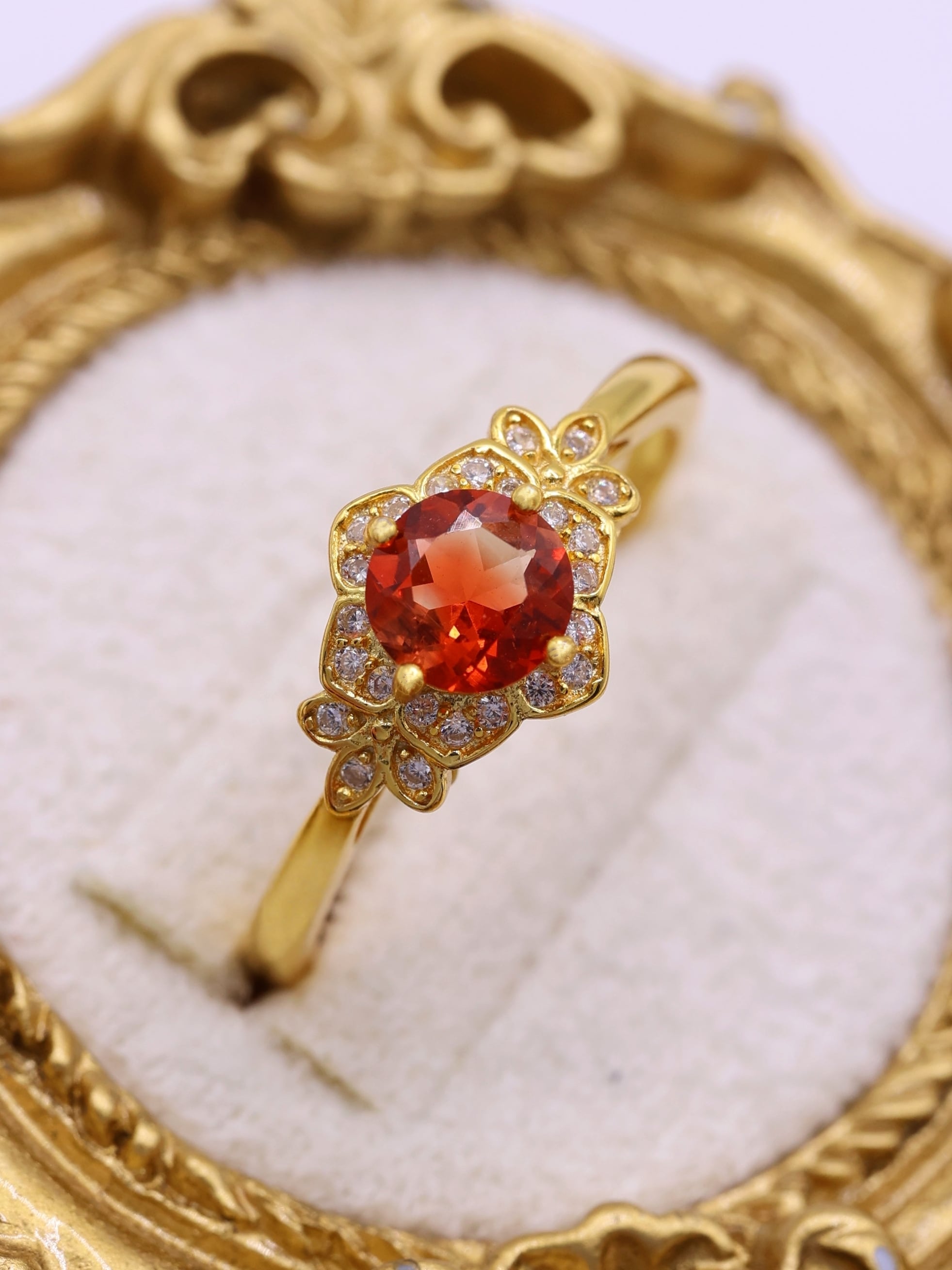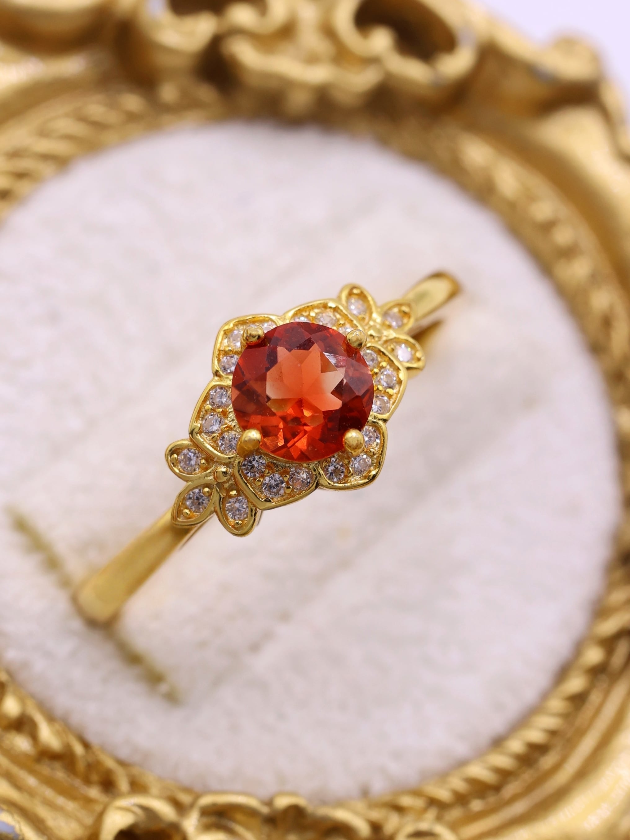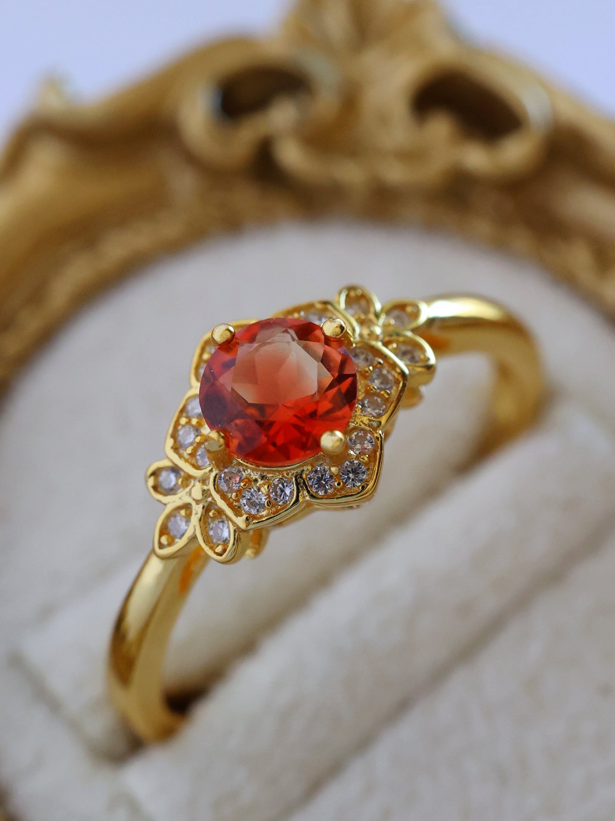 地金の反射光が石の内部に回り込み、赤みが中心に集まるような印象を与えます。