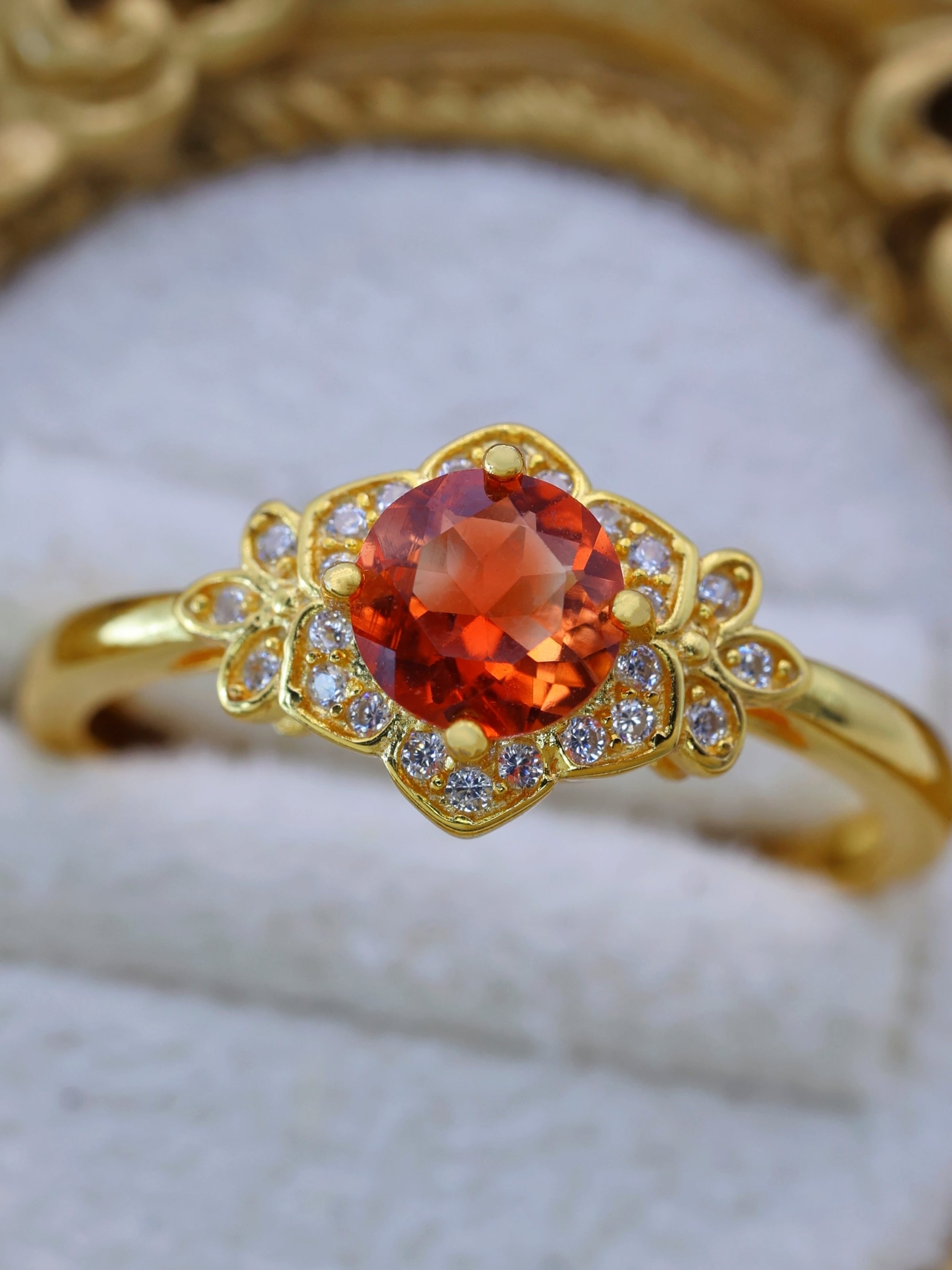 主石の周囲には高品質ジルコニアを花弁のように配置し、可憐さとクラシカルな雰囲気を両立させました。