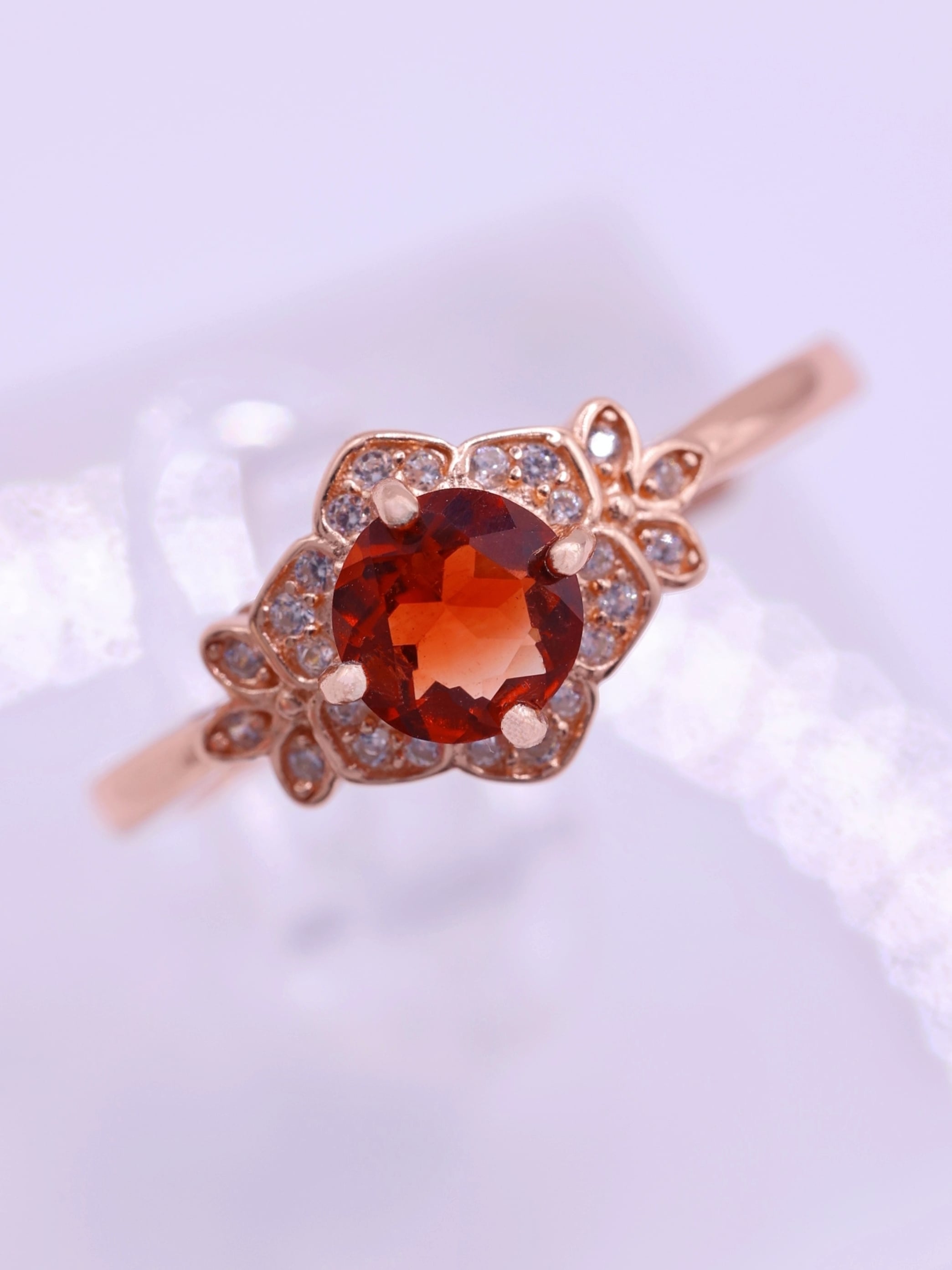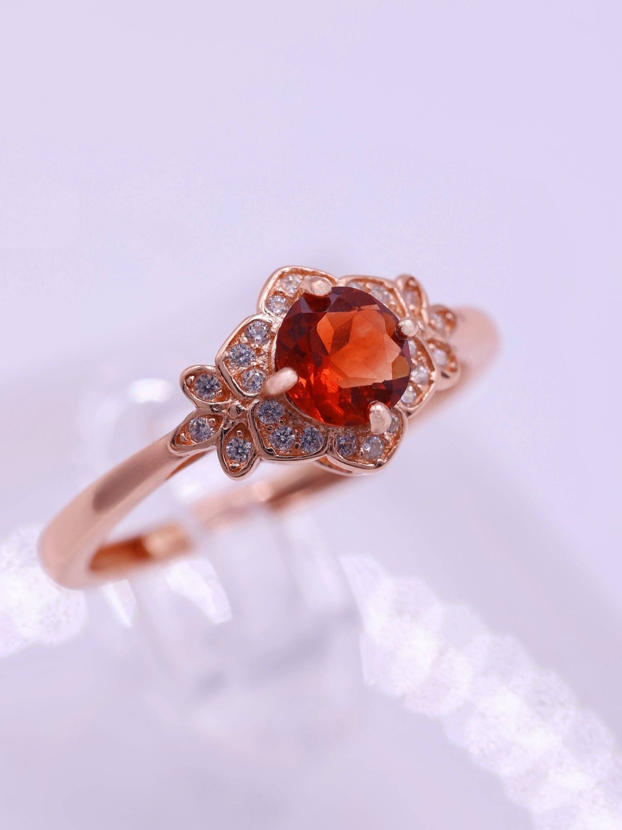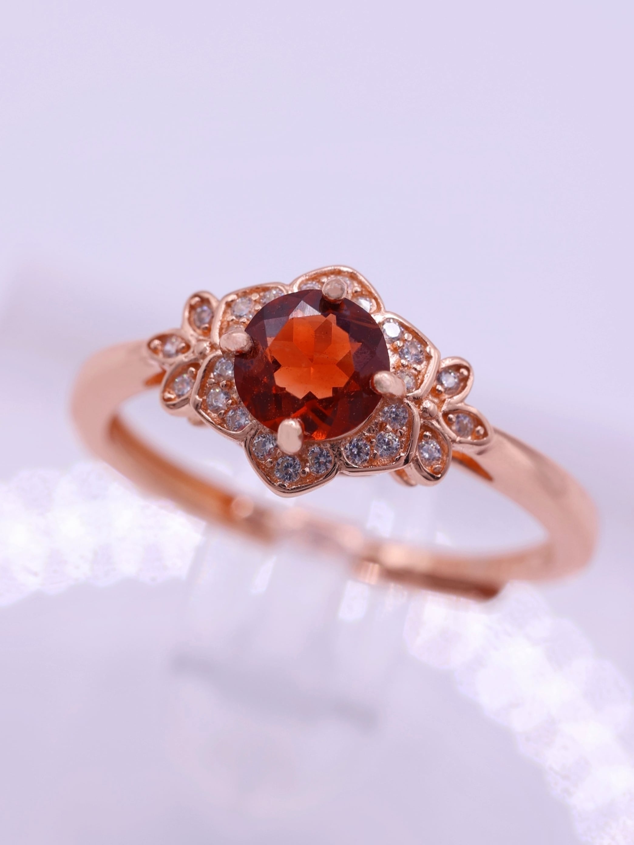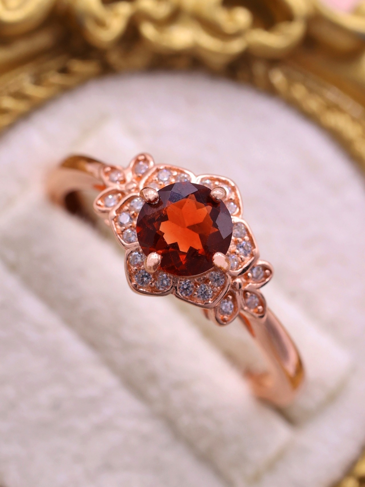 やわらかな赤みを帯びた地金が、石の赤やオレンジのニュアンスと自然に溶け合います。