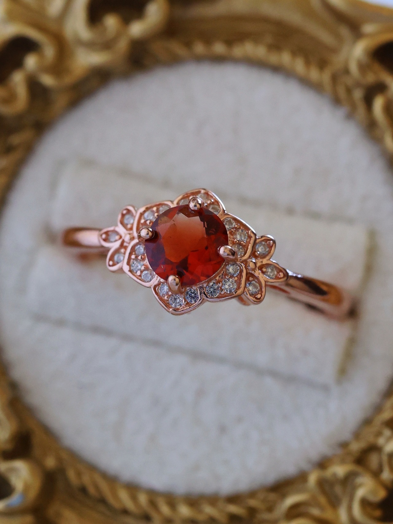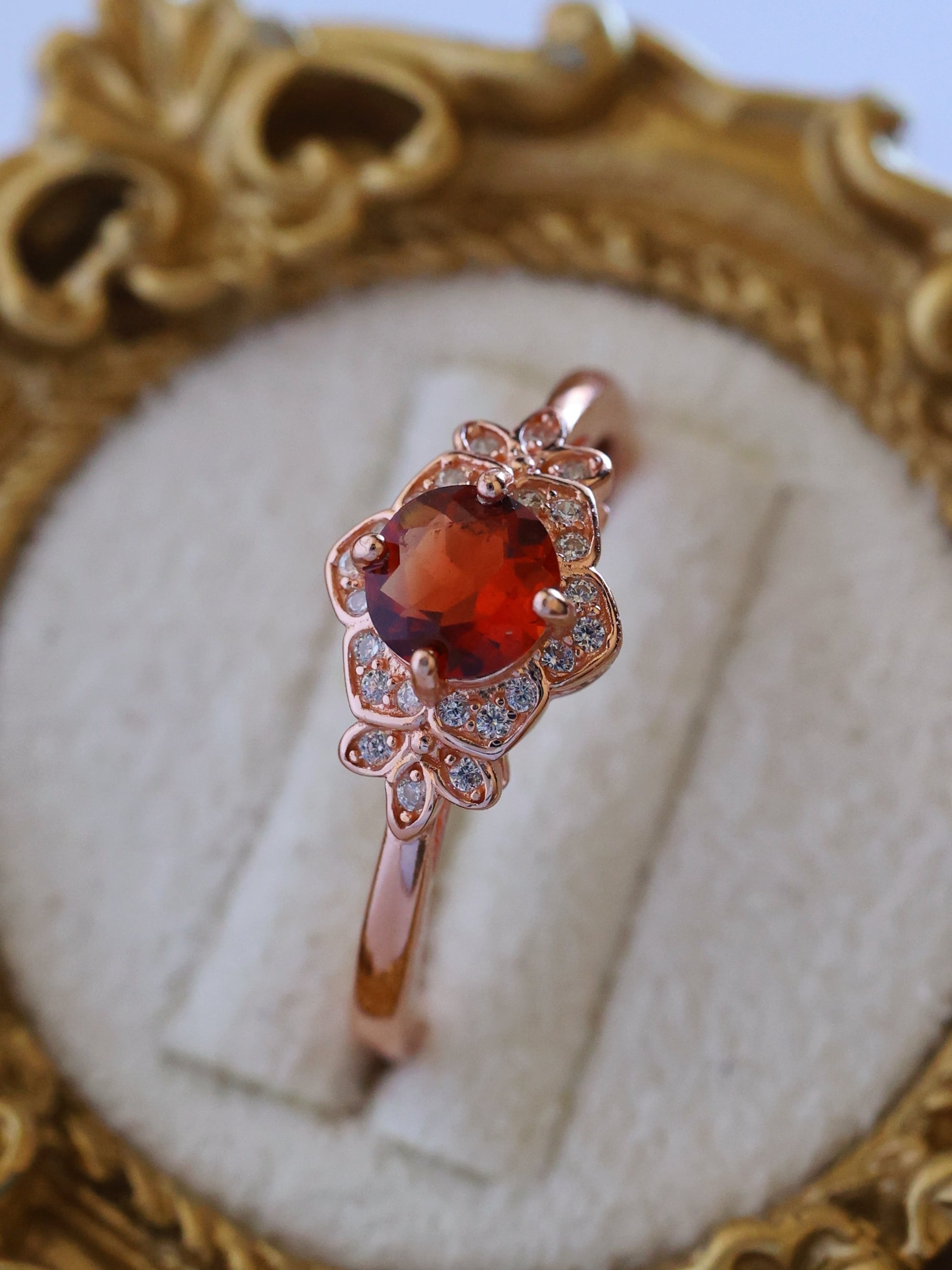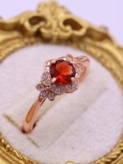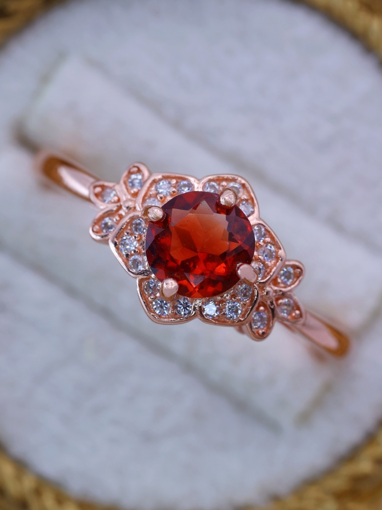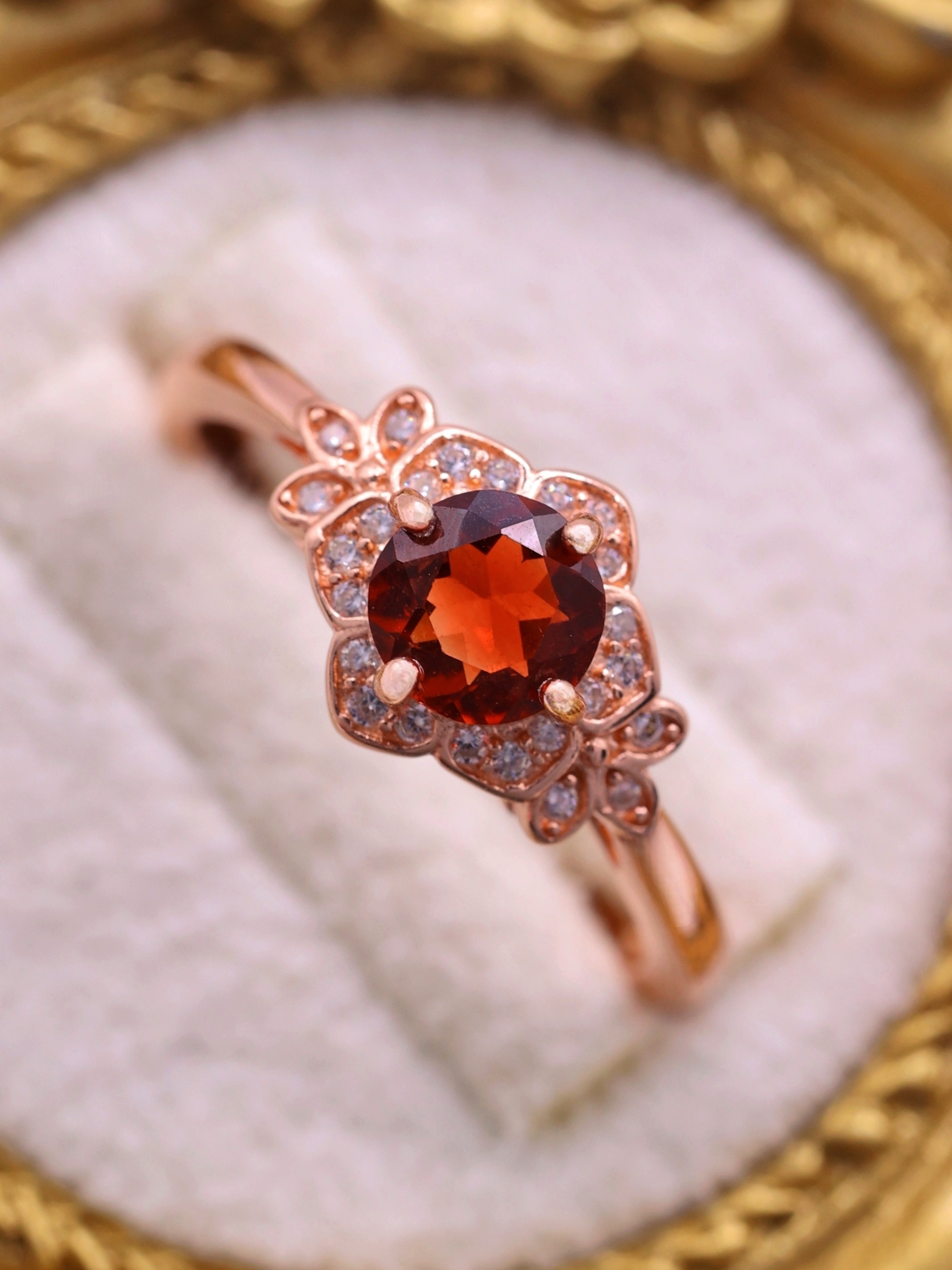 やわらかな赤みを帯びた地金が、石の赤やオレンジのニュアンスと自然に溶け合います。