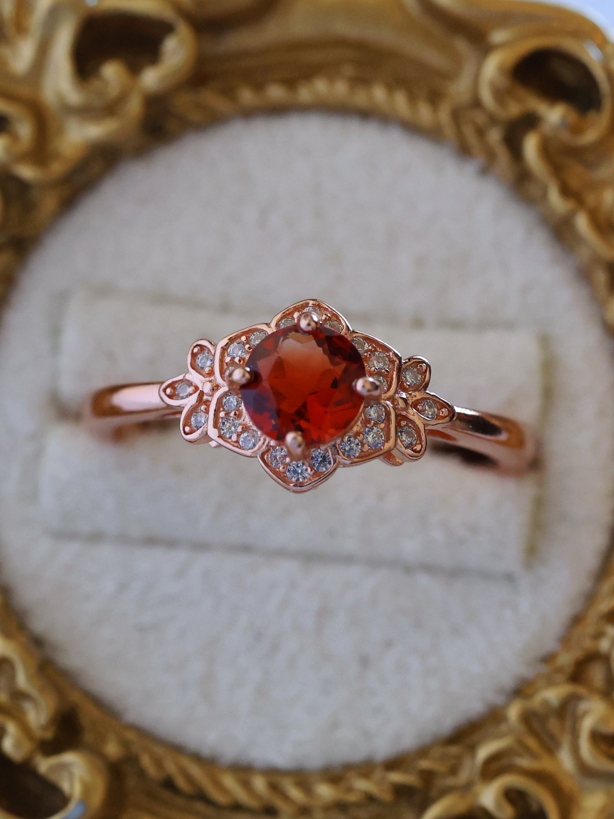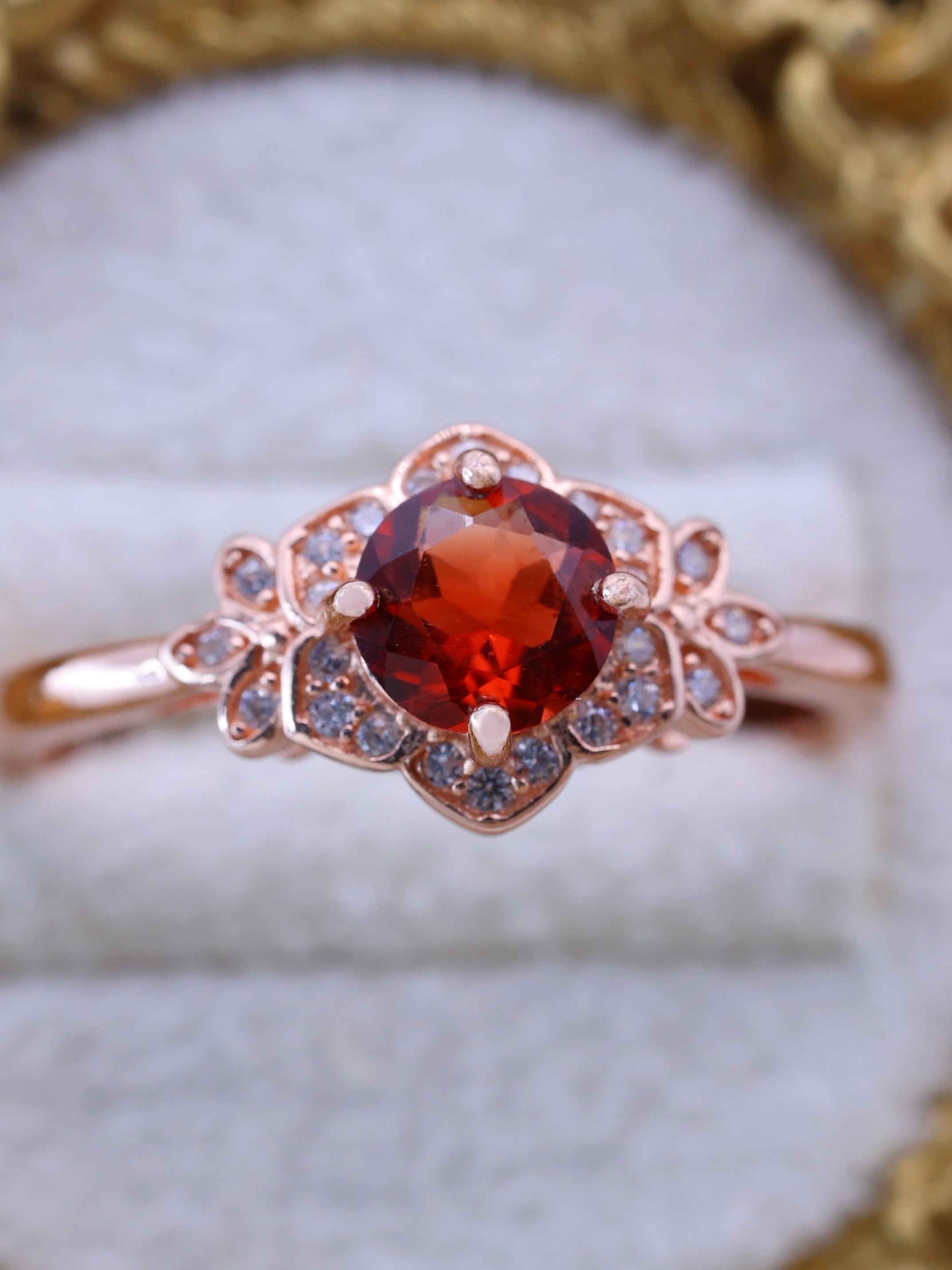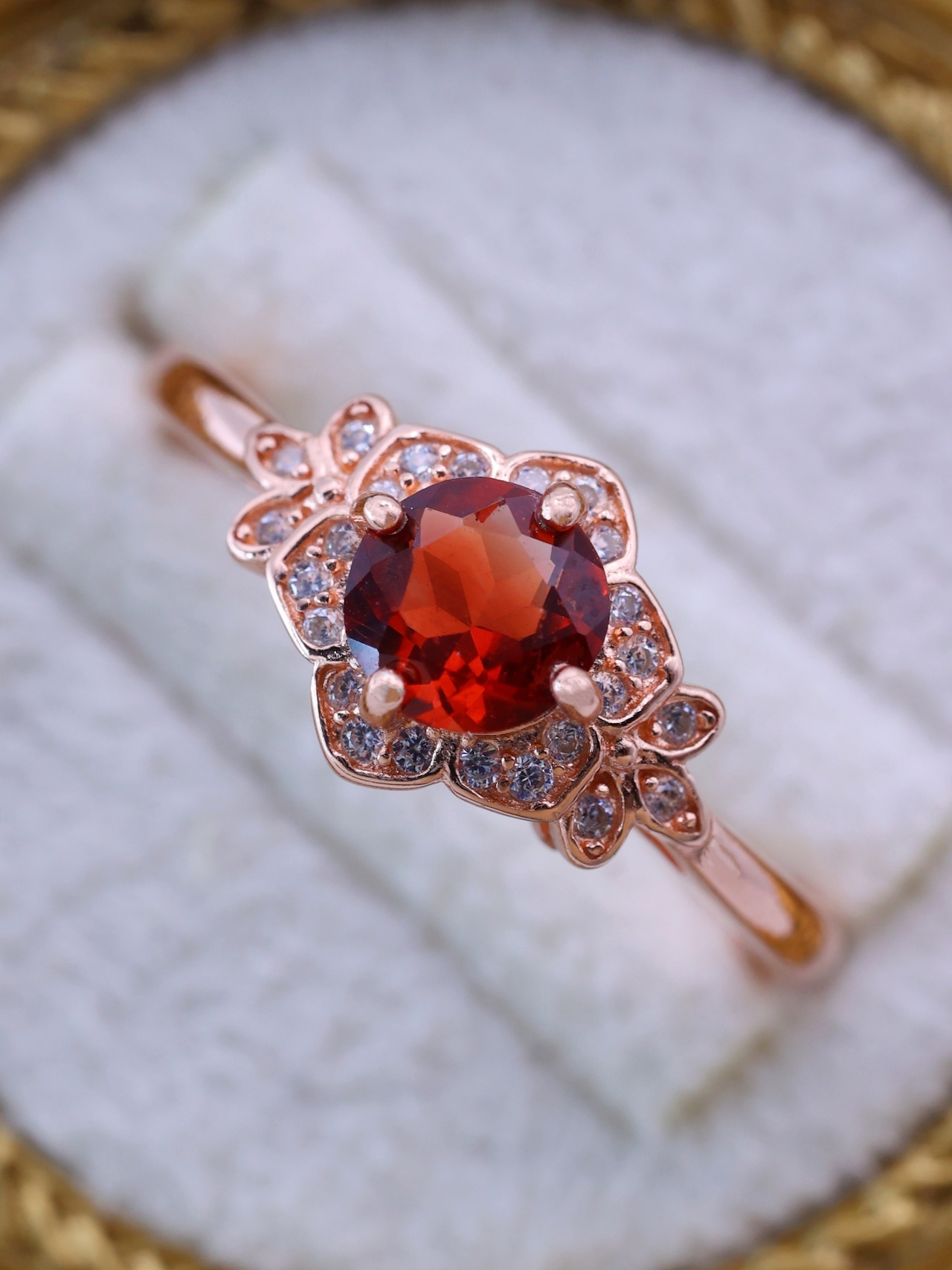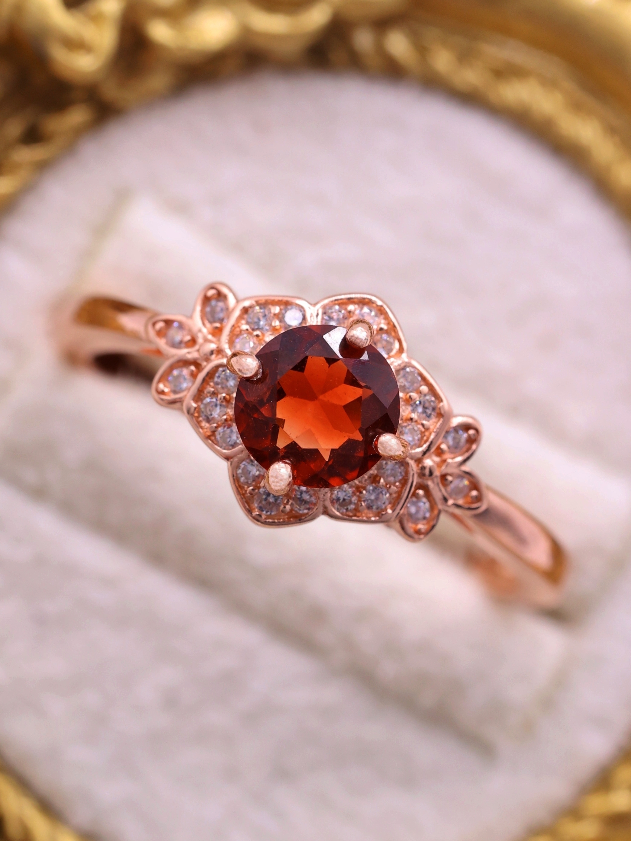 やわらかな赤みを帯びた地金が、石の赤やオレンジのニュアンスと自然に溶け合います。
