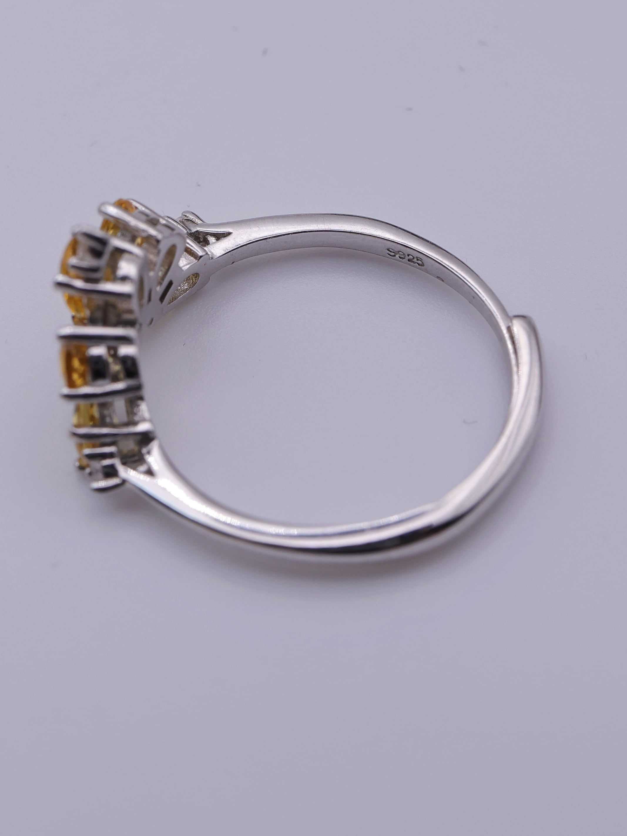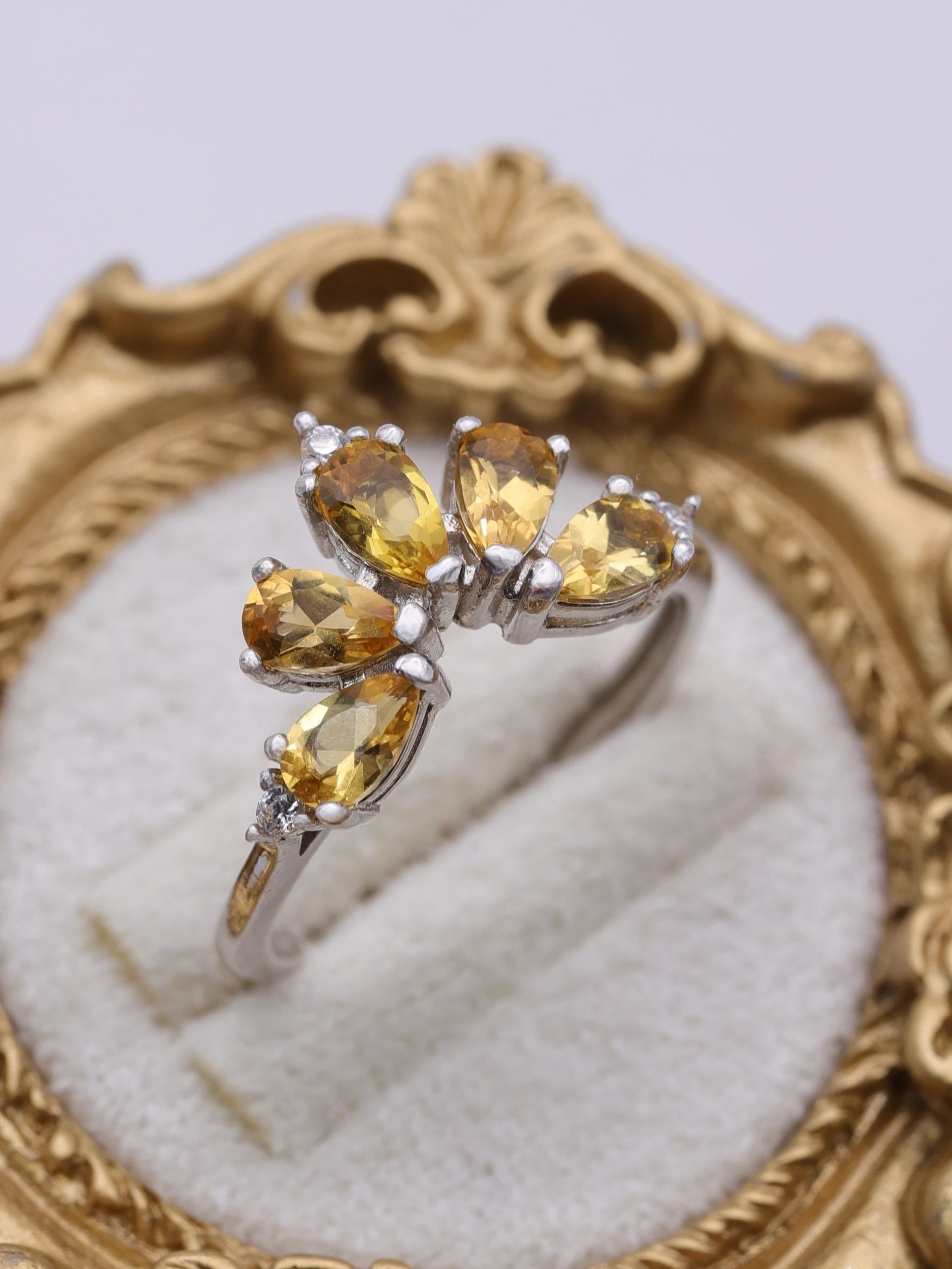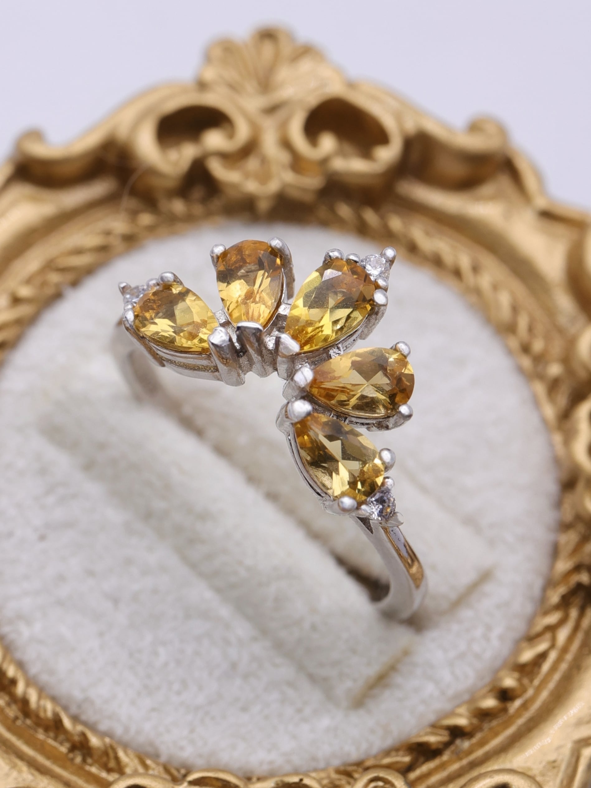 ペアシェイプにカットされた石を王冠のように配することで、光を受けるたびに花びらのように広がる輝きを描き出し、気品と華やぎを指先に添えます。シルバーカラーの地金が黄金の輝きを際立たせ、まるで朝日がきらめく王冠のような佇まいに。
