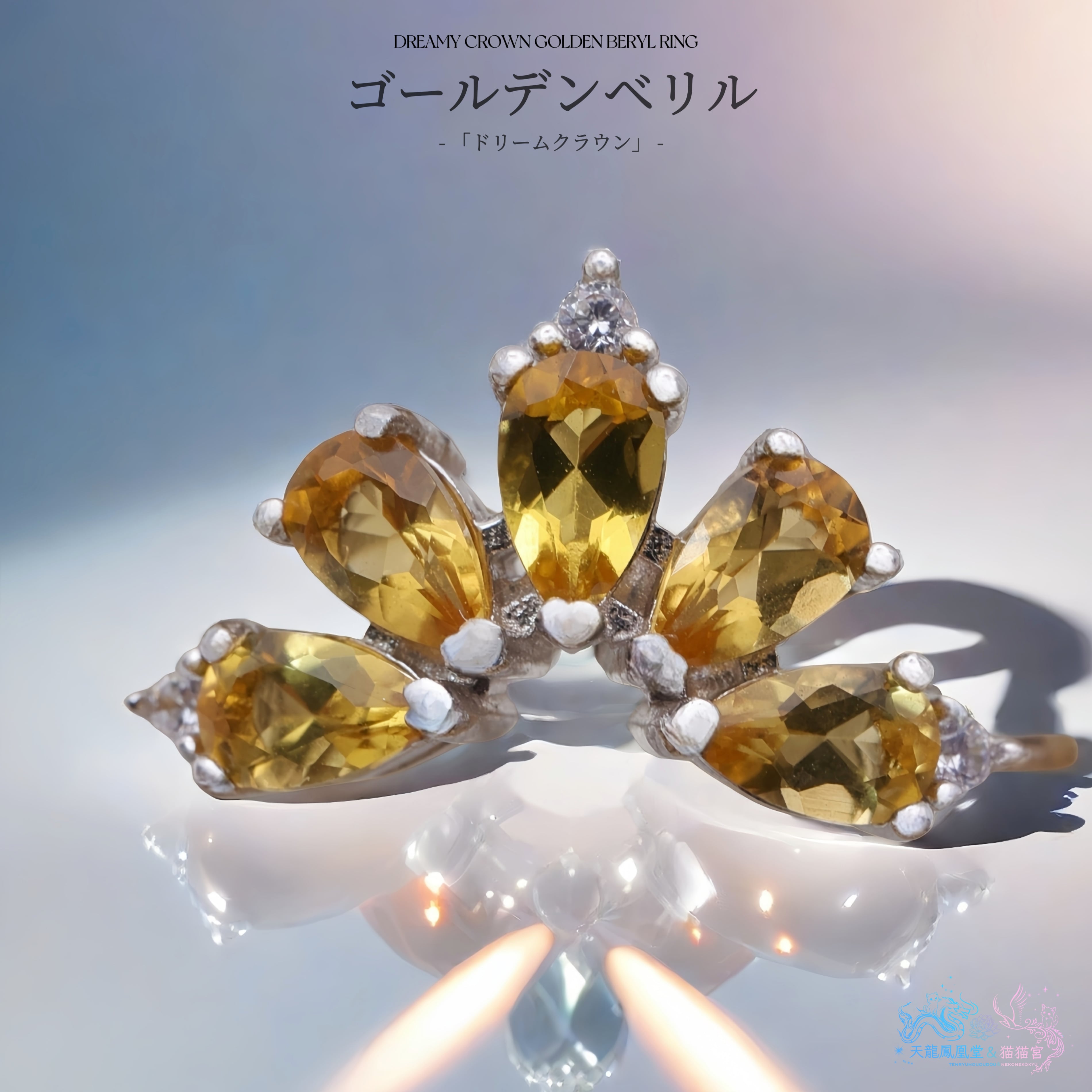 太陽の光をそのまま閉じ込めたかのように輝く、黄金色のゴールデンベリルを贅沢に並べた「ドリームクラウン」リング。