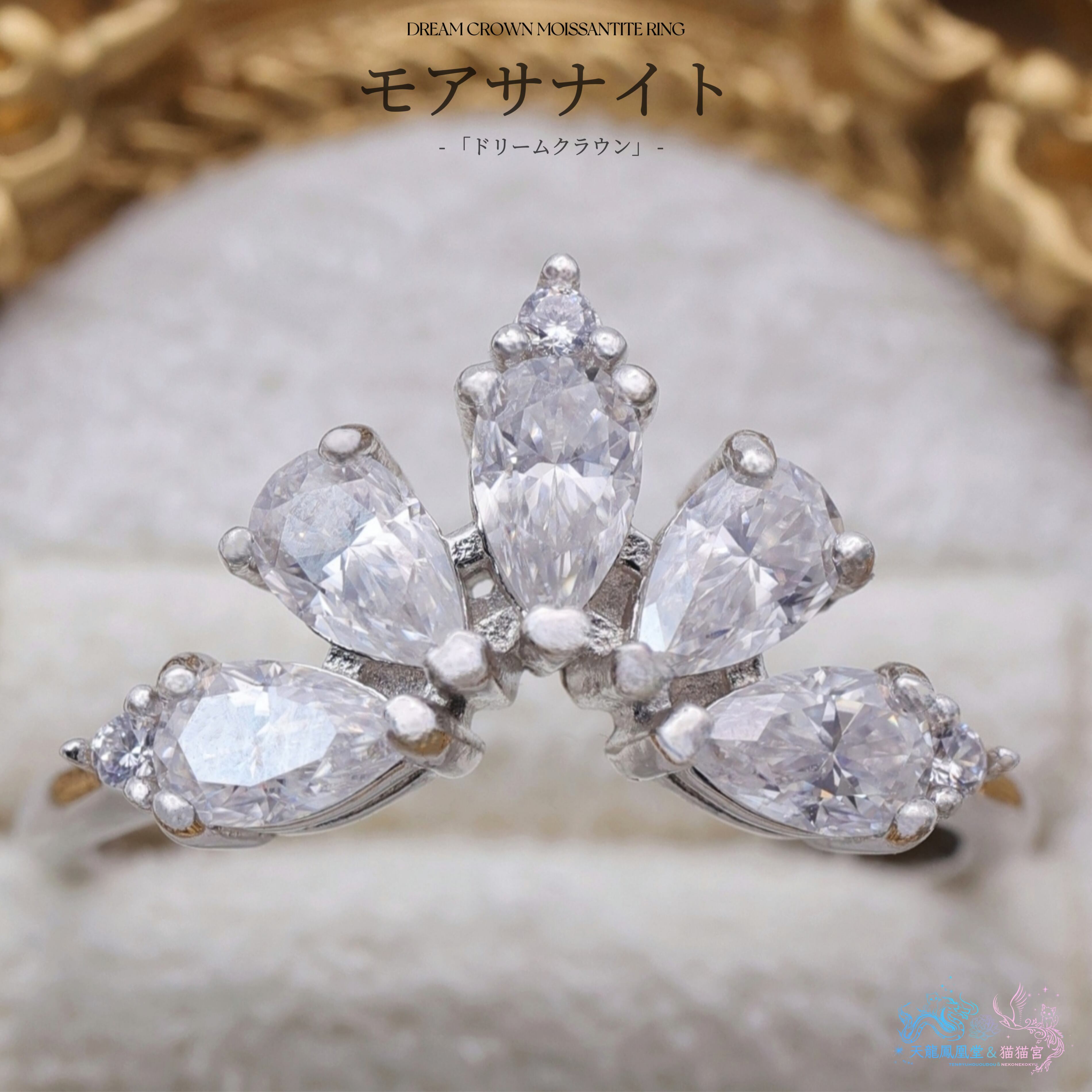 王冠を思わせる造形美と、モアサナイトの圧倒的な輝きが融合した、夢を纏うかのようなリングです。