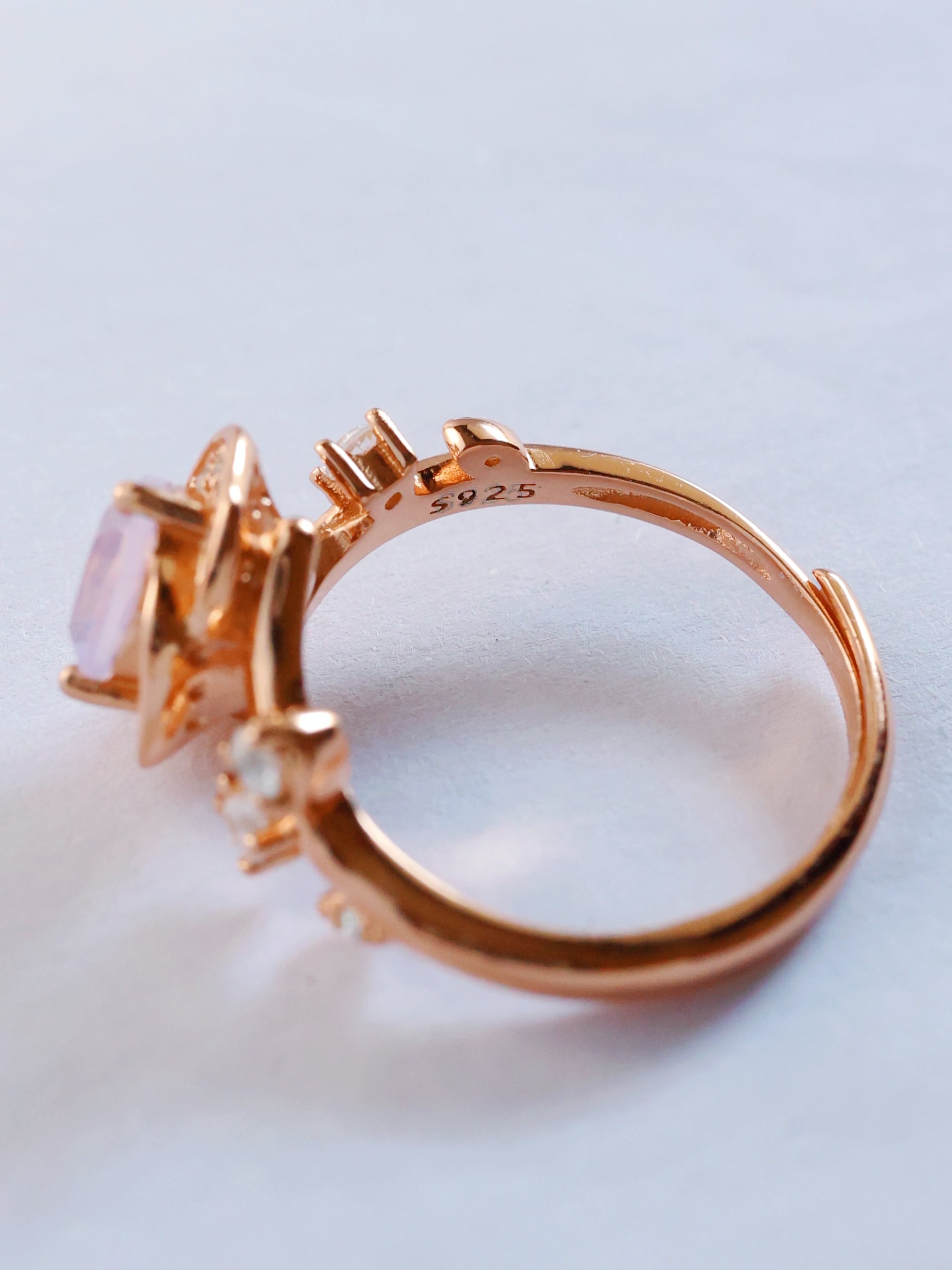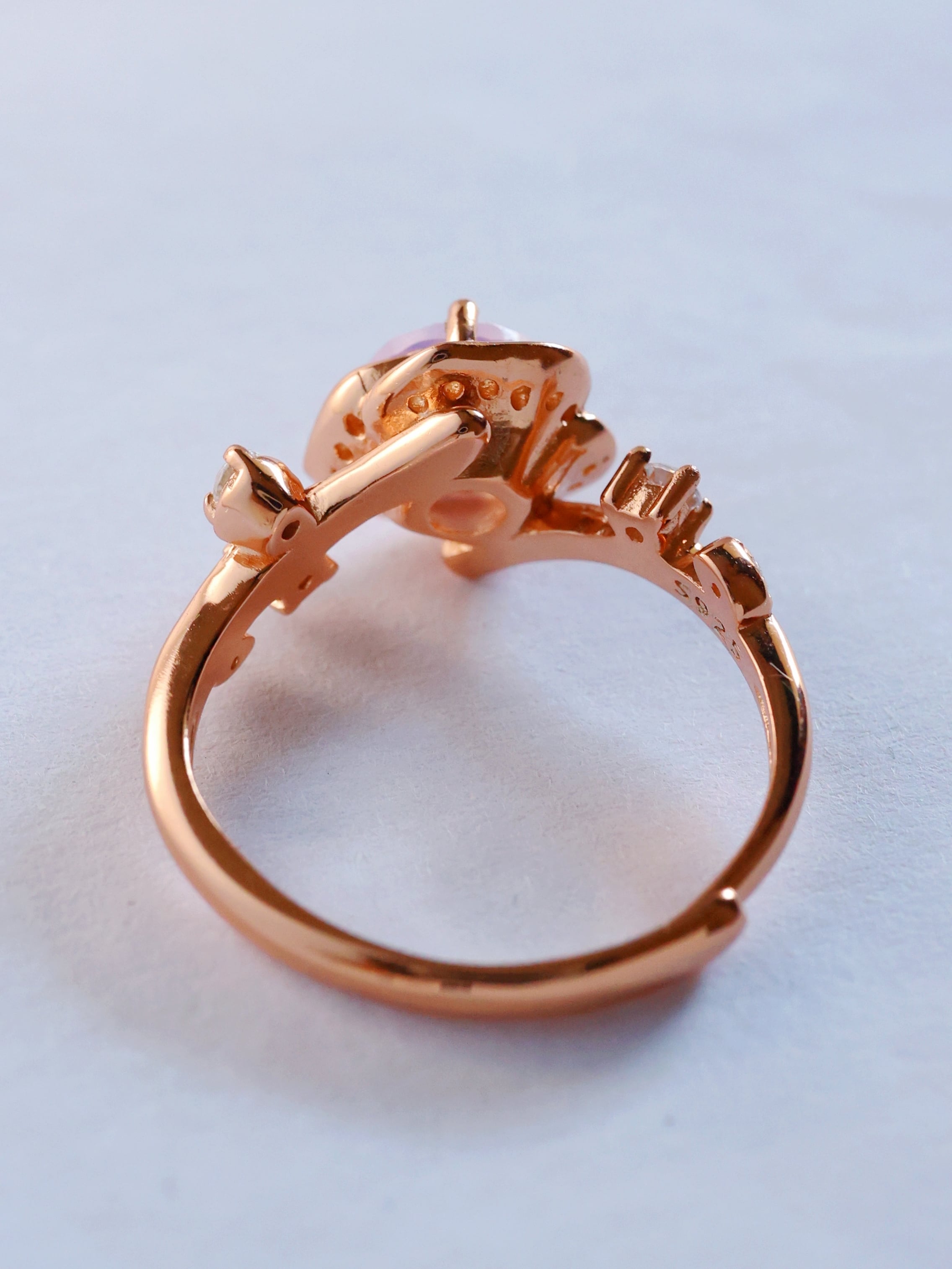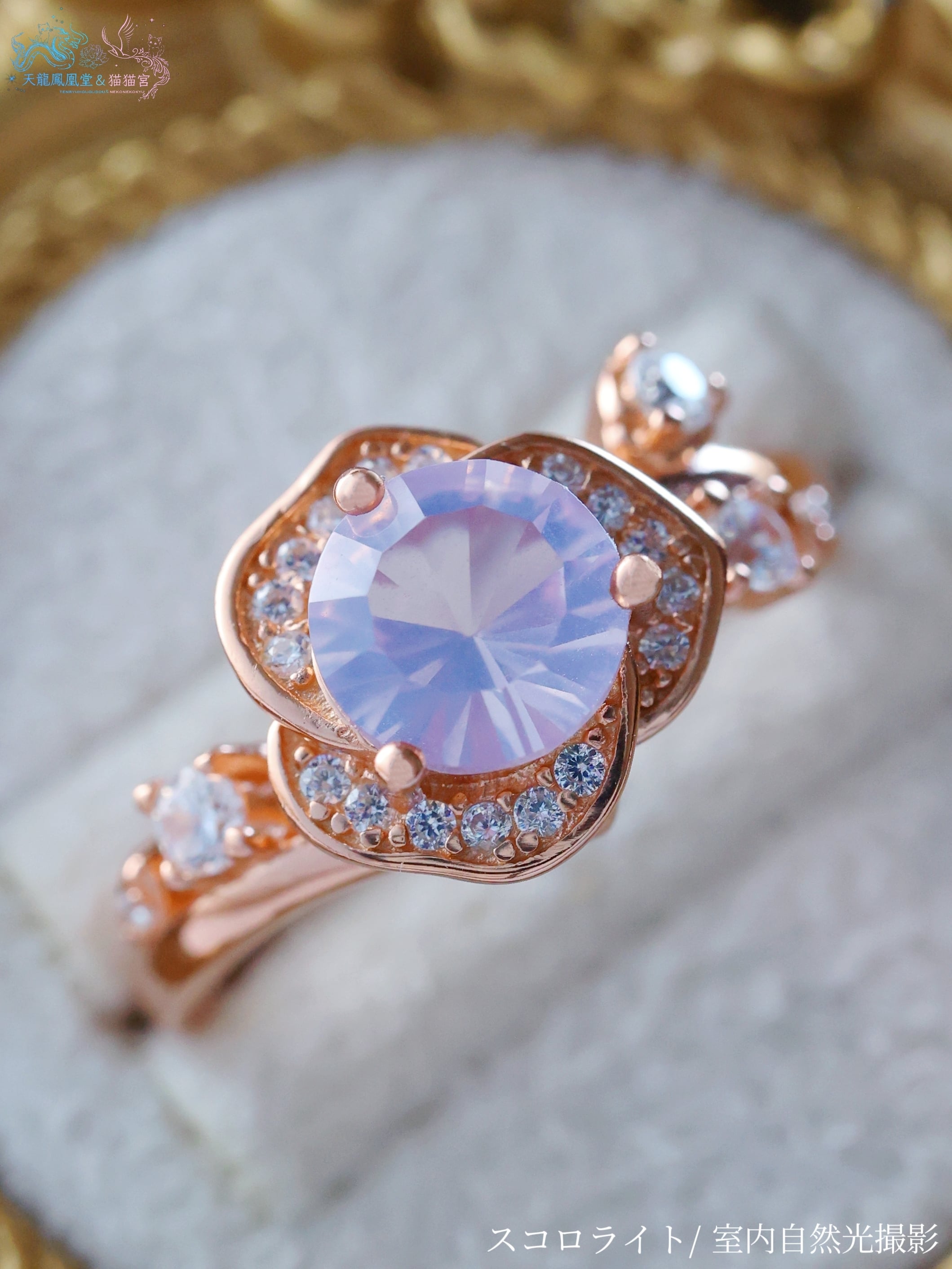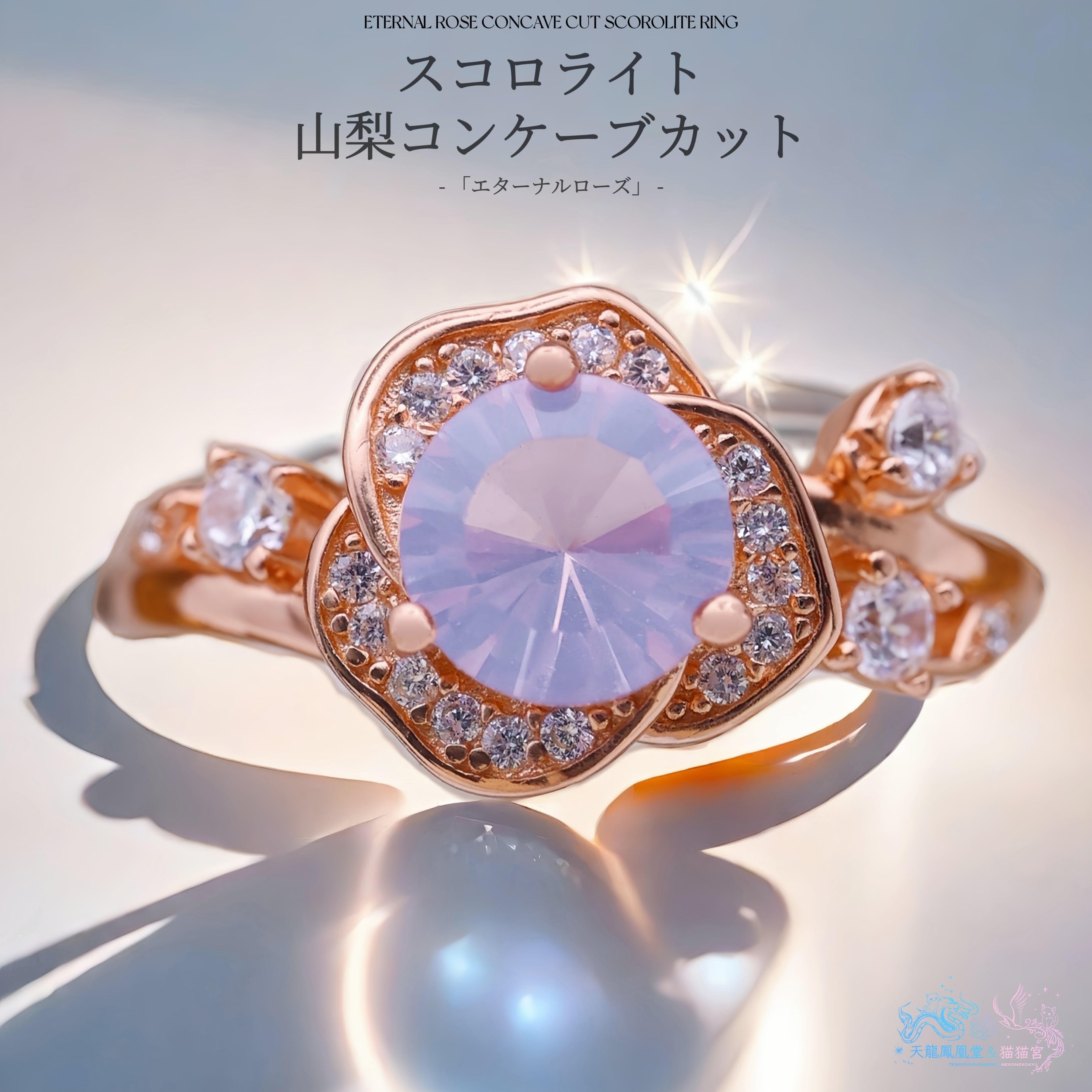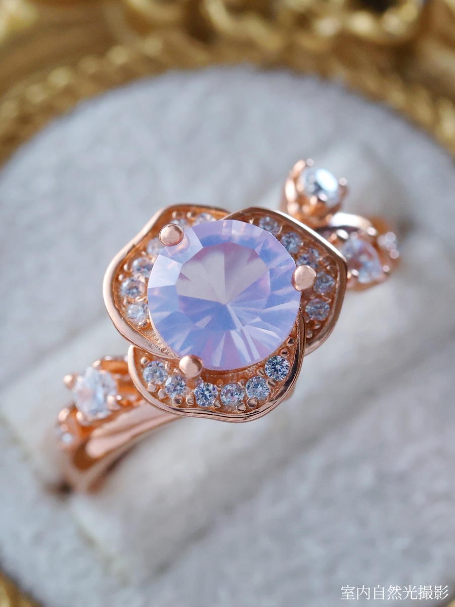 ローズゴールドカラーの地金が、スコロライトの優しい紫を引き立て、全体に温もりと気品を添えています。