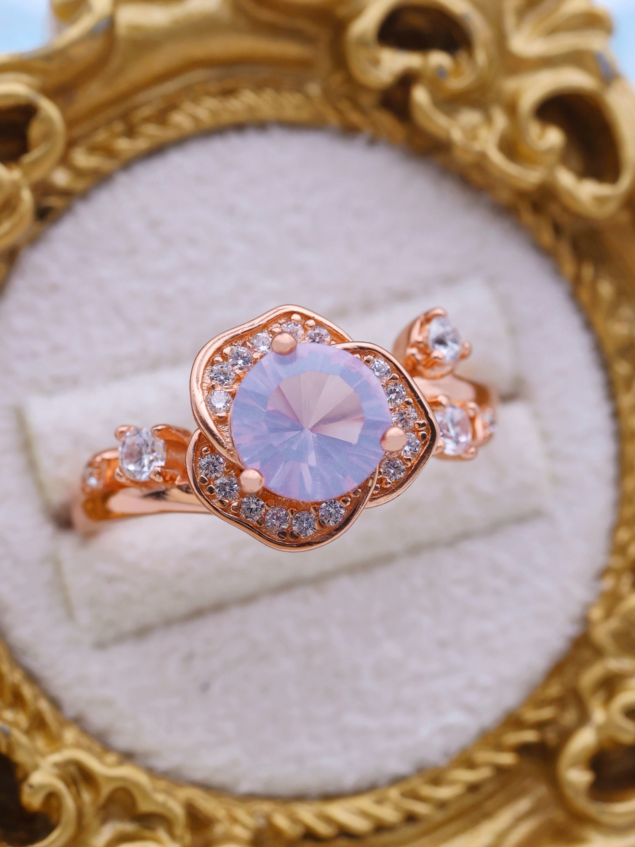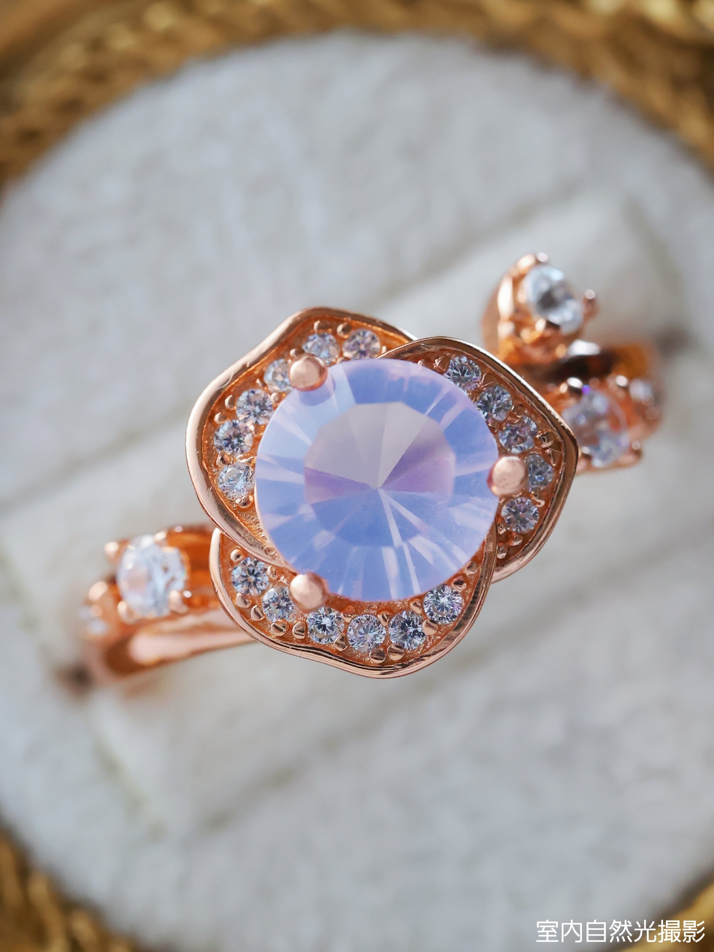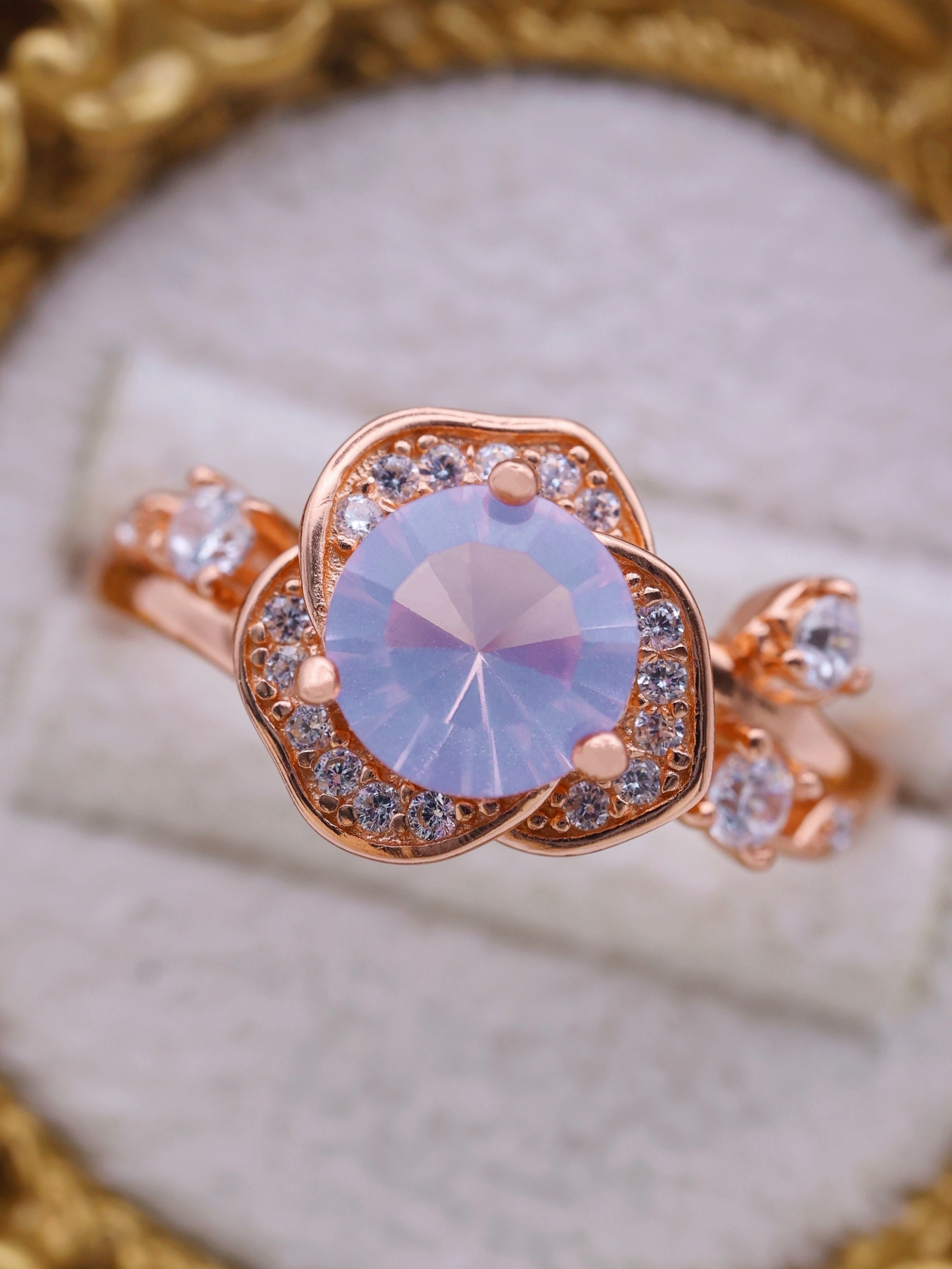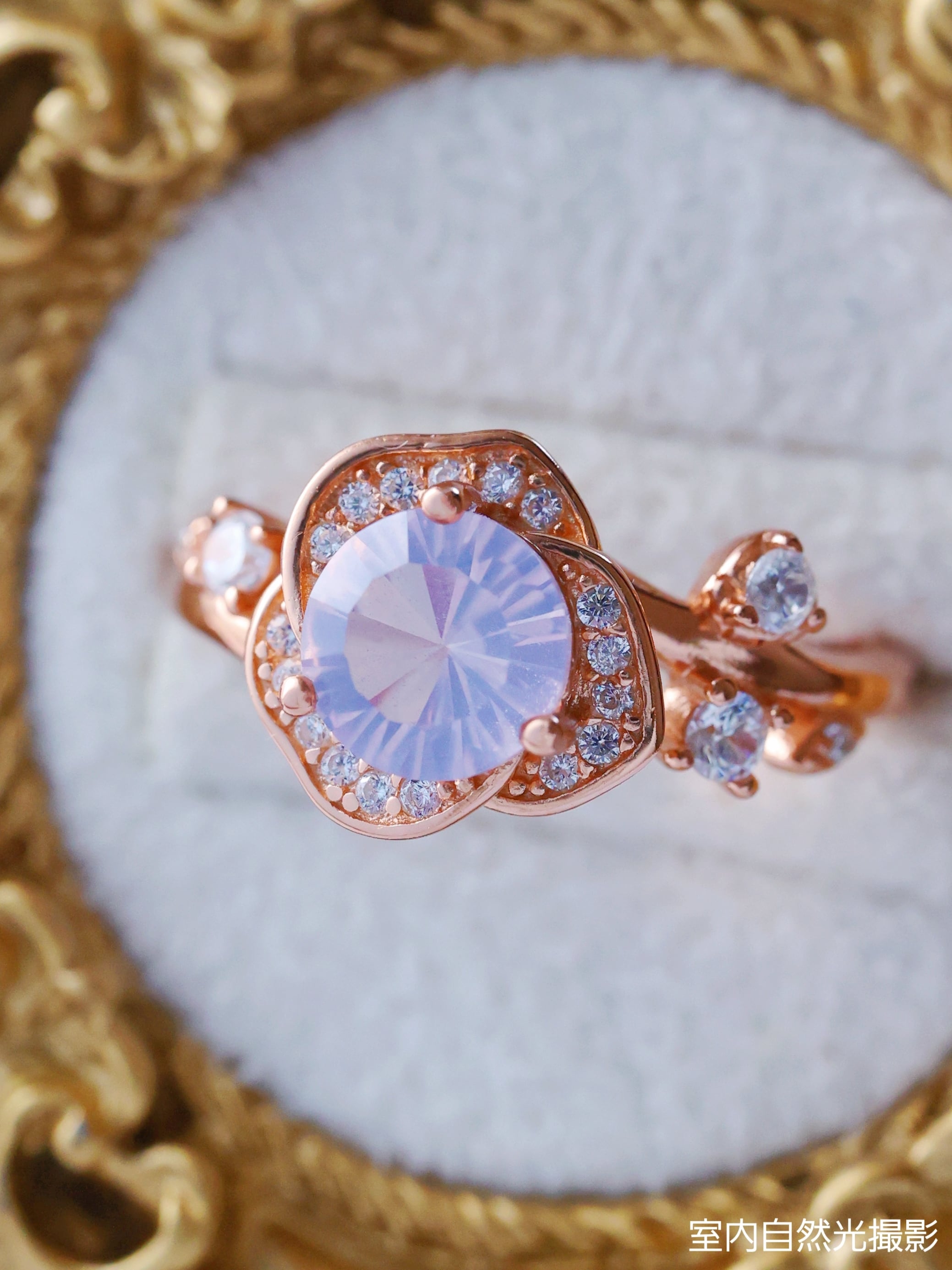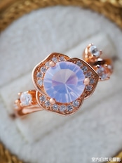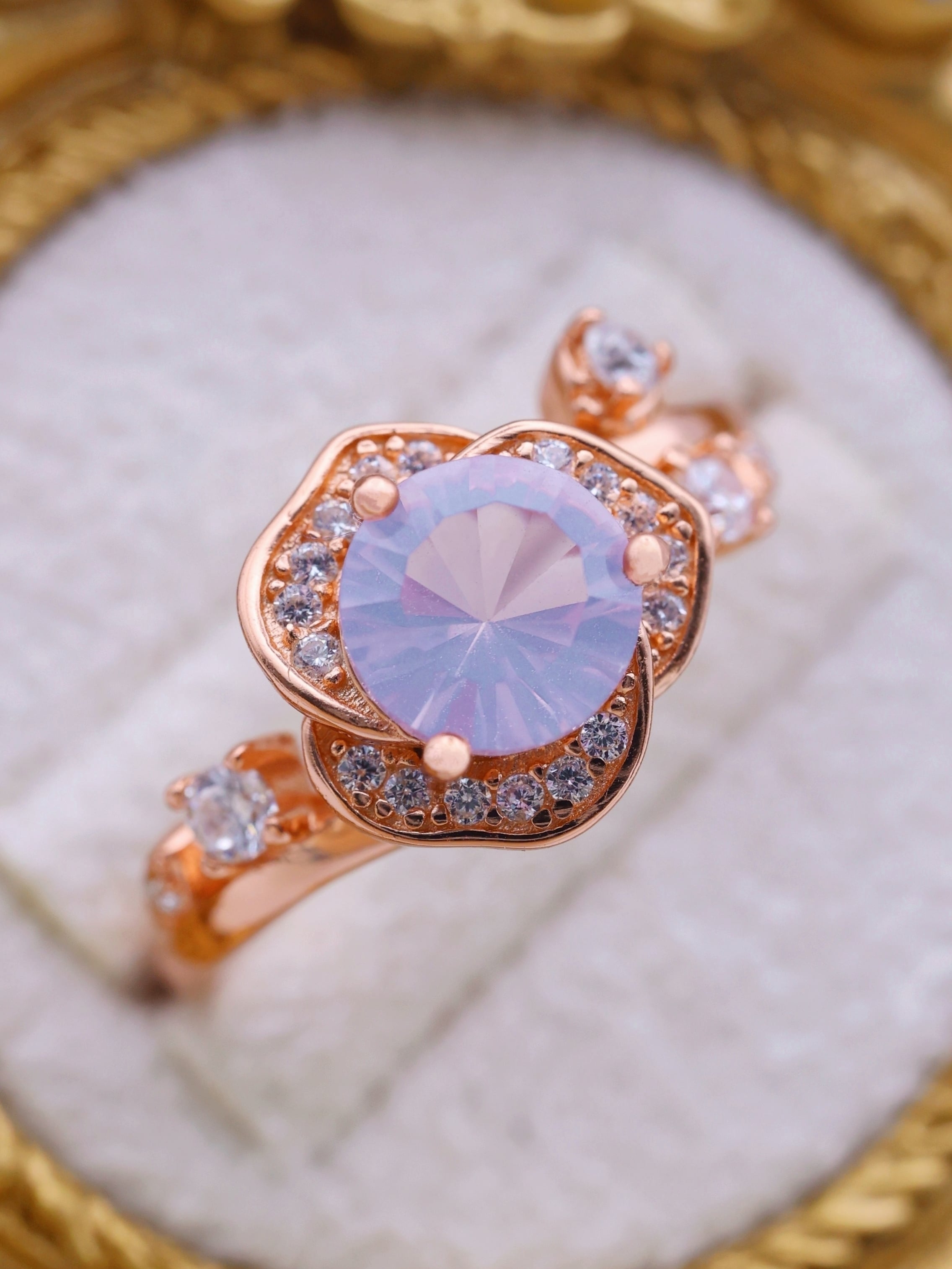ローズゴールドカラーの地金が、スコロライトの優しい紫を引き立て、全体に温もりと気品を添えています。