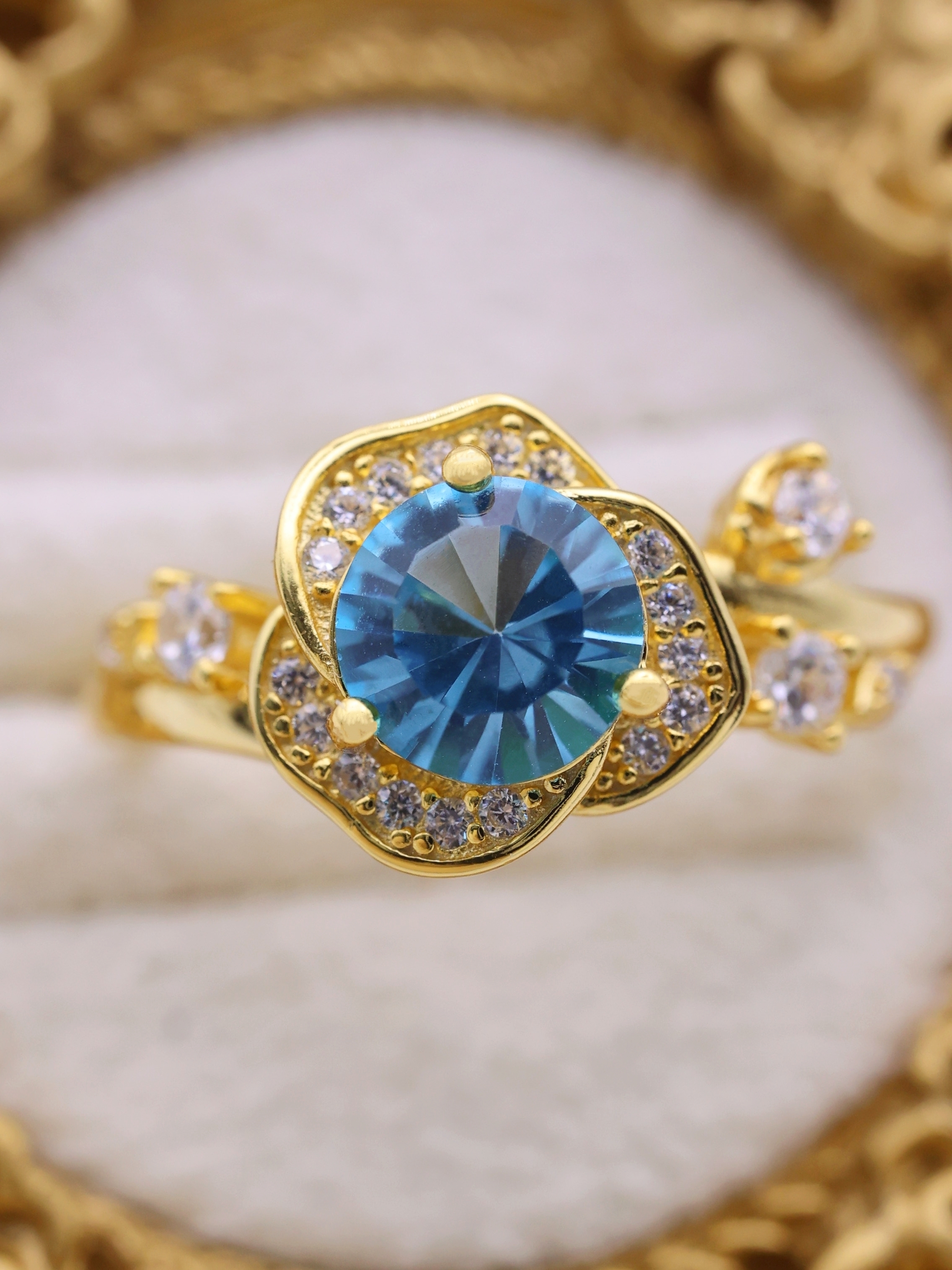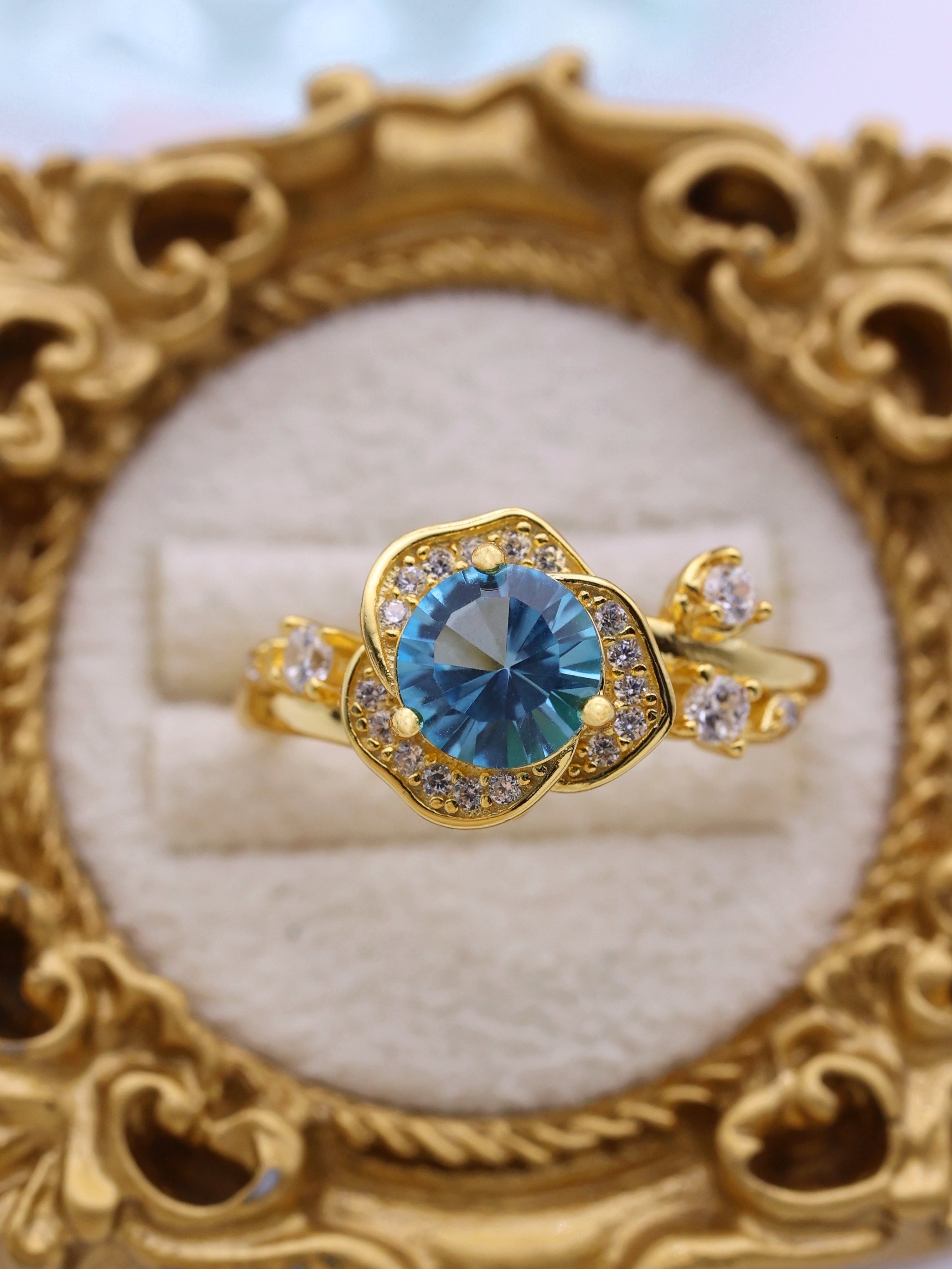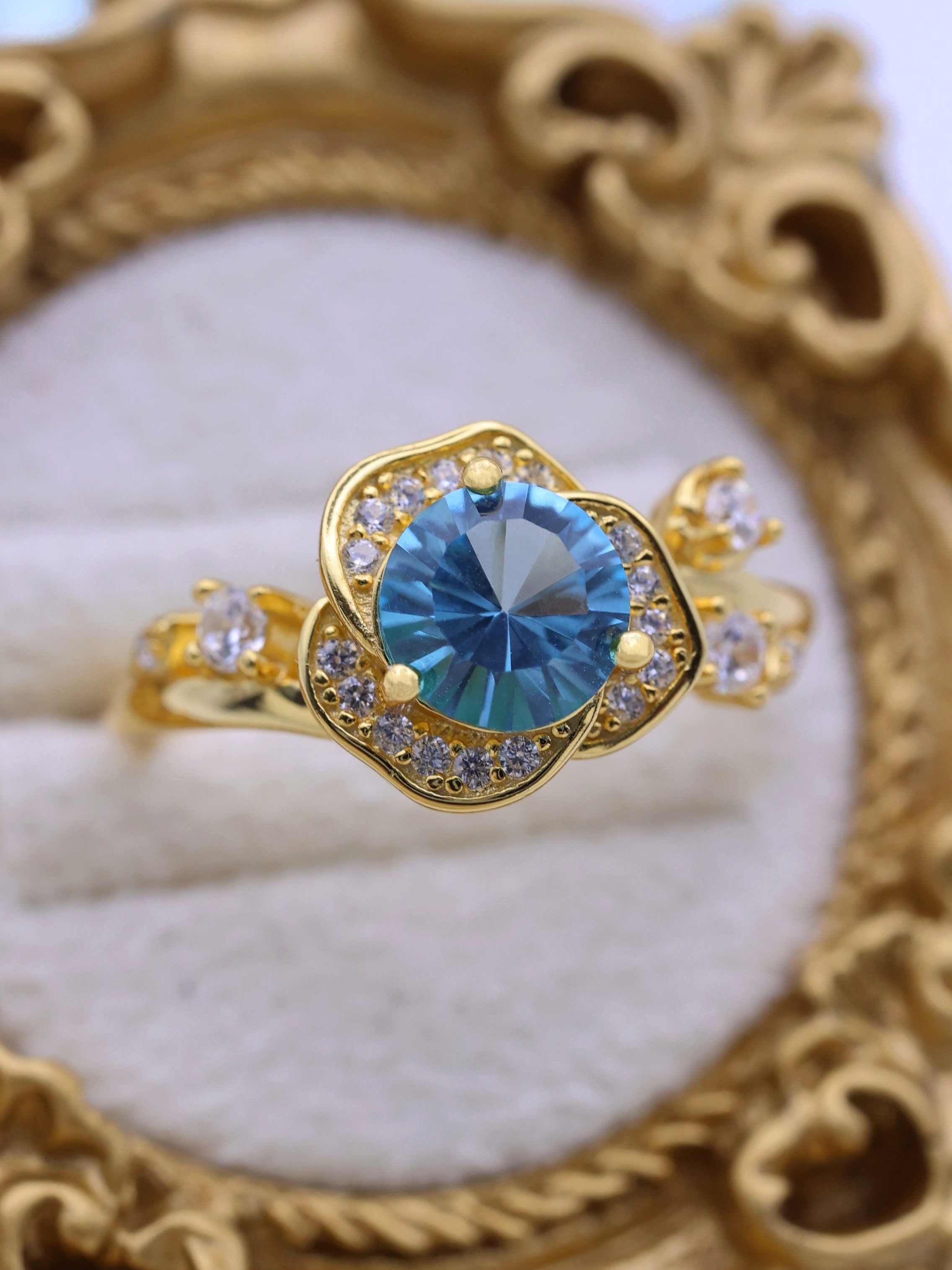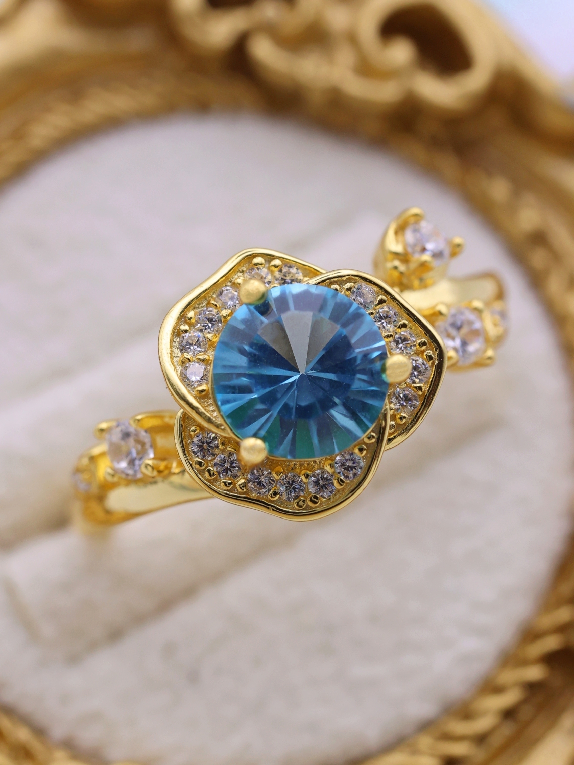花弁部分には高品質の7Aジルコニアをあしらい、主石の輝きを囲む“光のフレーム”として設計。