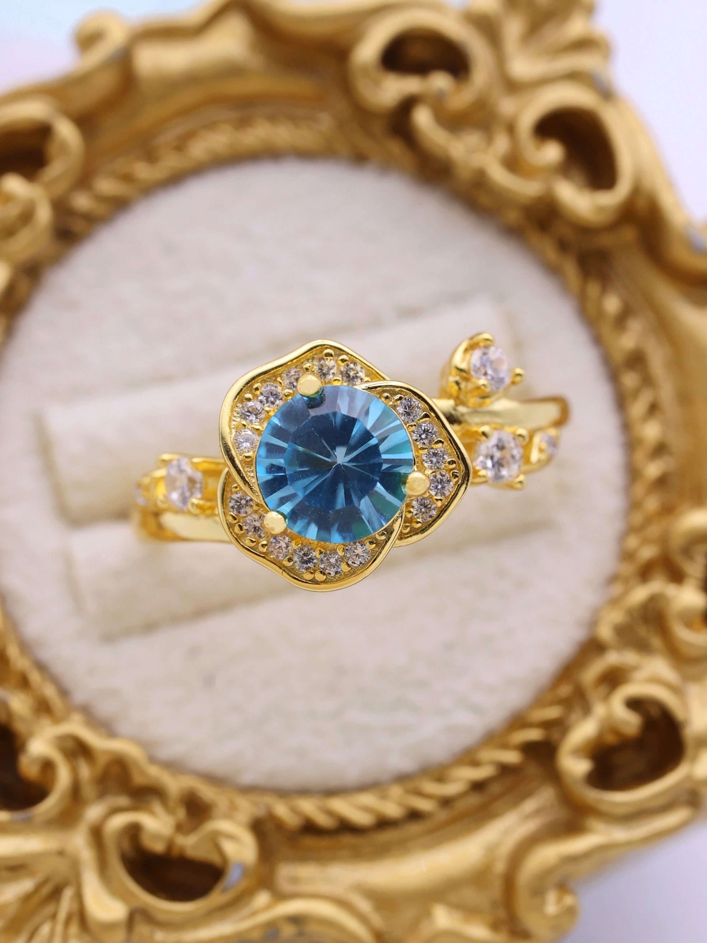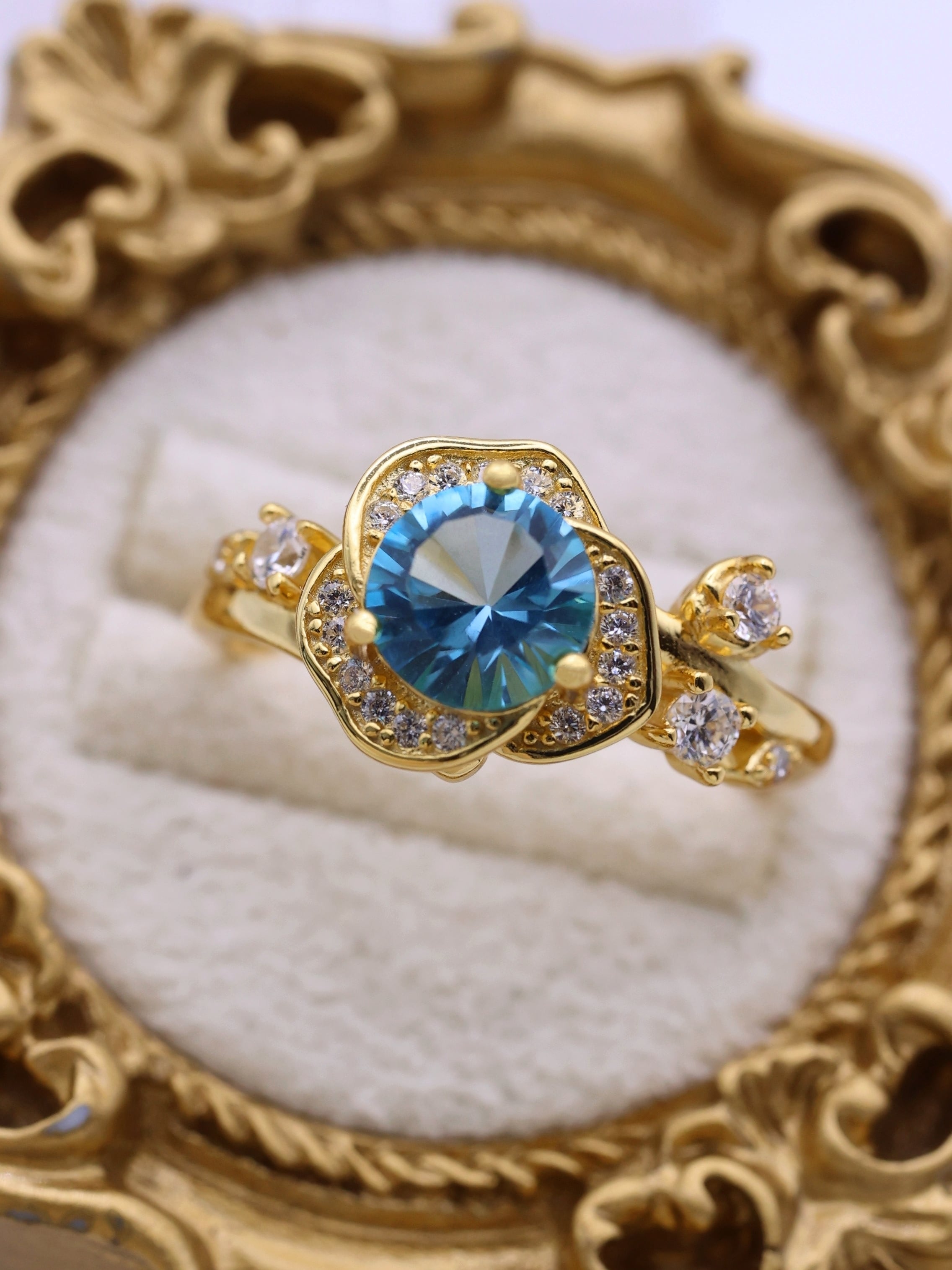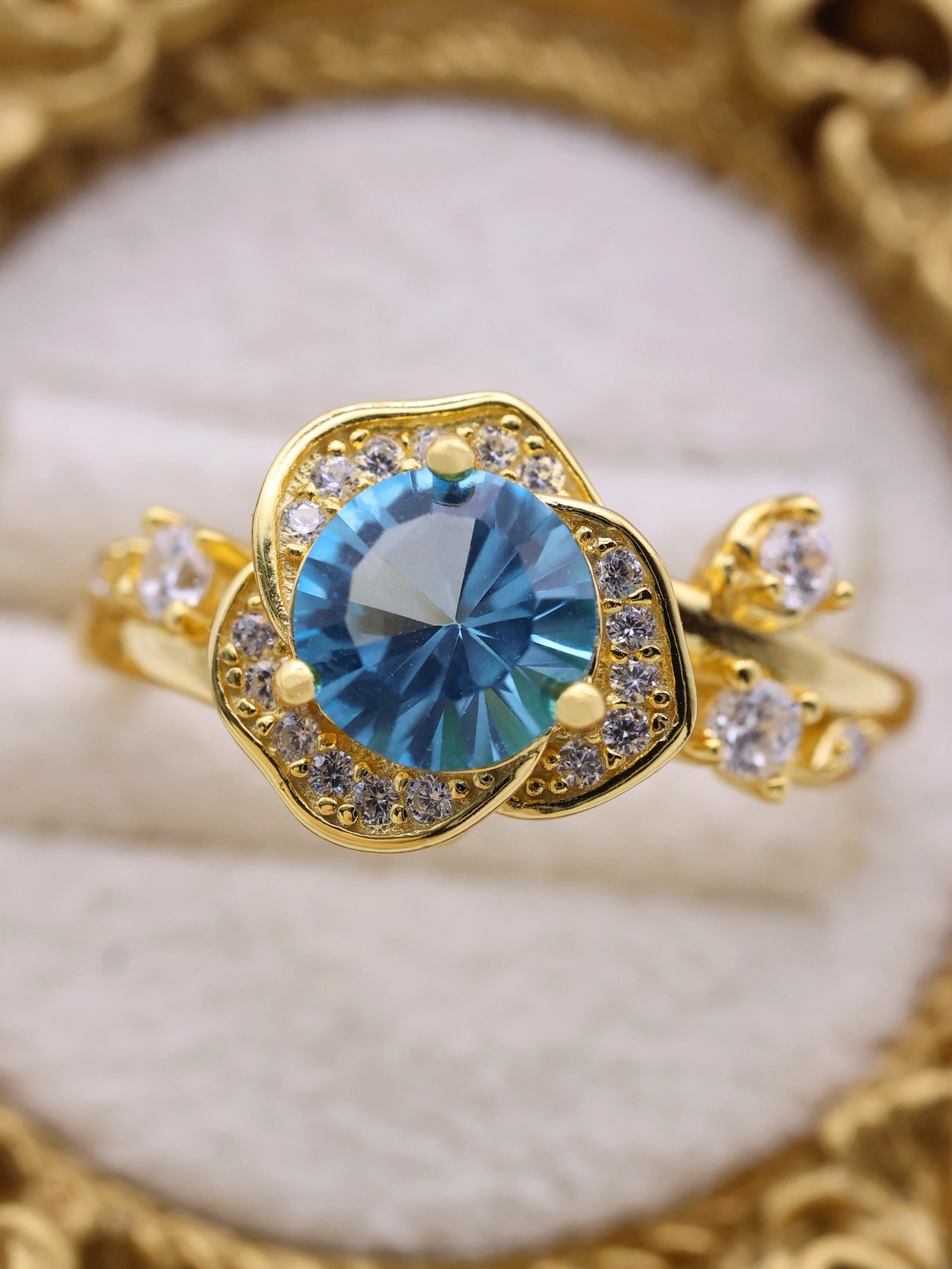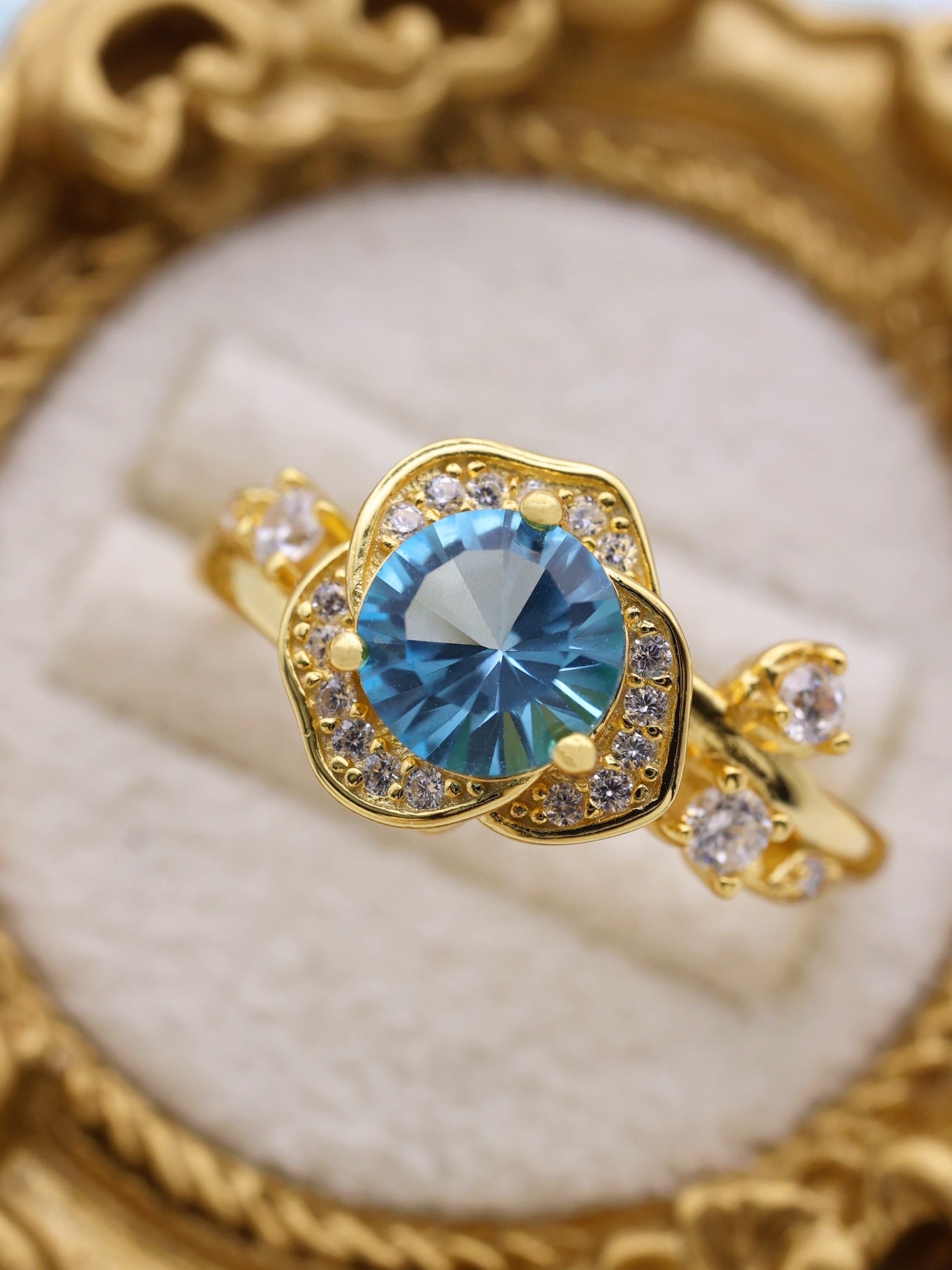 花弁部分には高品質の7Aジルコニアをあしらい、主石の輝きを囲む“光のフレーム”として設計。