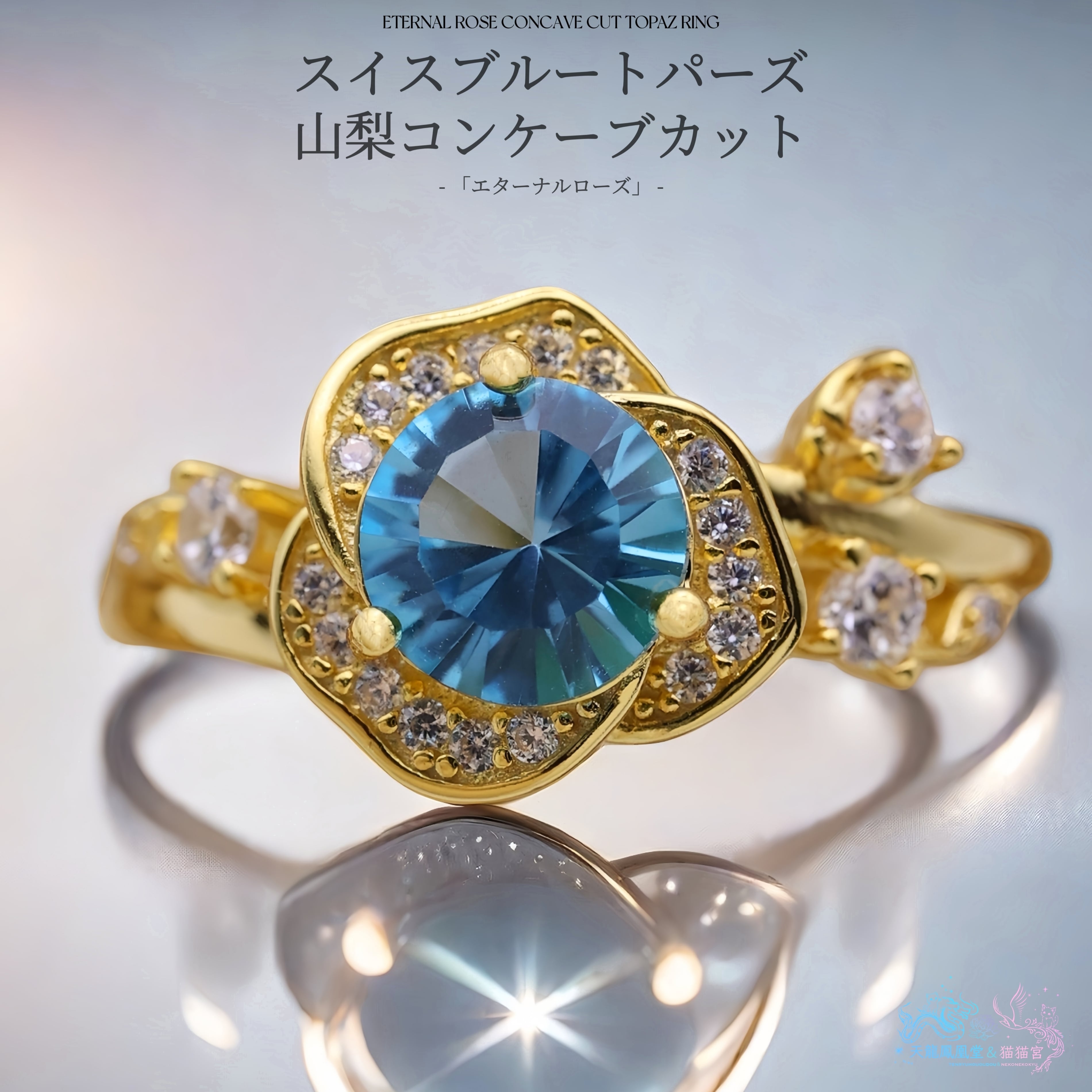 【エターナルローズ】スイスブルートパーズ 山梨 コンケーブカット 天然石 S925 18KGP リング