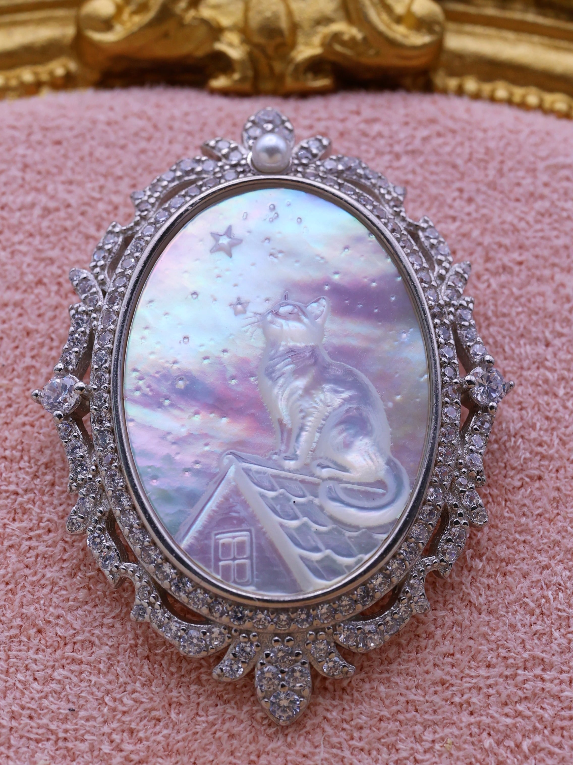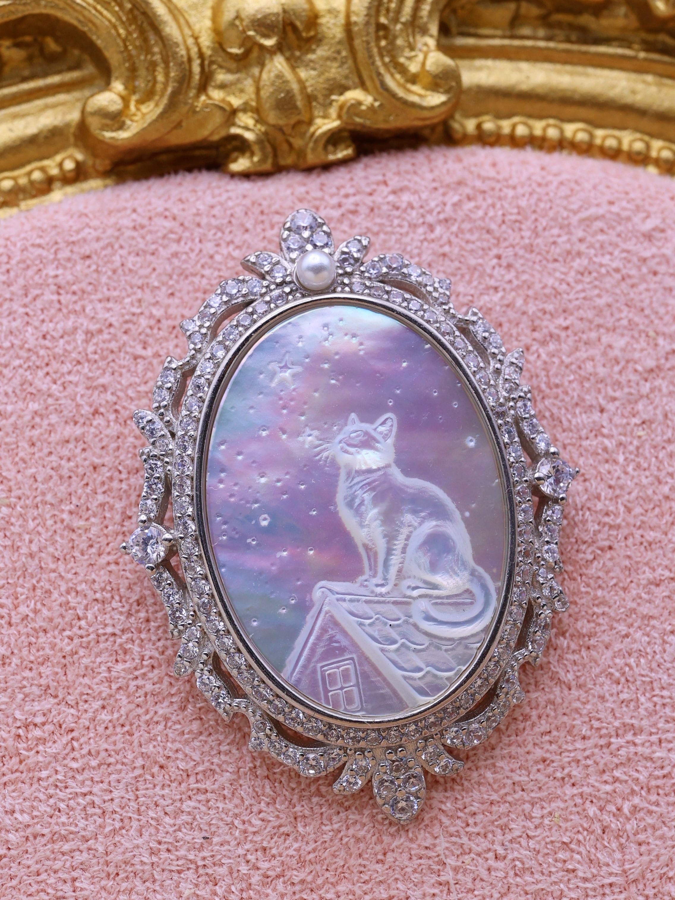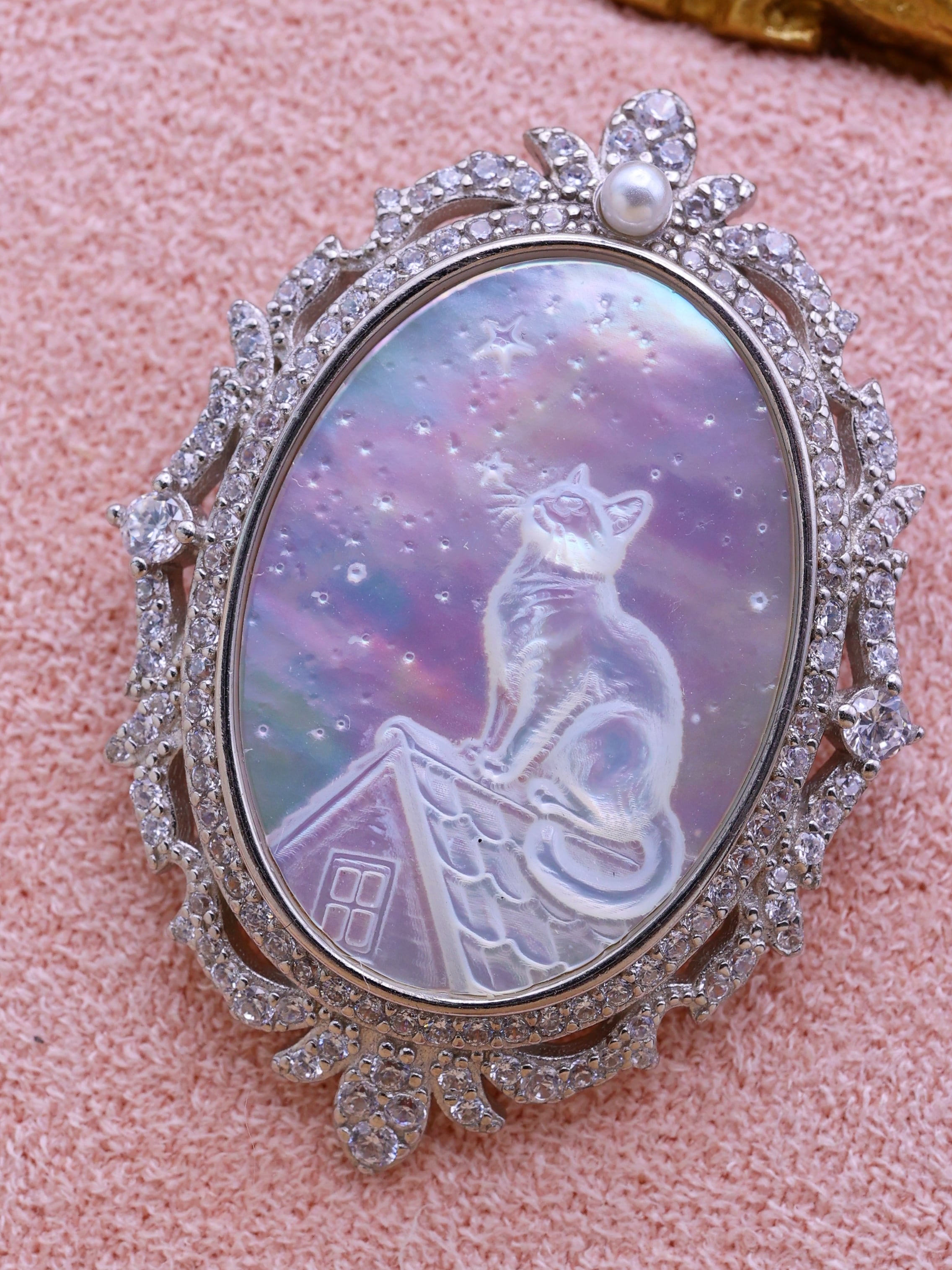 【白蝶貝彫刻シリーズ】星空を見上げる猫 2WAYペンダント・ブローチ オーロラ 天然石 シルバー S925