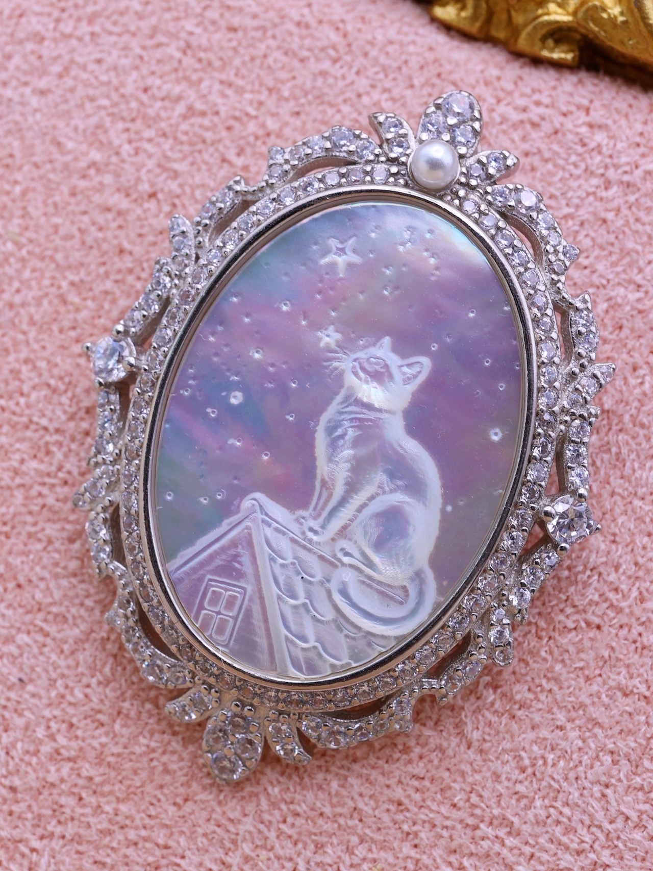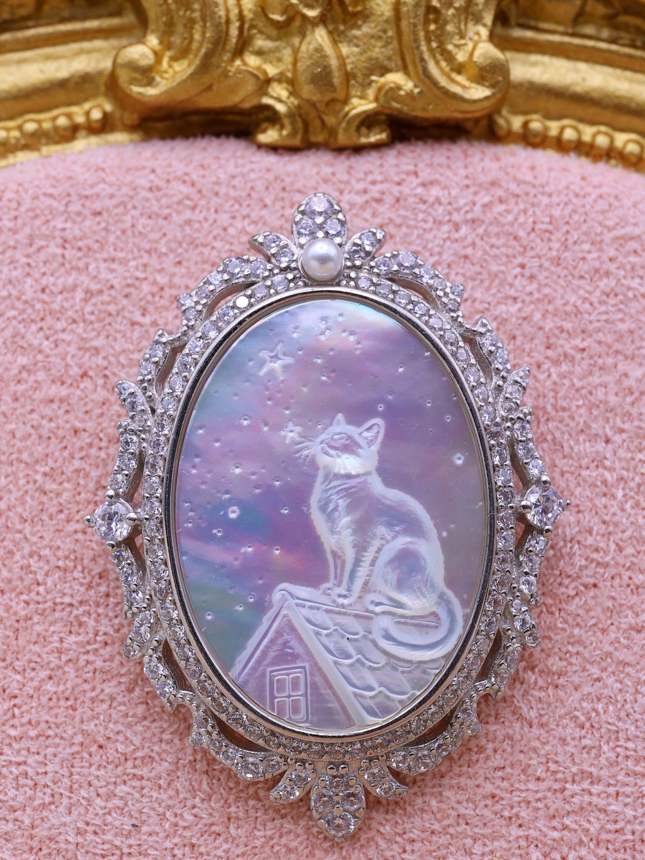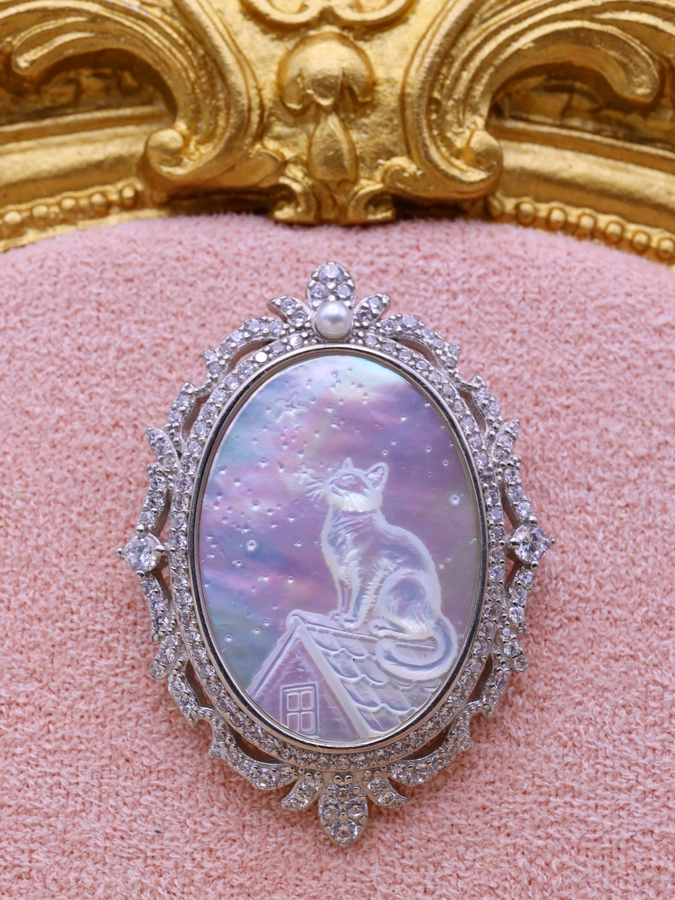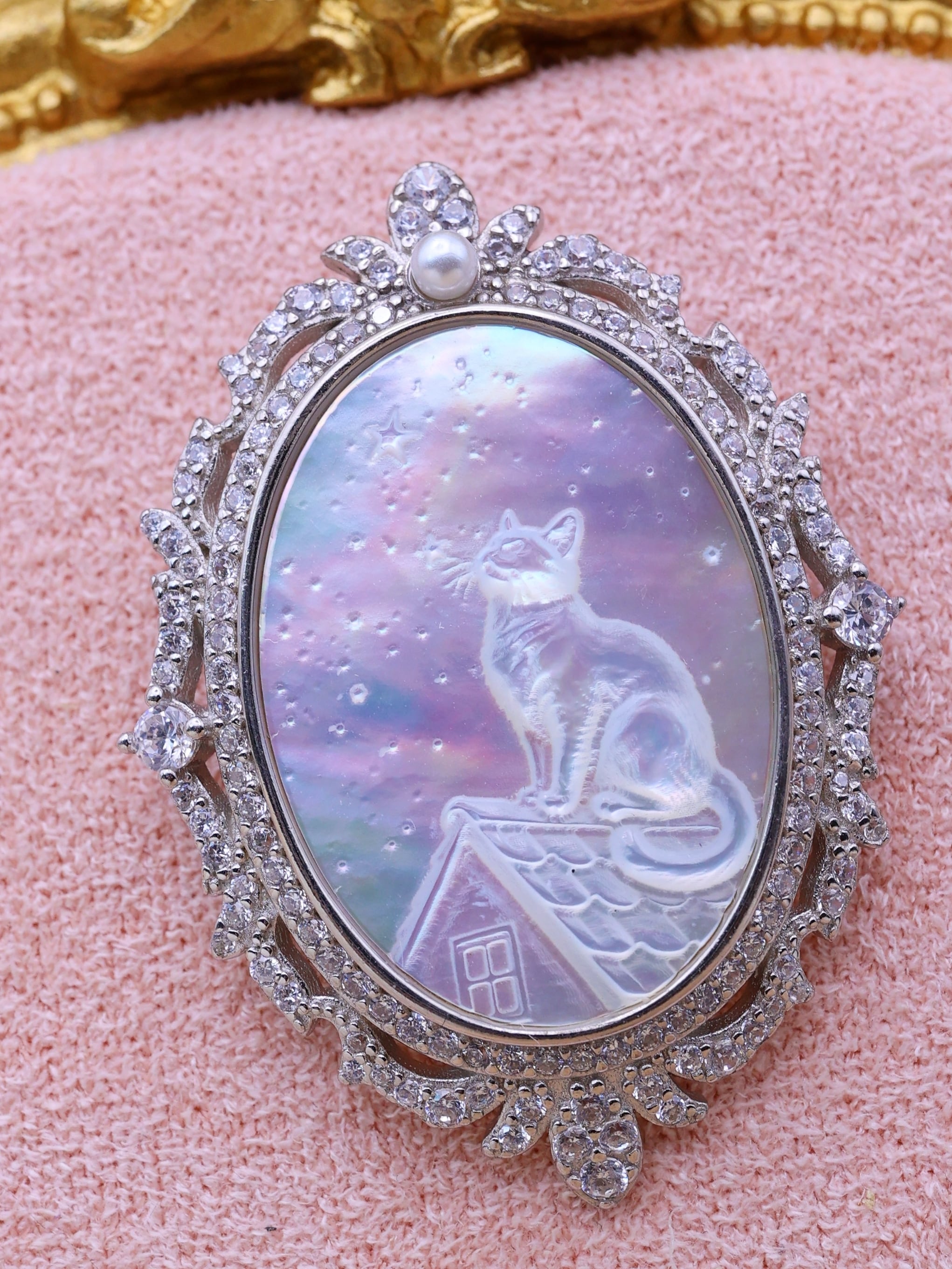 【白蝶貝彫刻シリーズ】星空を見上げる猫 2WAYペンダント・ブローチ オーロラ 天然石 シルバー S925