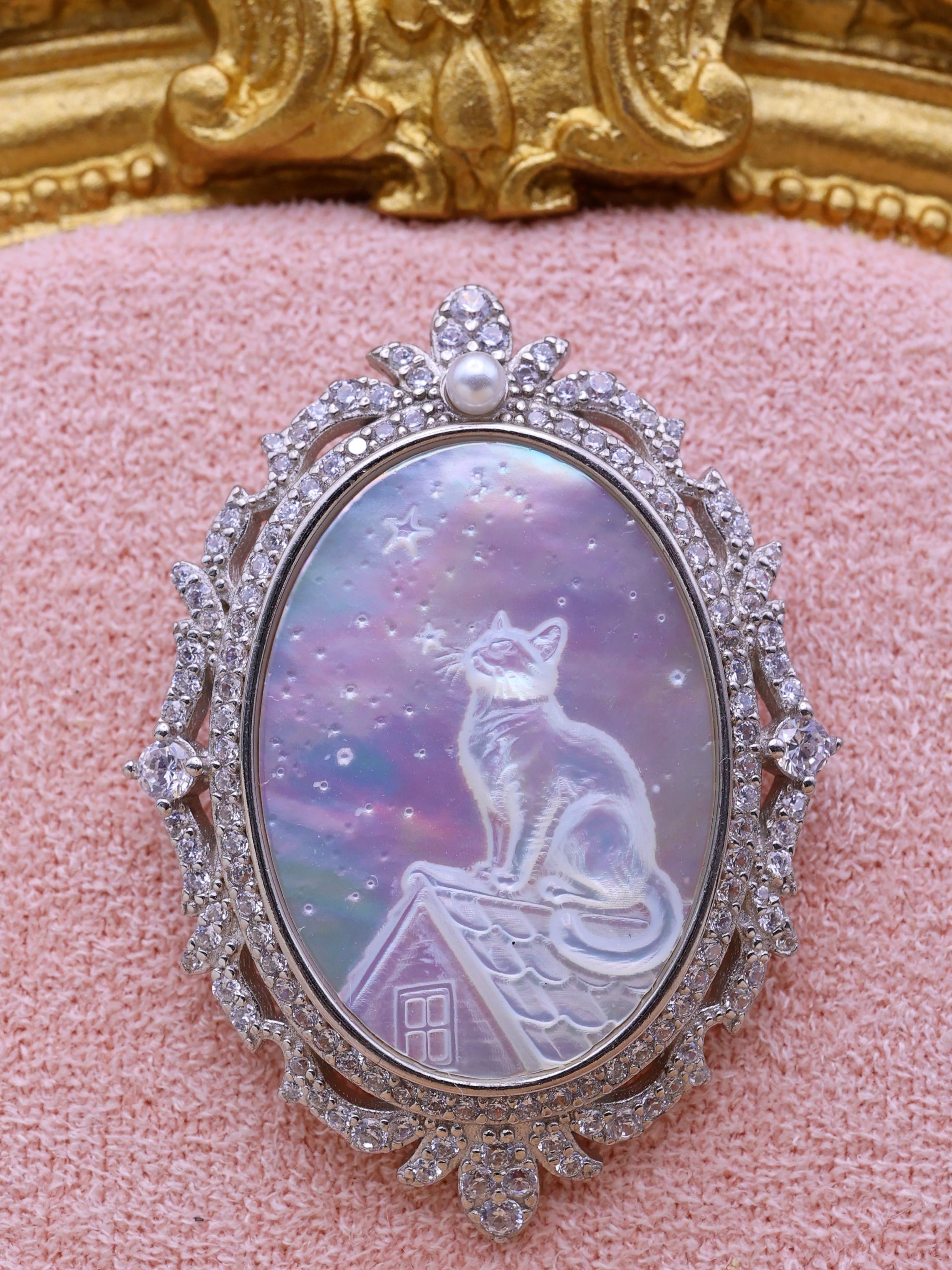 丸みのある背中のラインや、くるりと添えられた尻尾、首元から胸にかけての柔らかな陰影まで丁寧に表現され、白蝶貝のオーロラカラーが、猫の輪郭を月光のように淡く照らします。