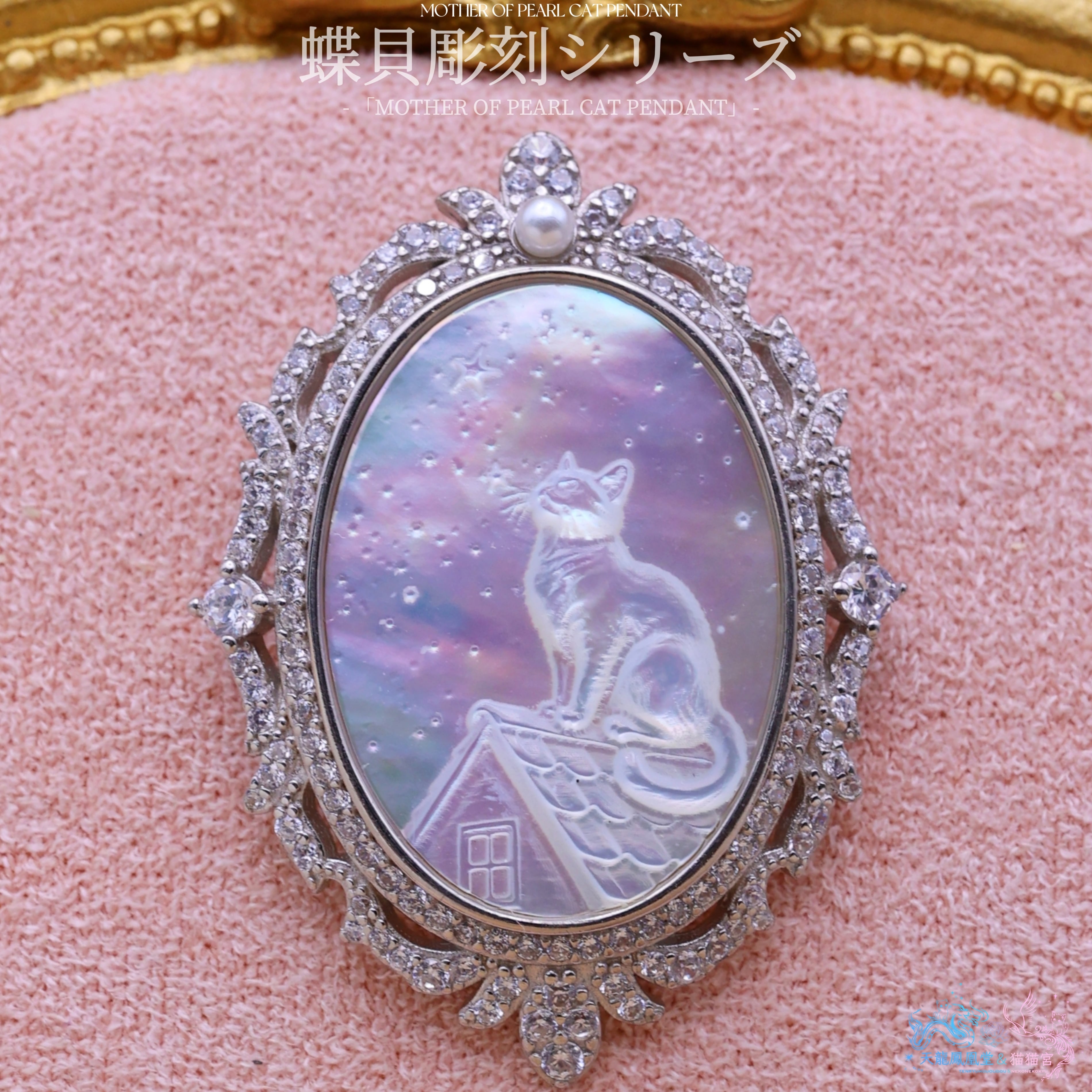 本作は、オーストラリア産の白蝶貝(マザーオブパール)を使用した、幻想的な猫モチーフのペンダントです。