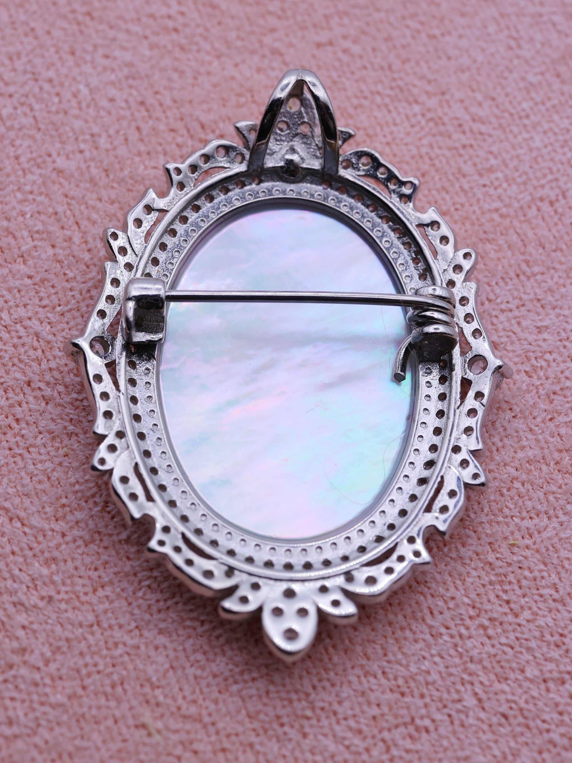 クラシカルな透かし装飾と小粒ストーンが、白蝶貝の清らかなオーロラカラーを引き立て、