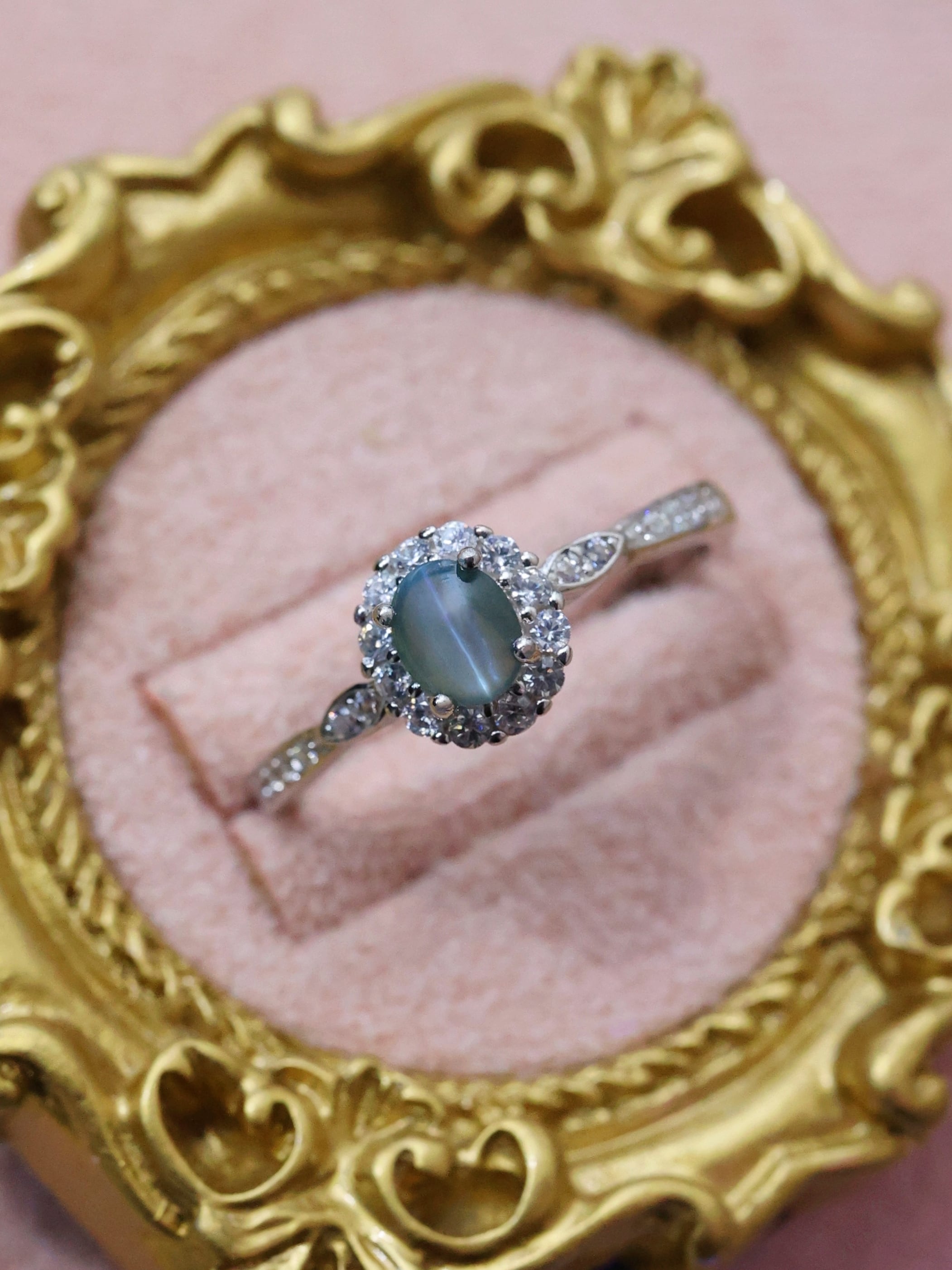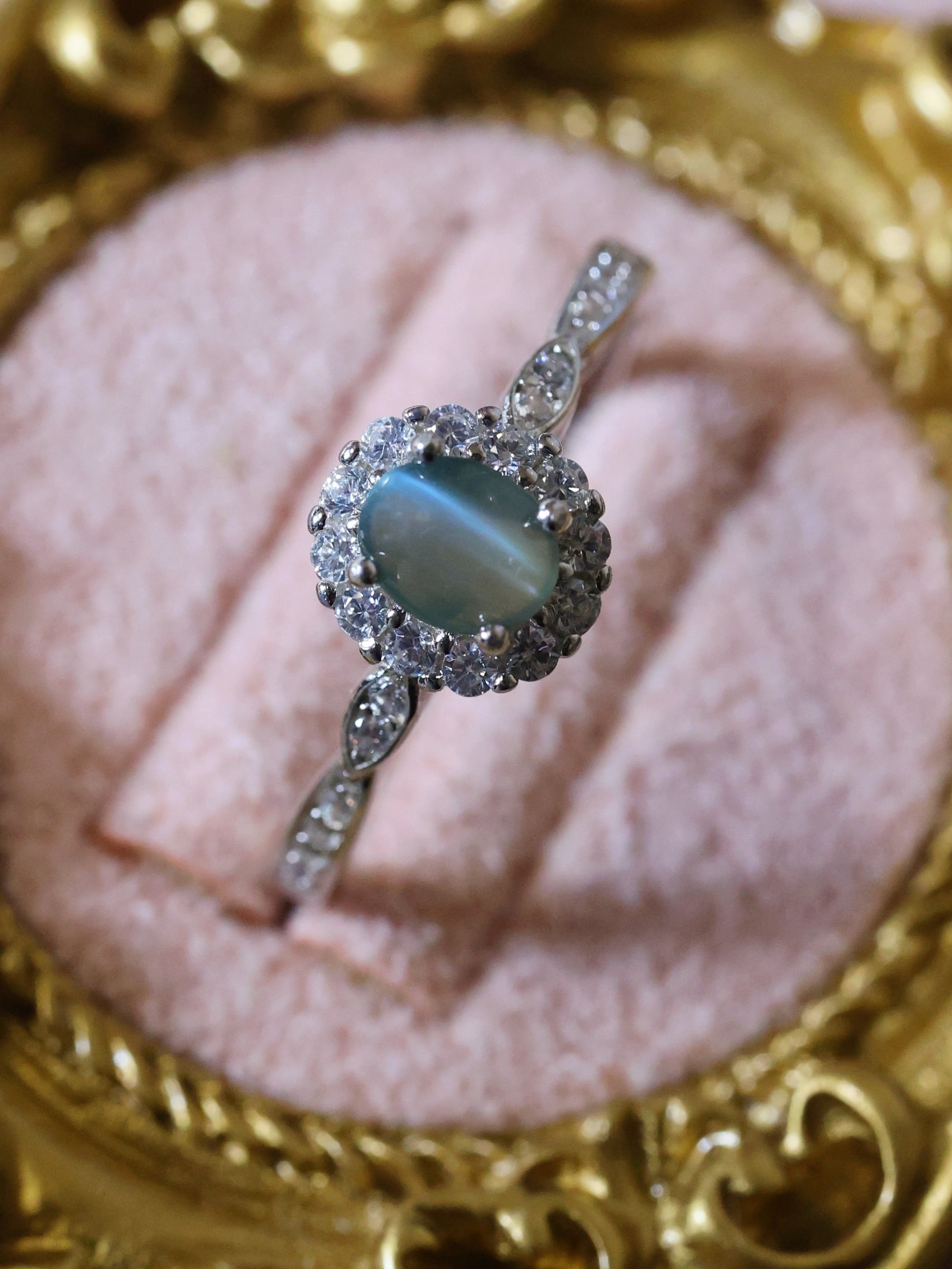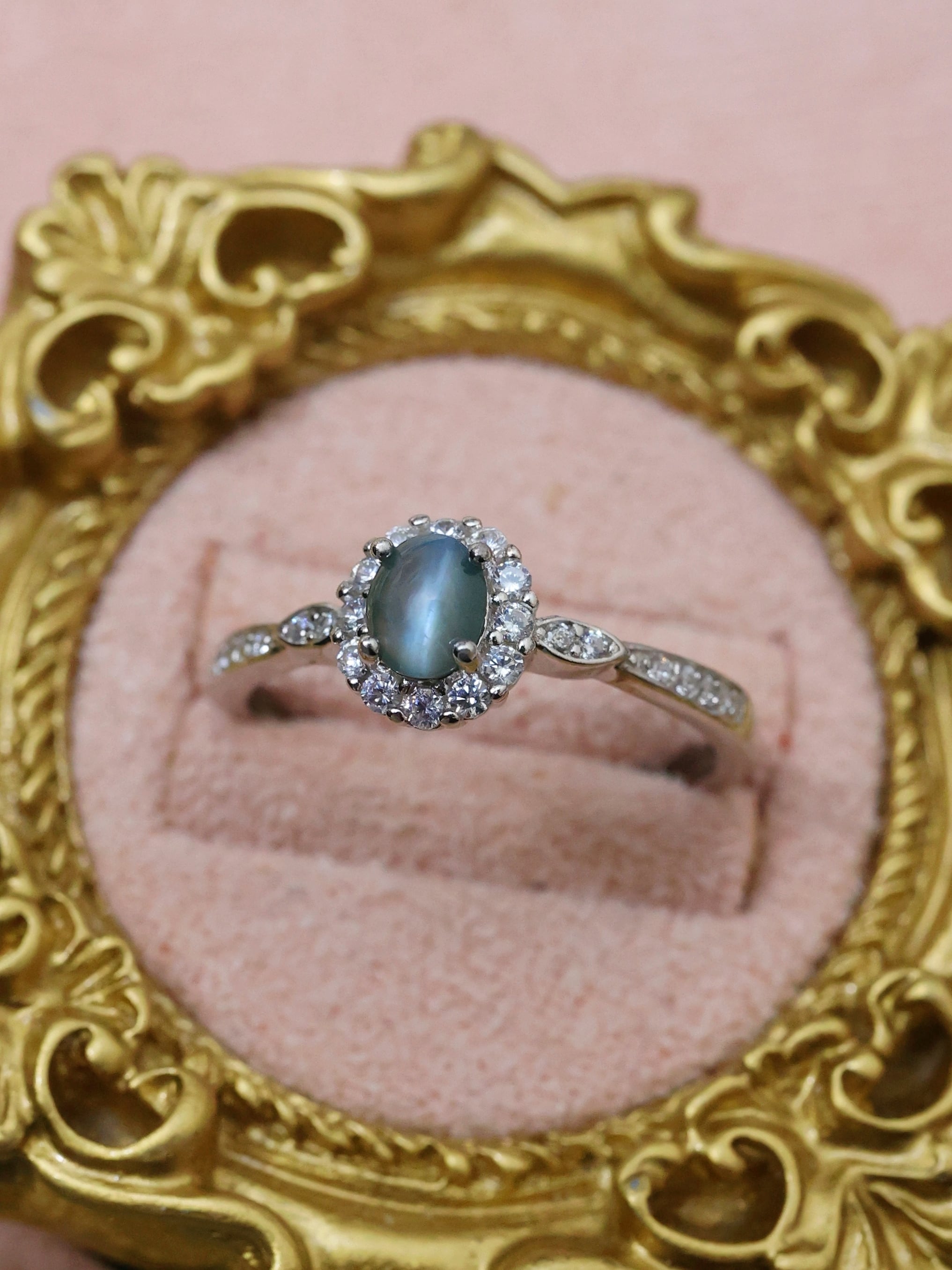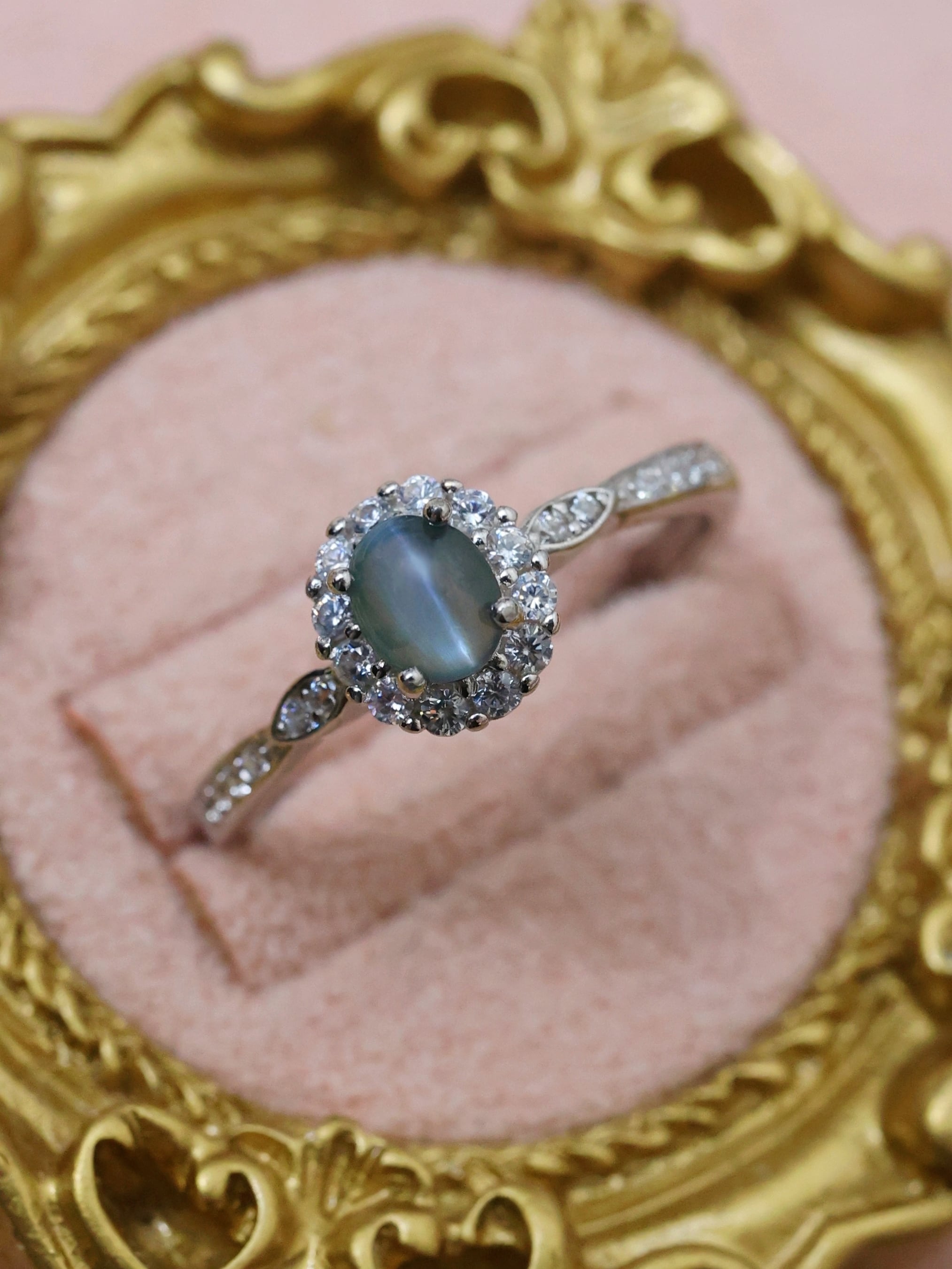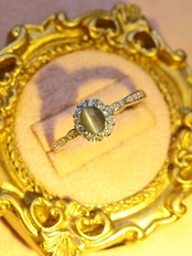 オーバルカボションに整えられた主石は、光を受ける角度によって石の中央に一本、はっきりとしたキャッツアイを現します。