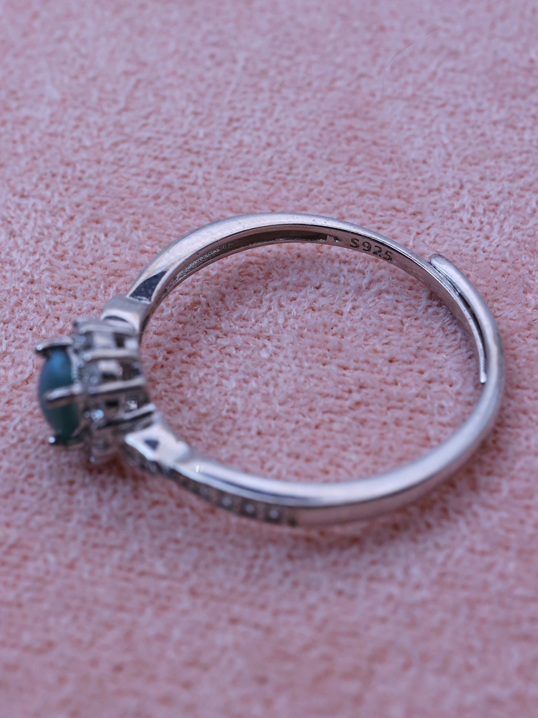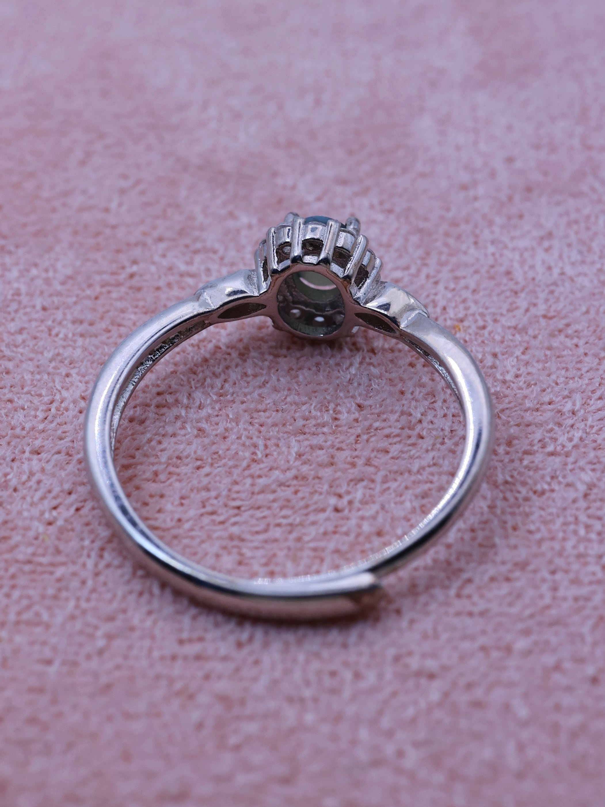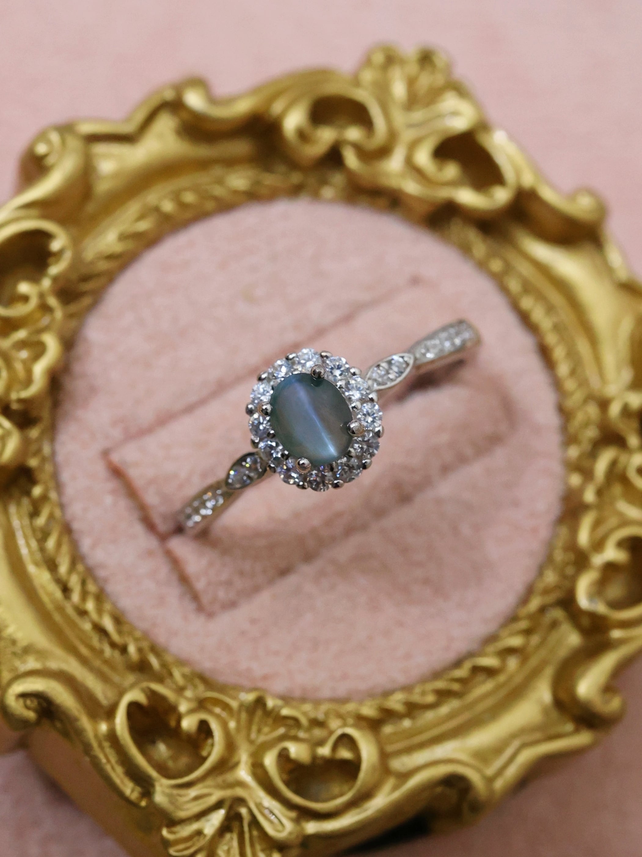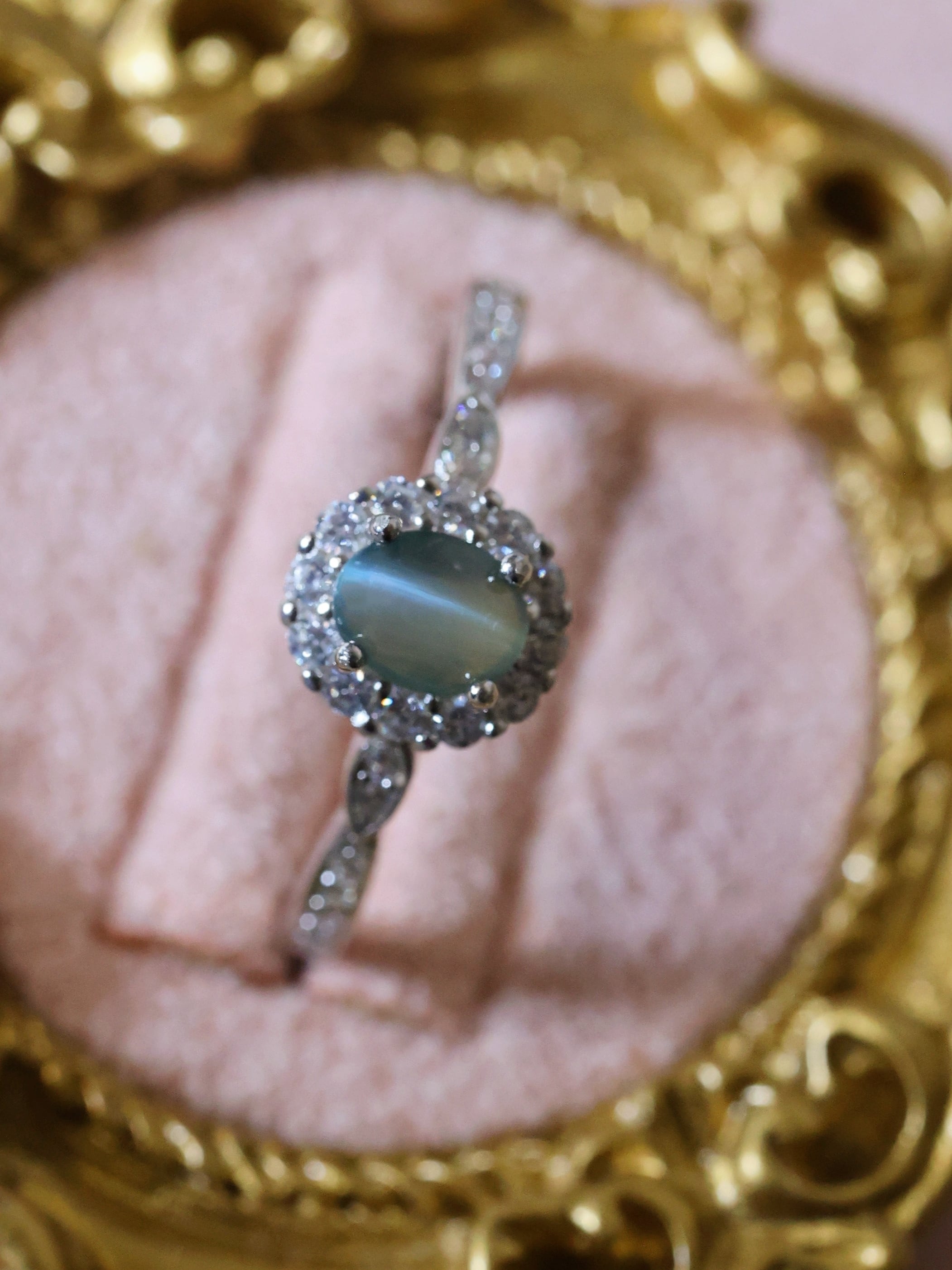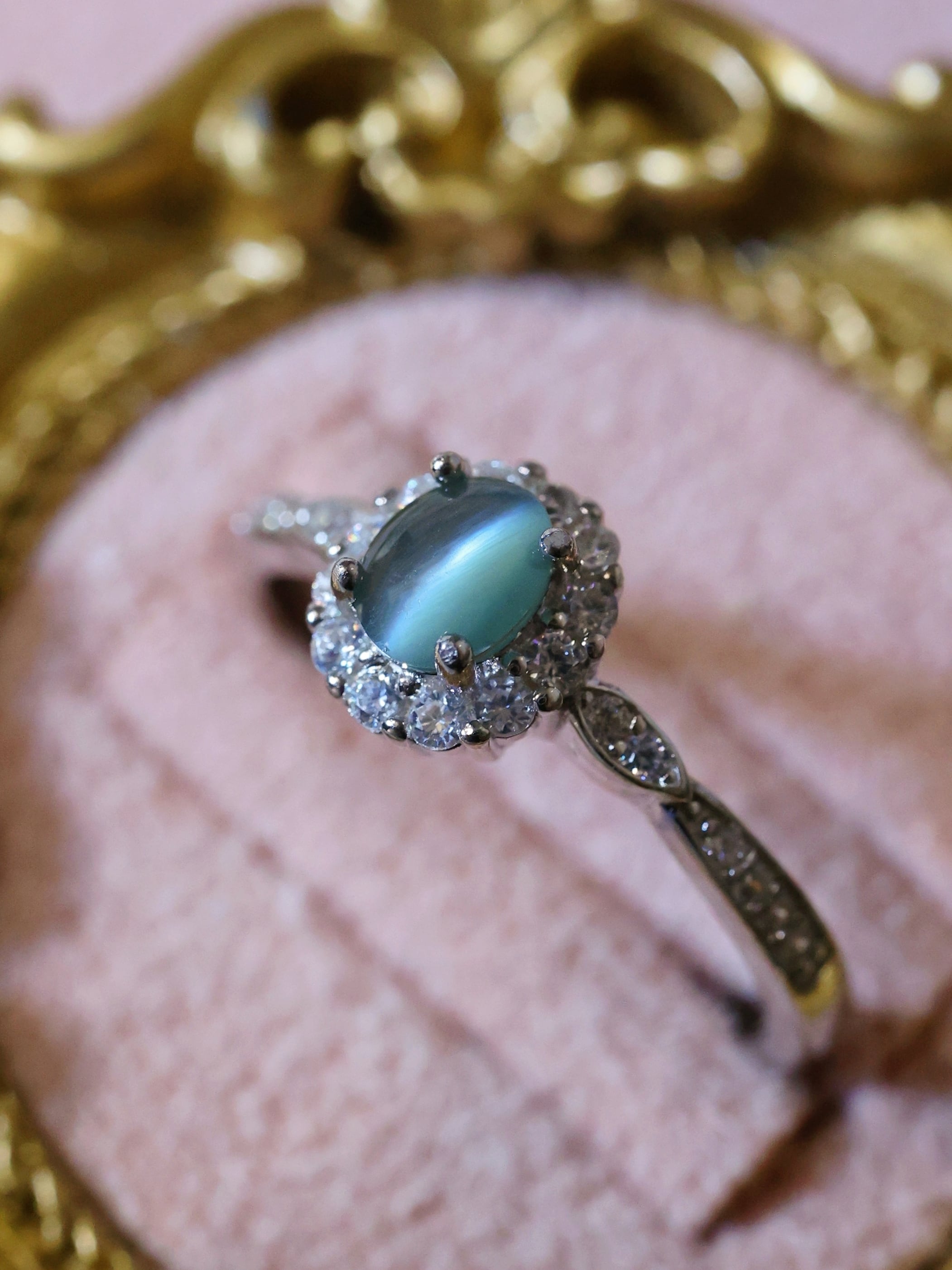 オーバルカボションに整えられた主石は、光を受ける角度によって石の中央に一本、はっきりとしたキャッツアイを現します。