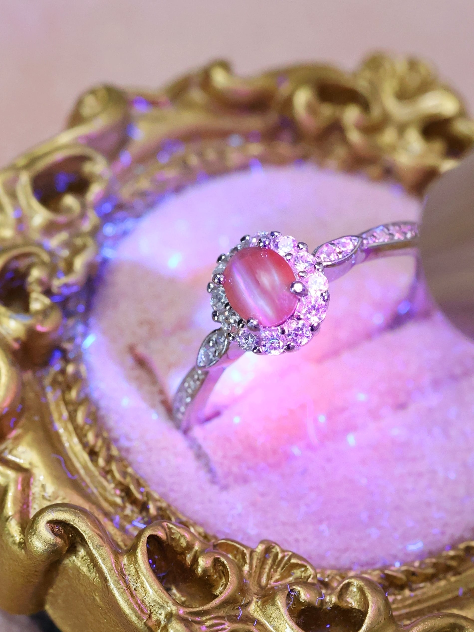 自然光・室内光・紫外光下でそれぞれ異なる表情を見せ、アレキサンドライトならではの色調変化と、キャッツアイ効果の両方を同時に楽しめます。