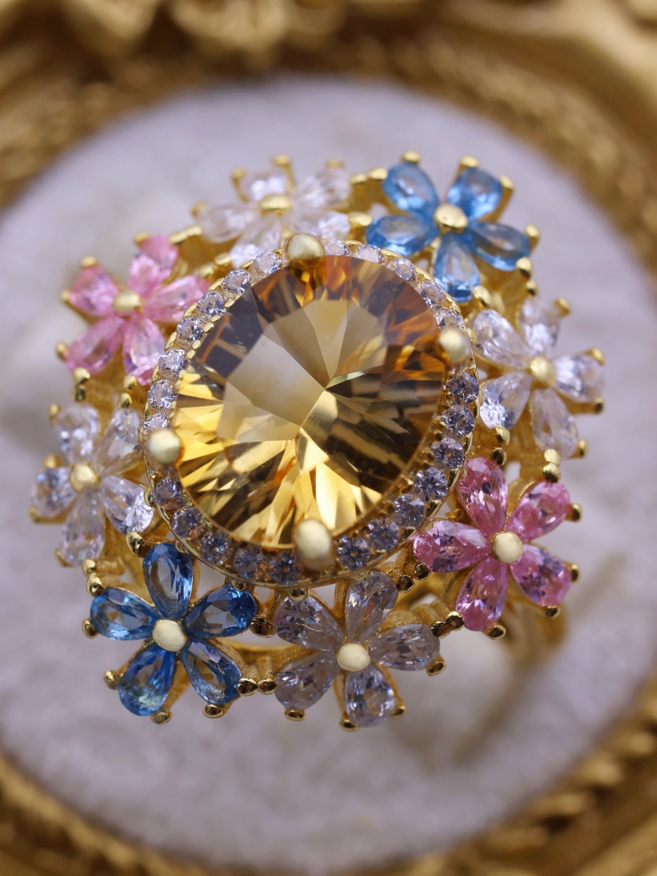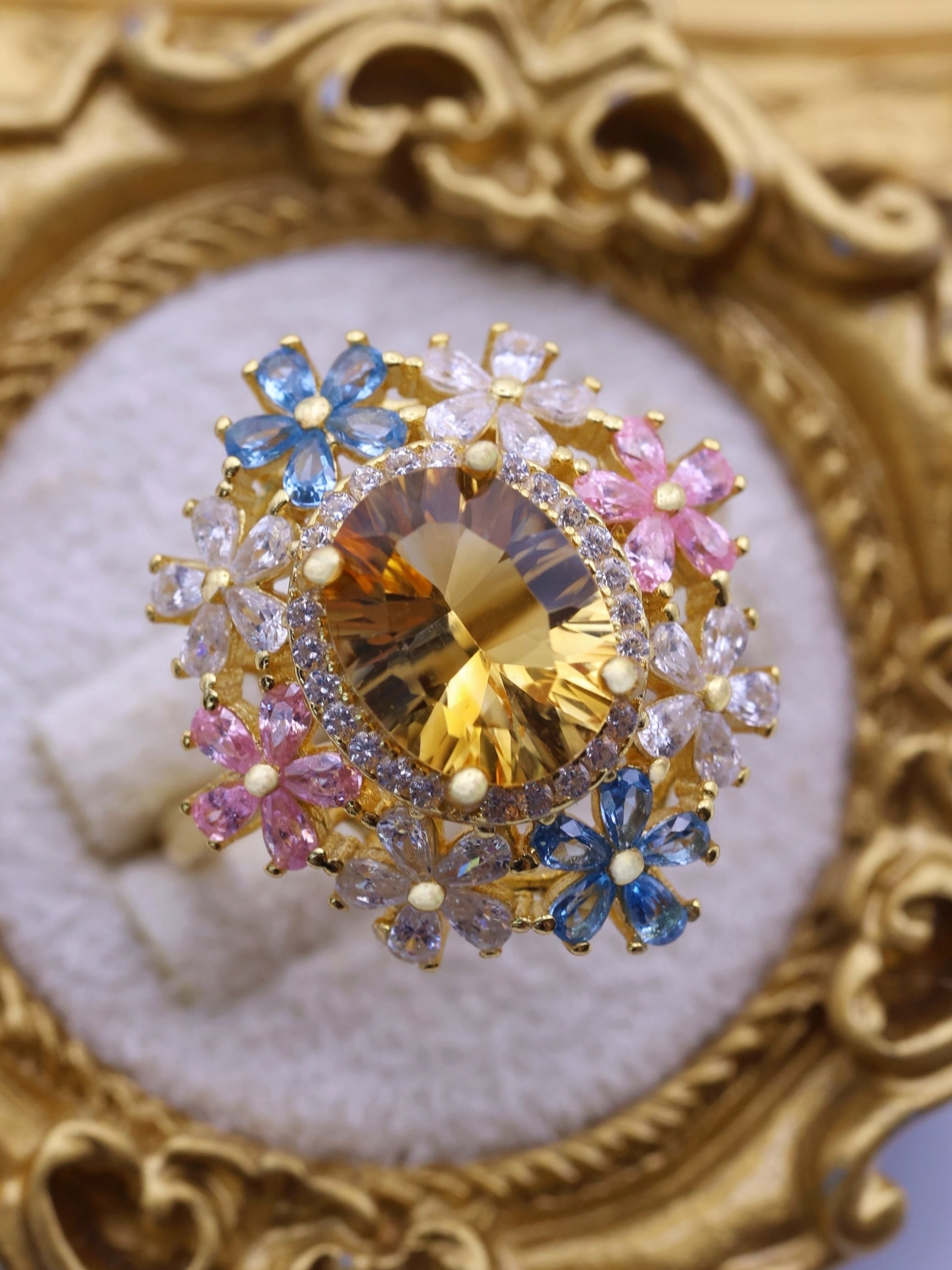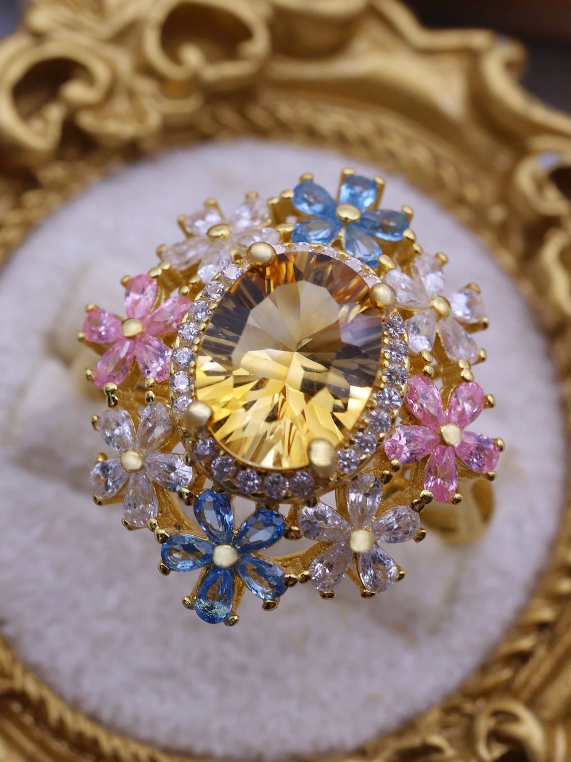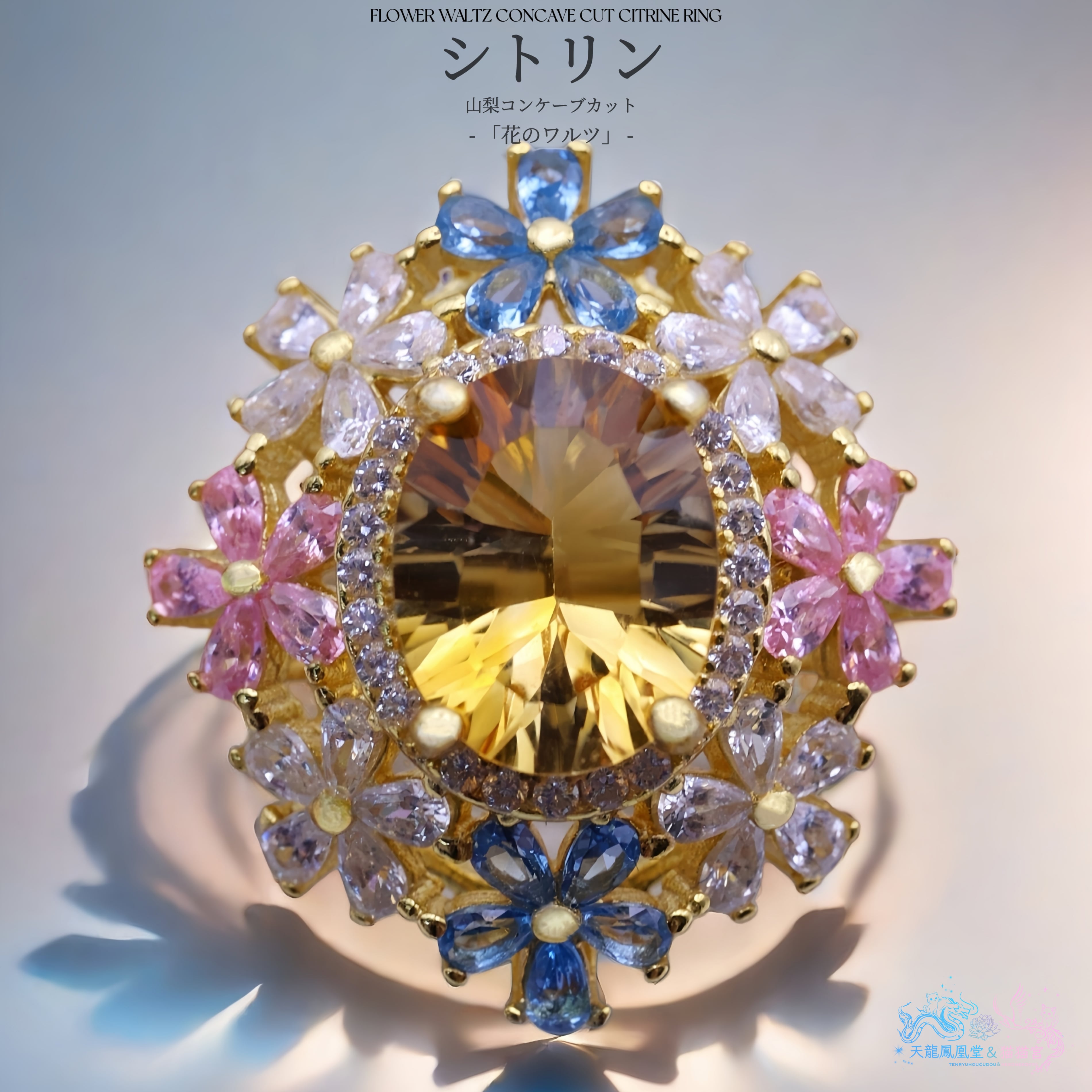 7×9mm・約2.3カラットの大粒シトリンを主役に、咲き誇る花々が舞い踊るような、幻想的で優美なリング。