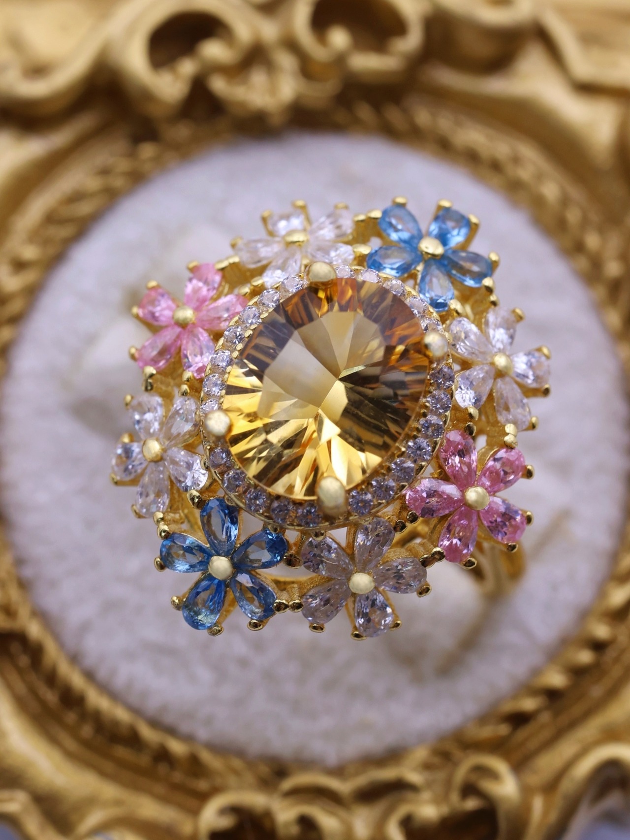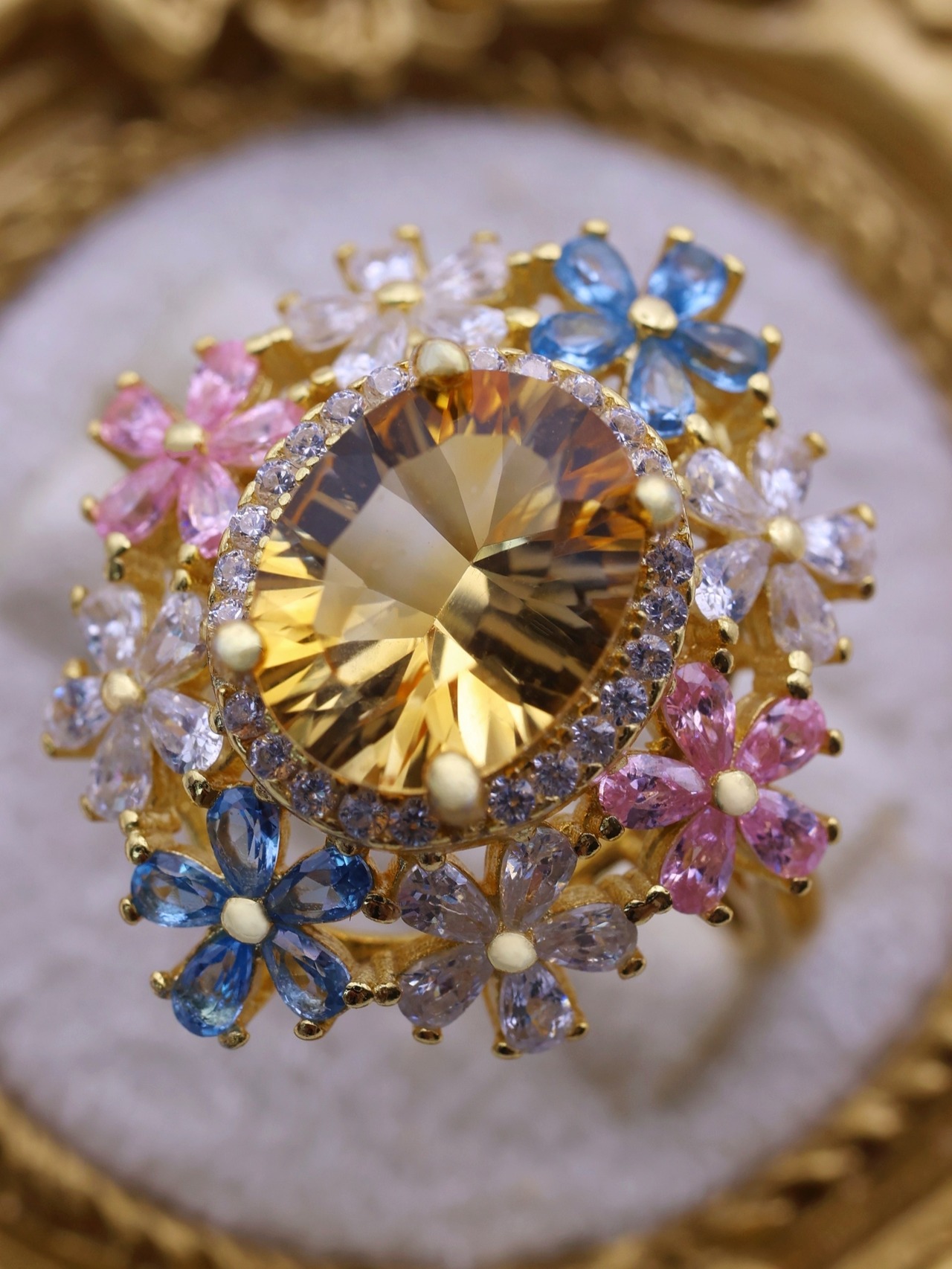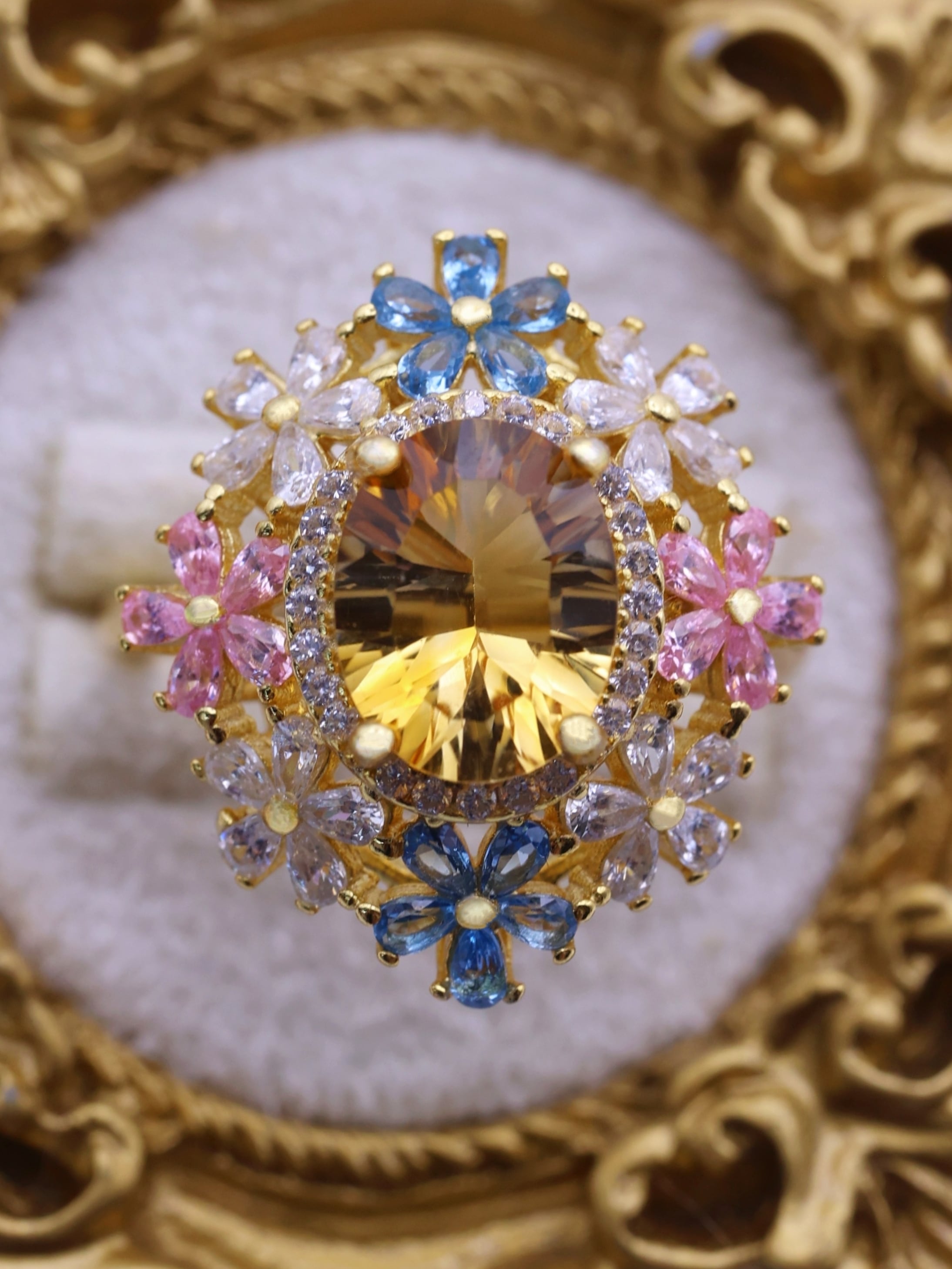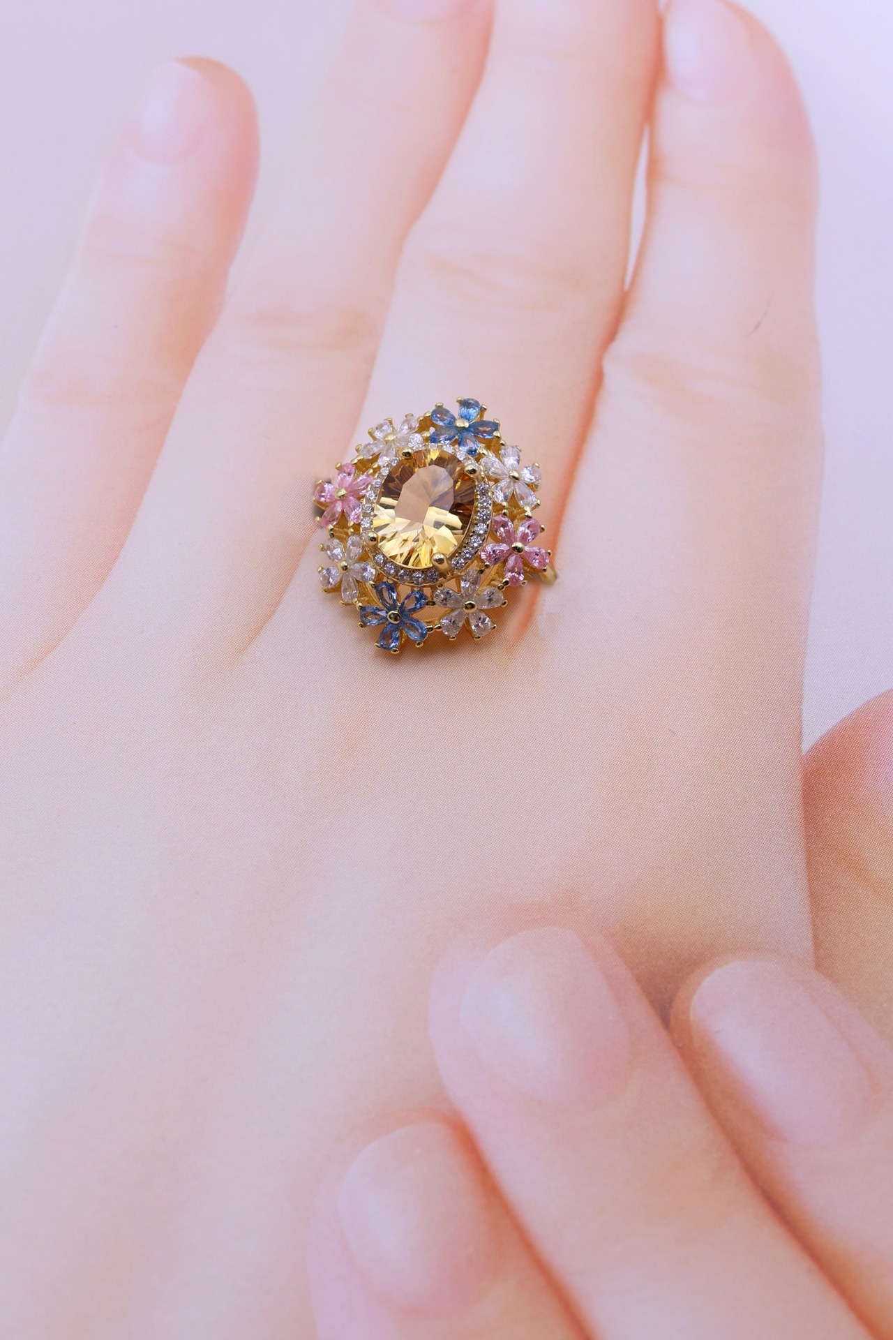 7×9mm・約2.3カラットの大粒シトリンを主役に、咲き誇る花々が舞い踊るような、幻想的で優美なリング。