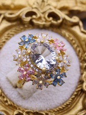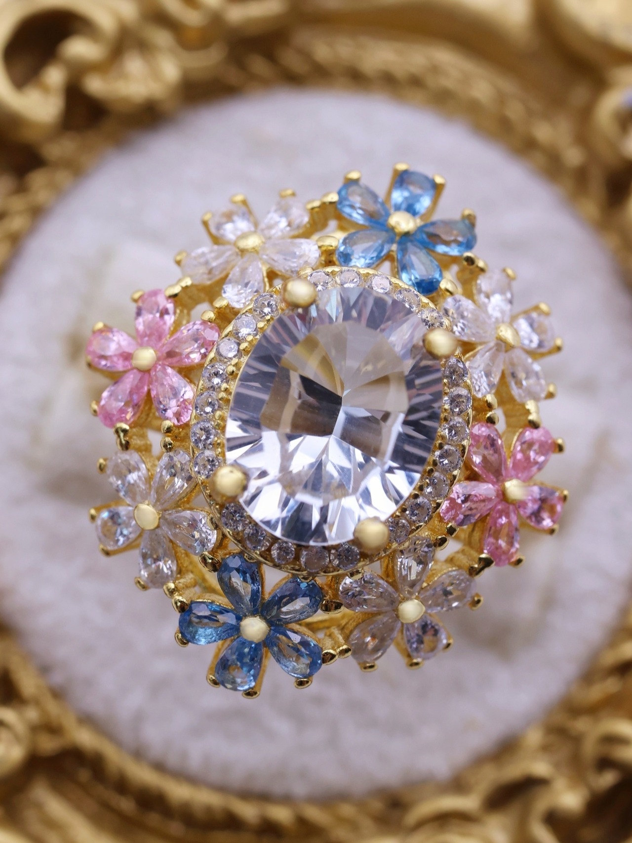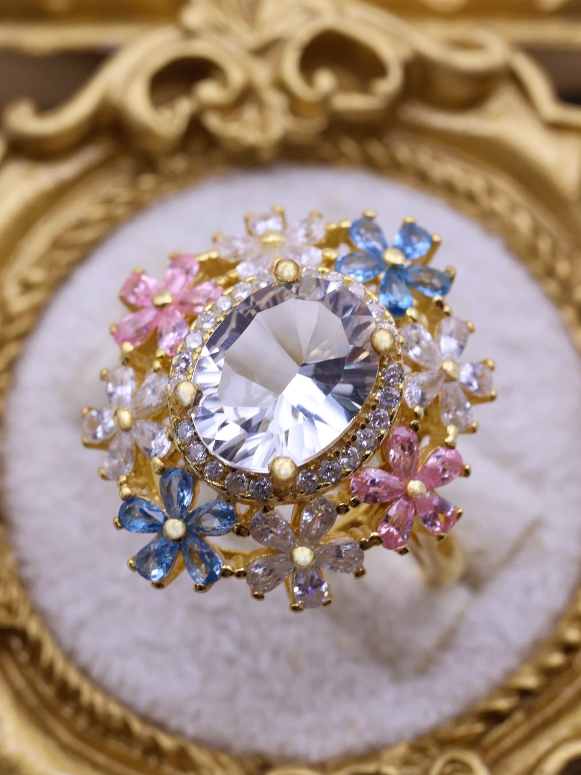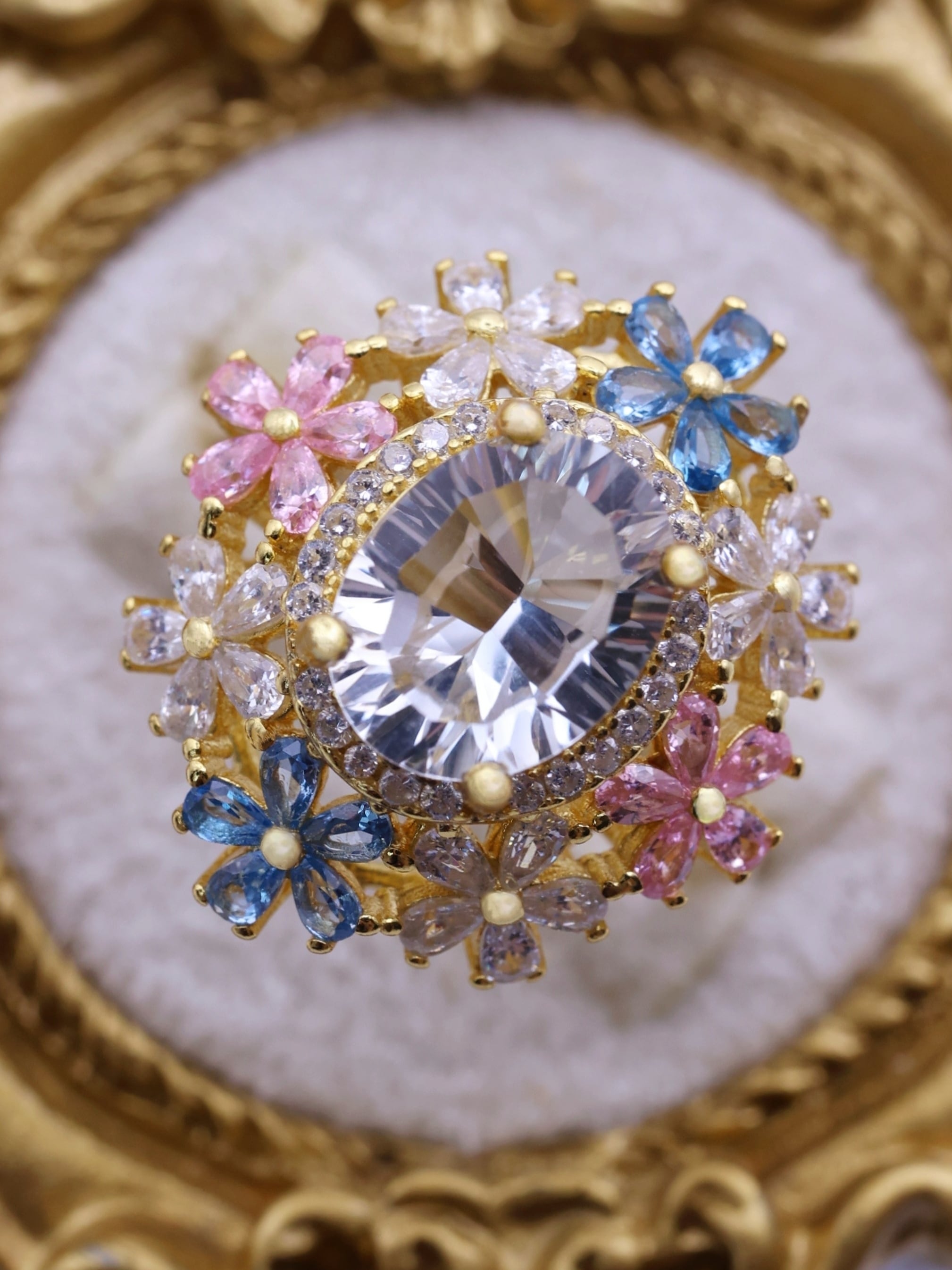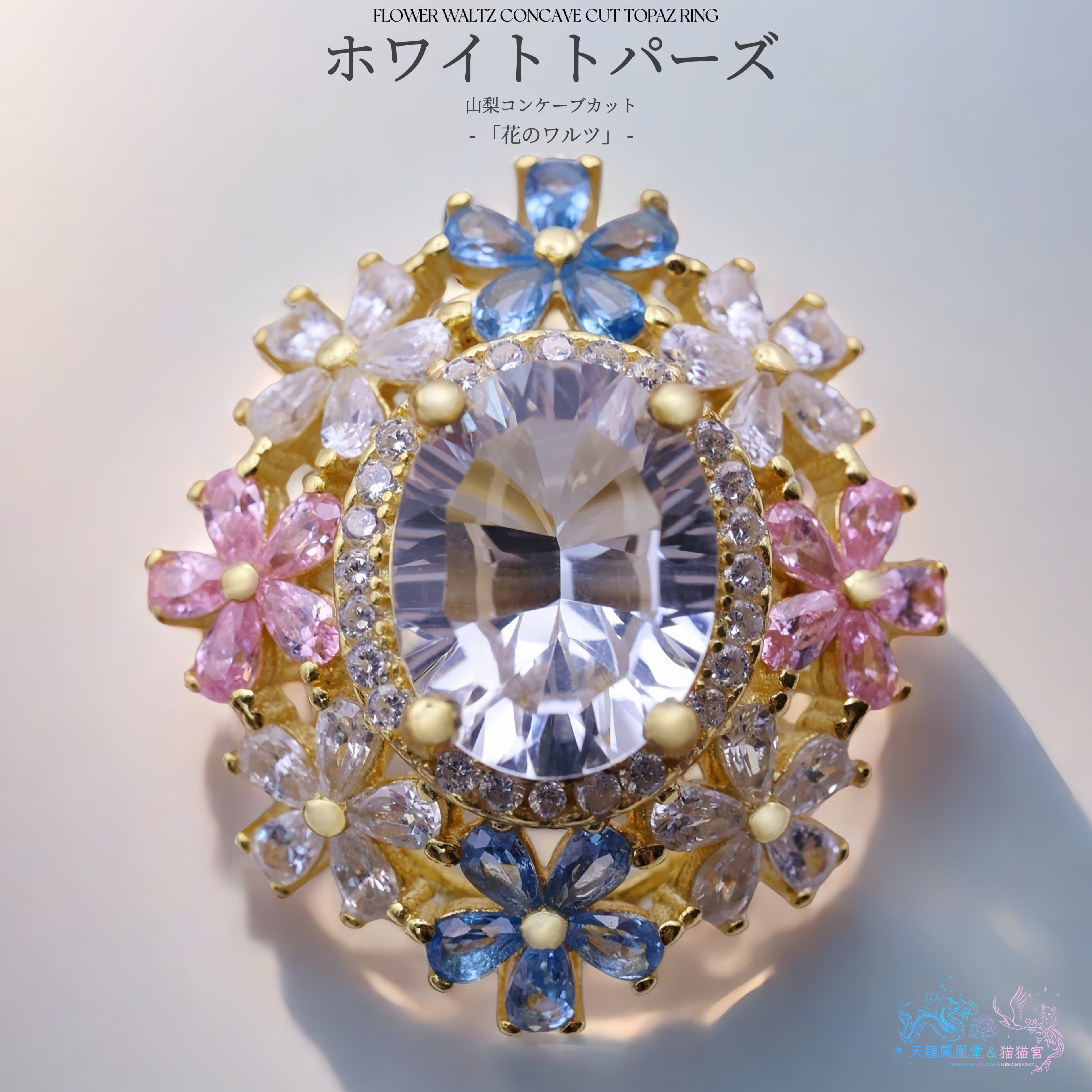 7×9mm・約2.3カラットの大粒ホワイトトパーズを主役に、咲き誇る花々が舞い踊るような、幻想的で優美なリング。