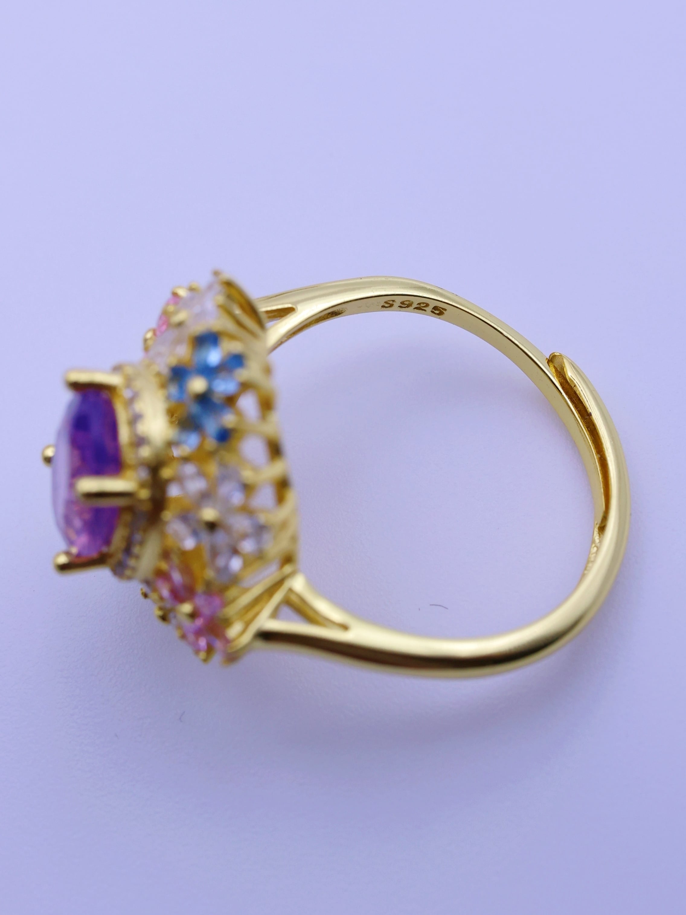リング全体に舞い踊る花々をあしらい、主石の周囲にはピンク・ブルー・ホワイトのジルコニアを贅沢に配置しました。