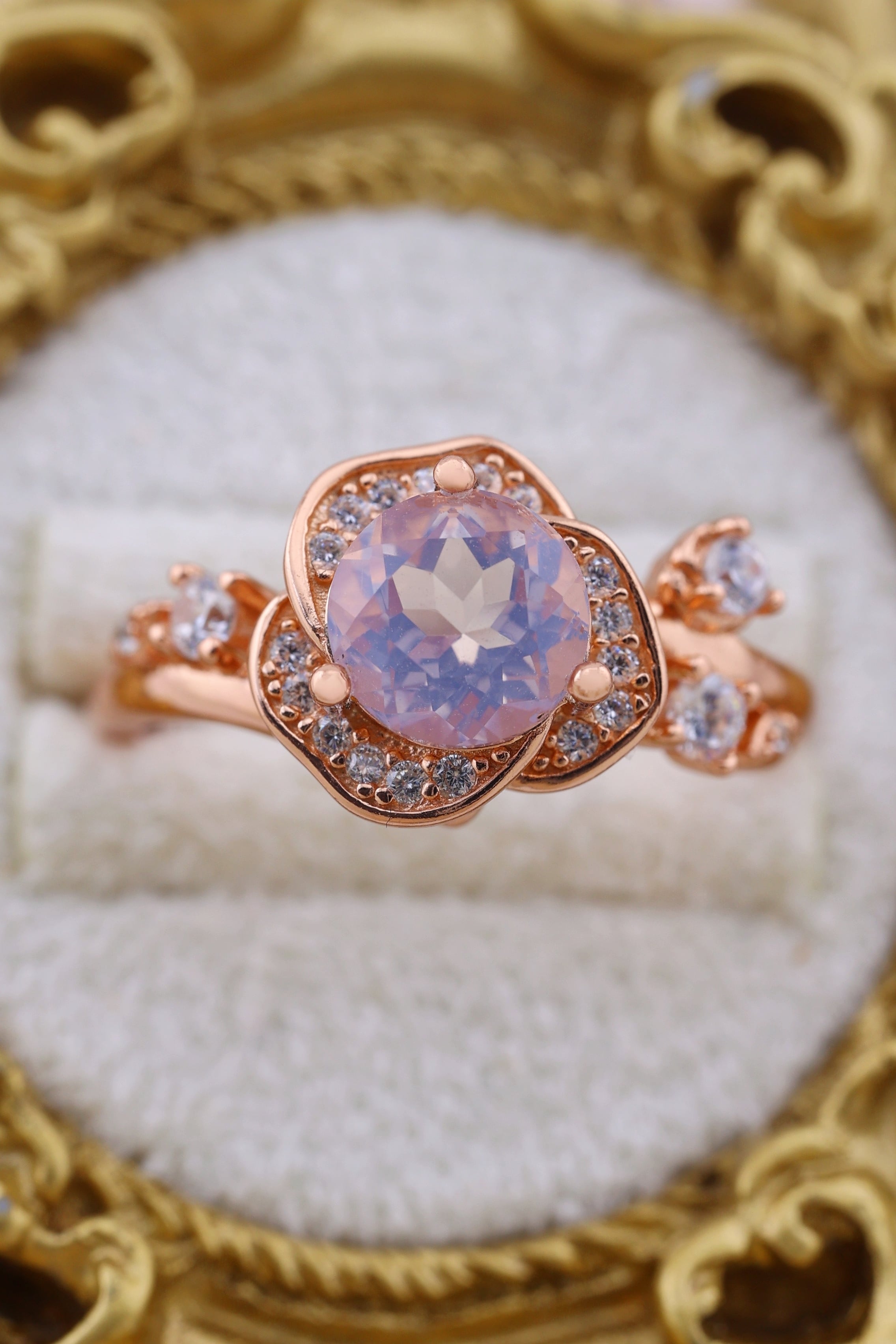 周囲には7Aグレードのジルコニアを配し、花びらのようなディテールで女性らしい柔らかさを表現しています。エレガントかつ上品なこのリングは、日常使いにも特別な日の装いにもぴったりの一品です。