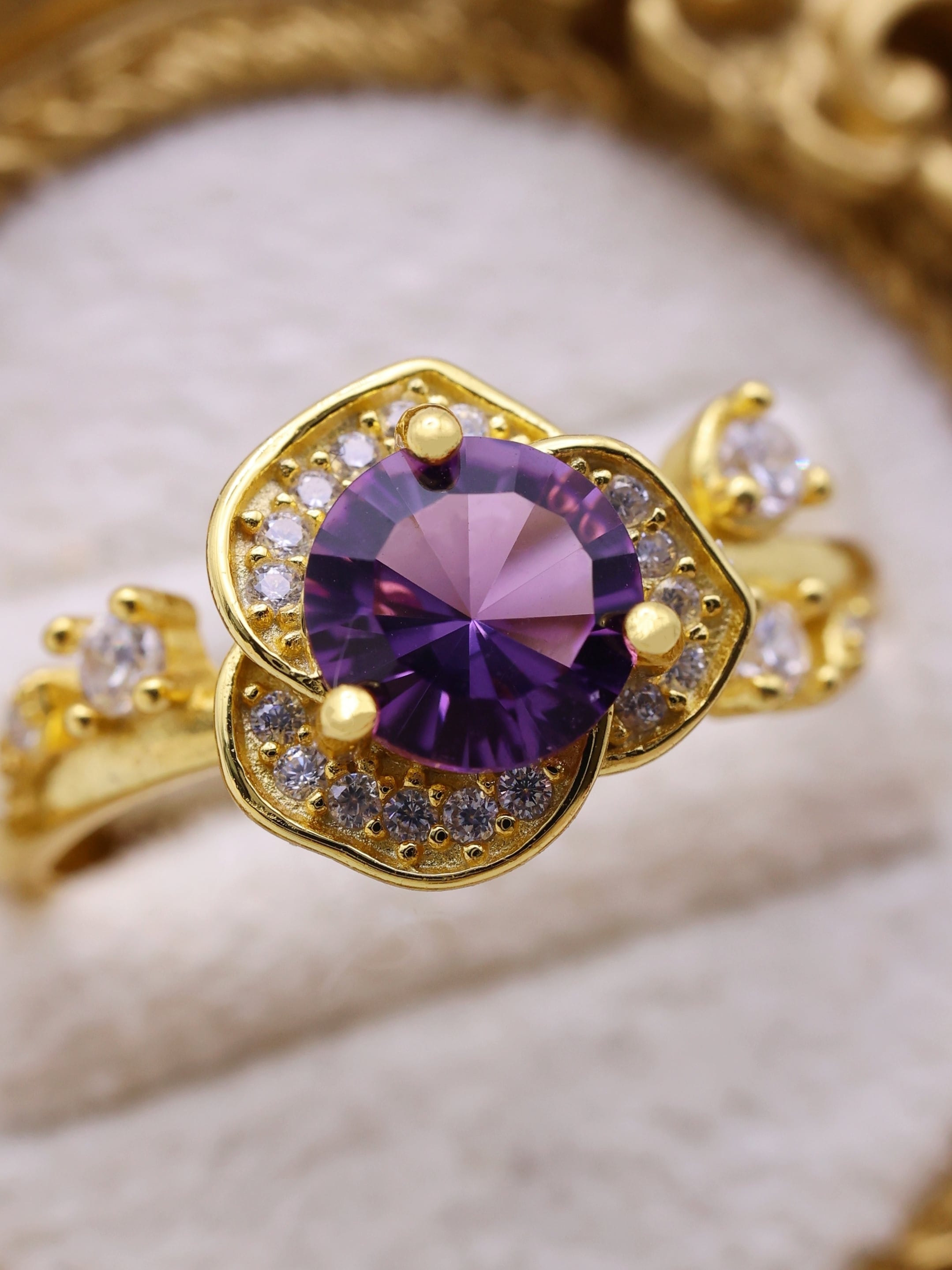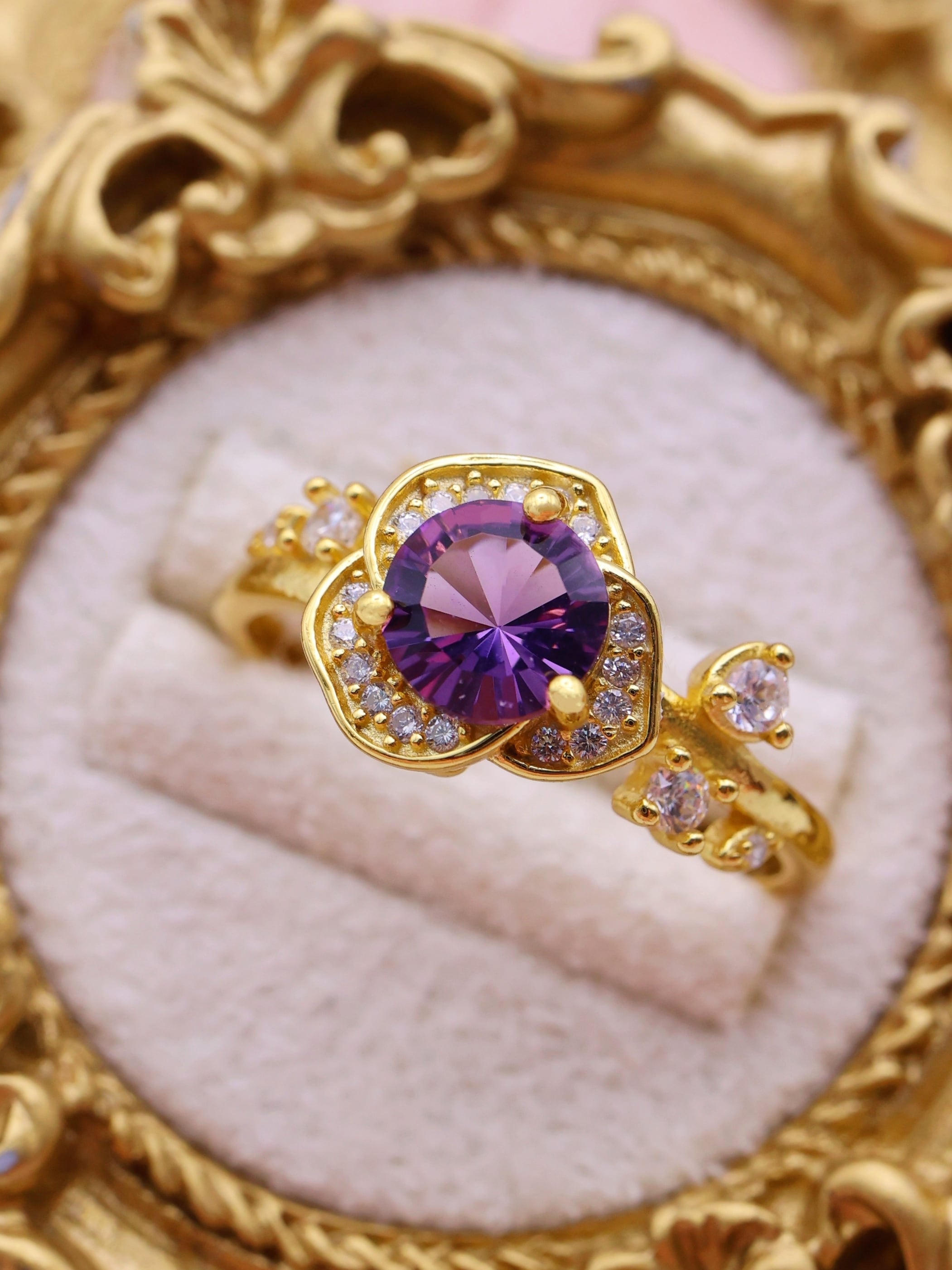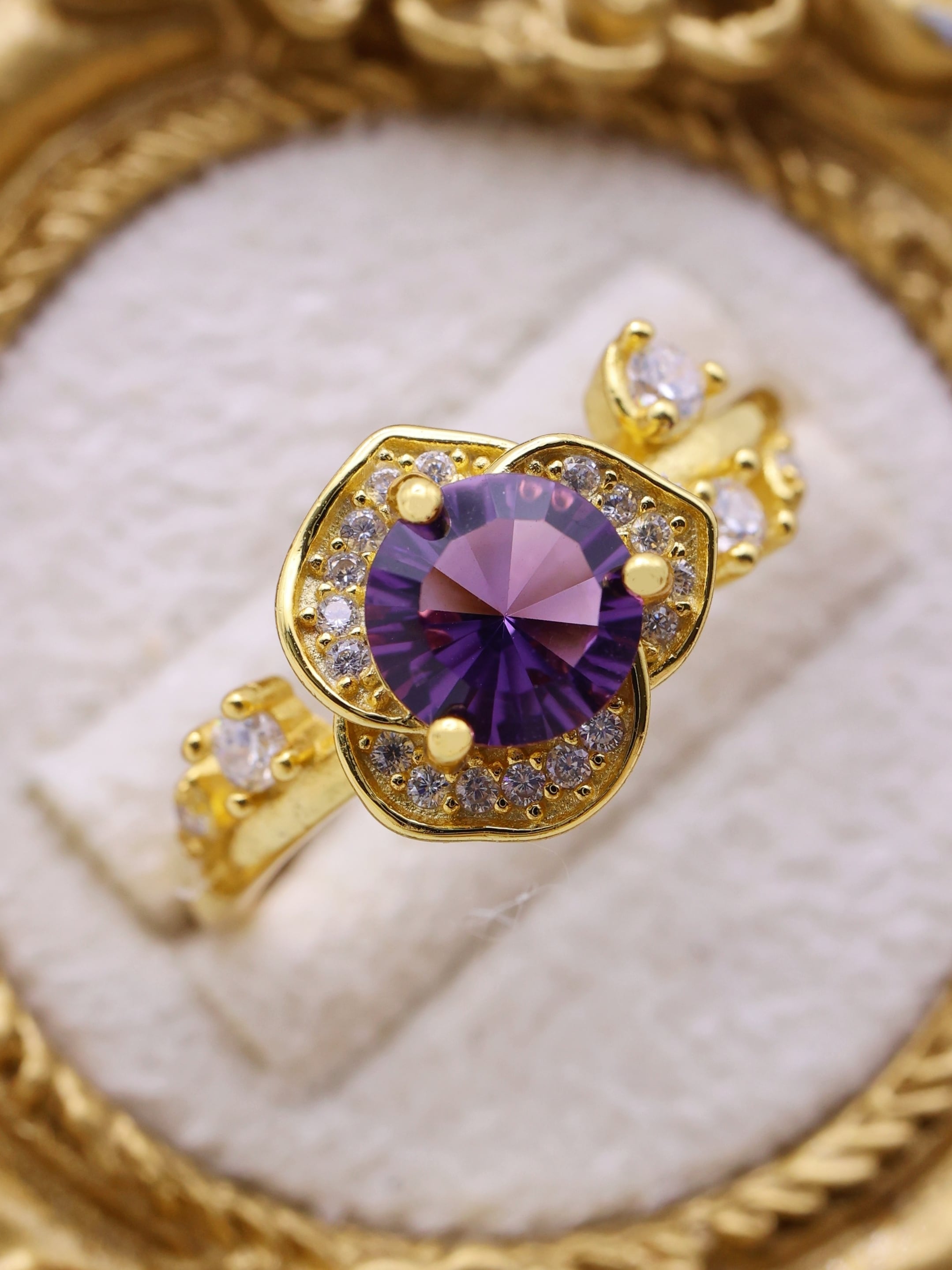 K18イエローゴールドの地金が、アメジストの紫にあたたかな艶を添え、全体をより華やかで優美な印象に仕立てています。