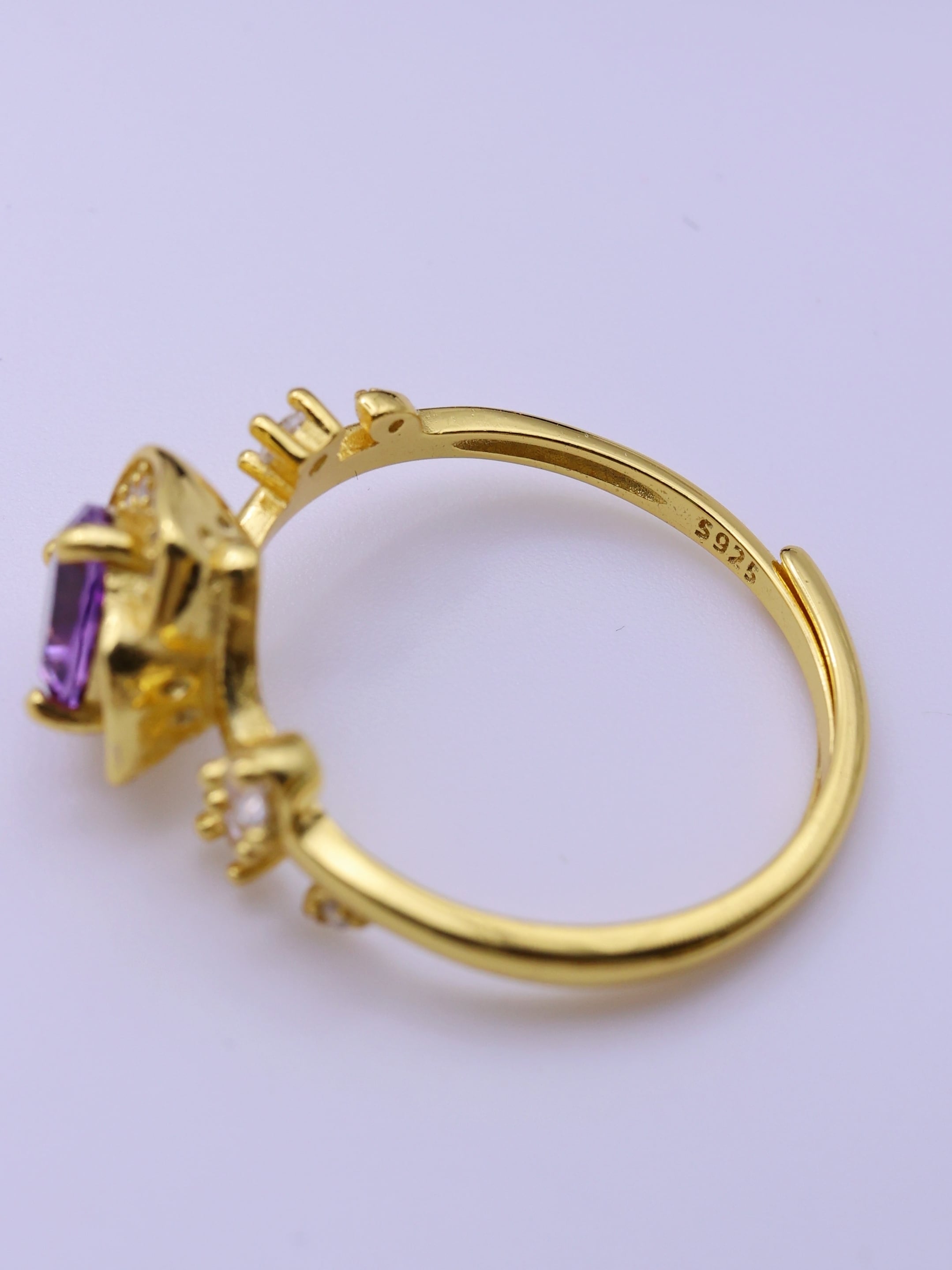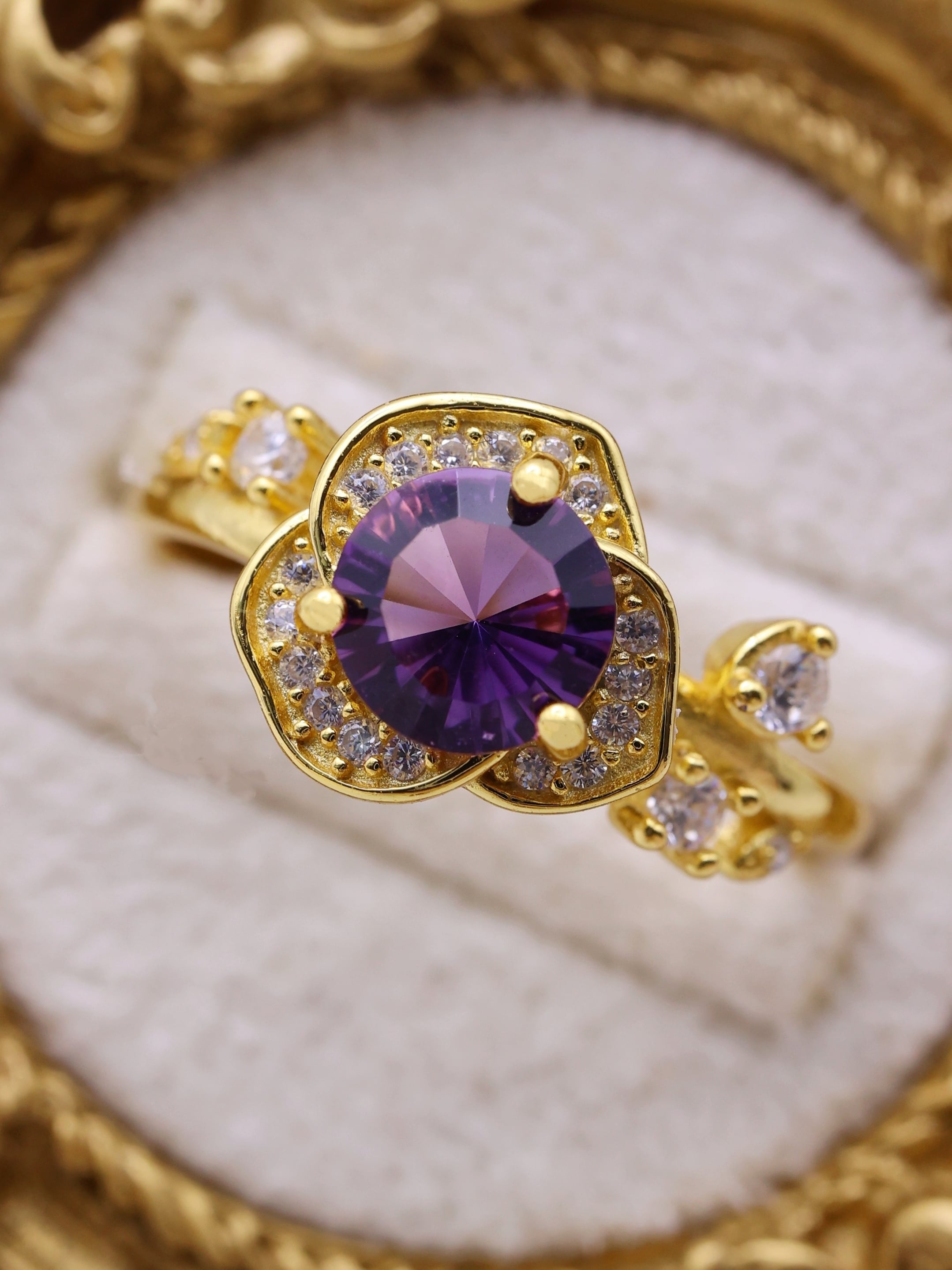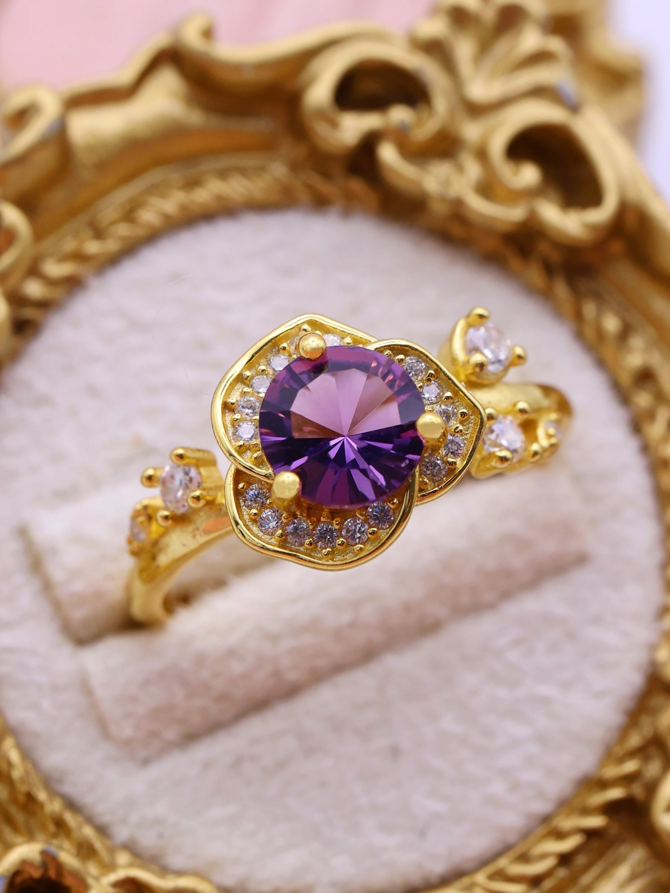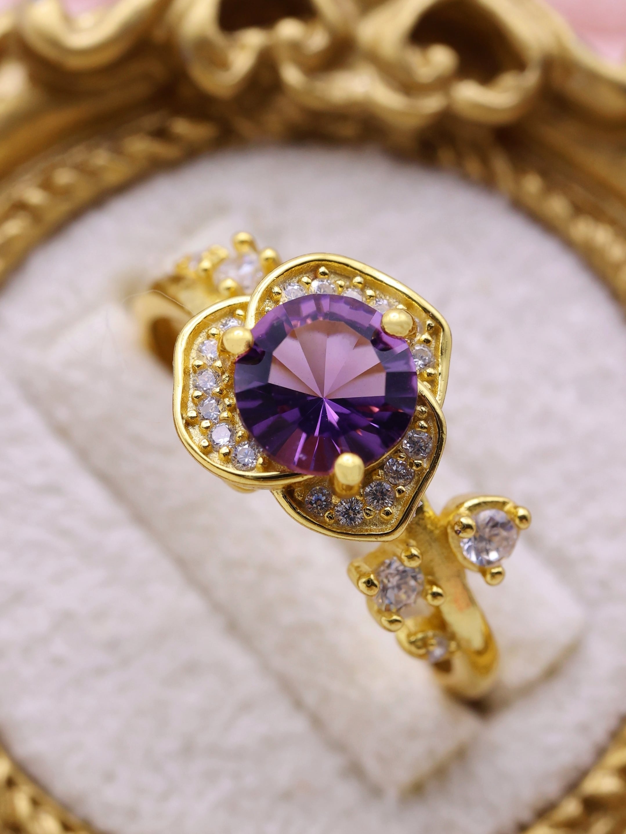 K18イエローゴールドの地金が、アメジストの紫にあたたかな艶を添え、全体をより華やかで優美な印象に仕立てています。