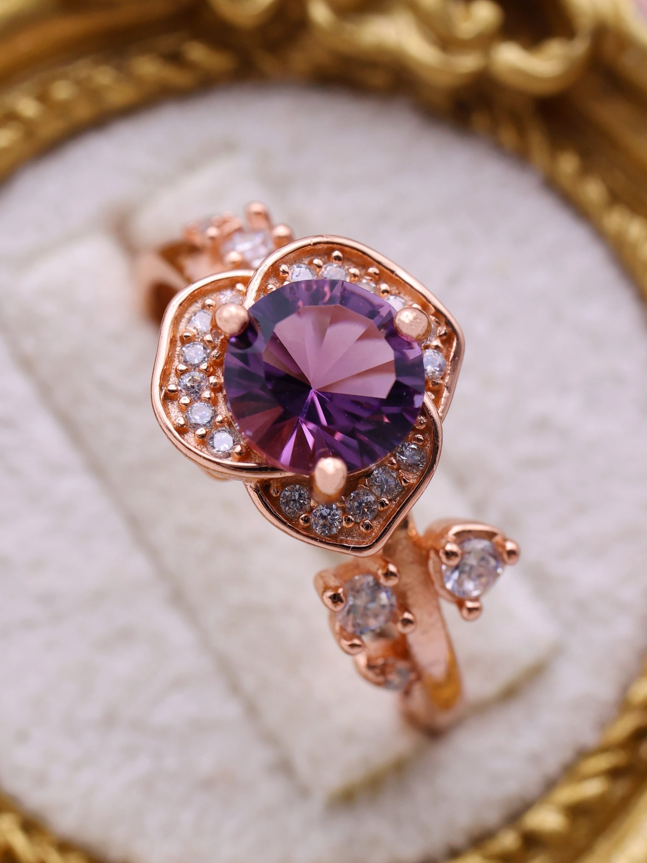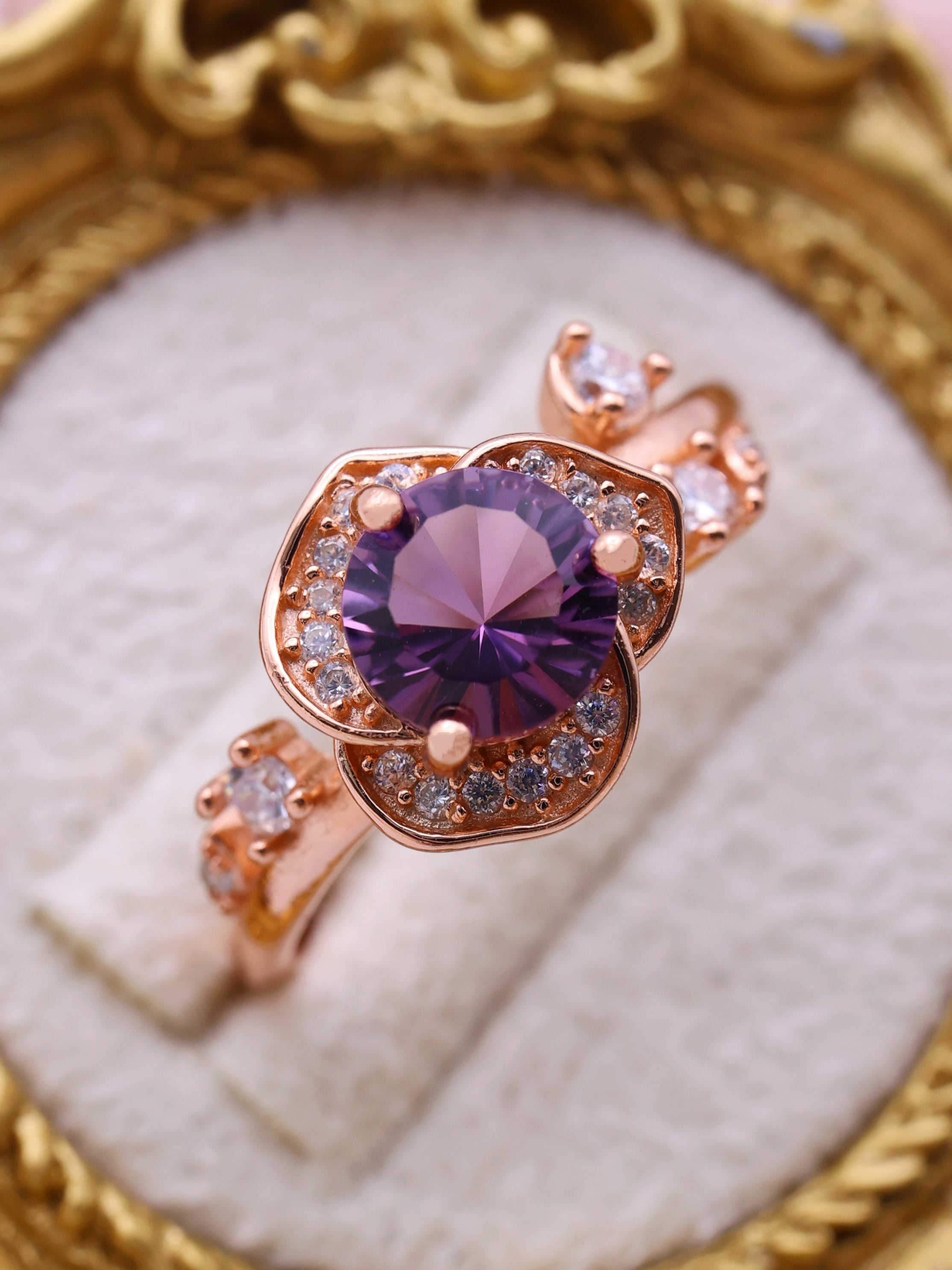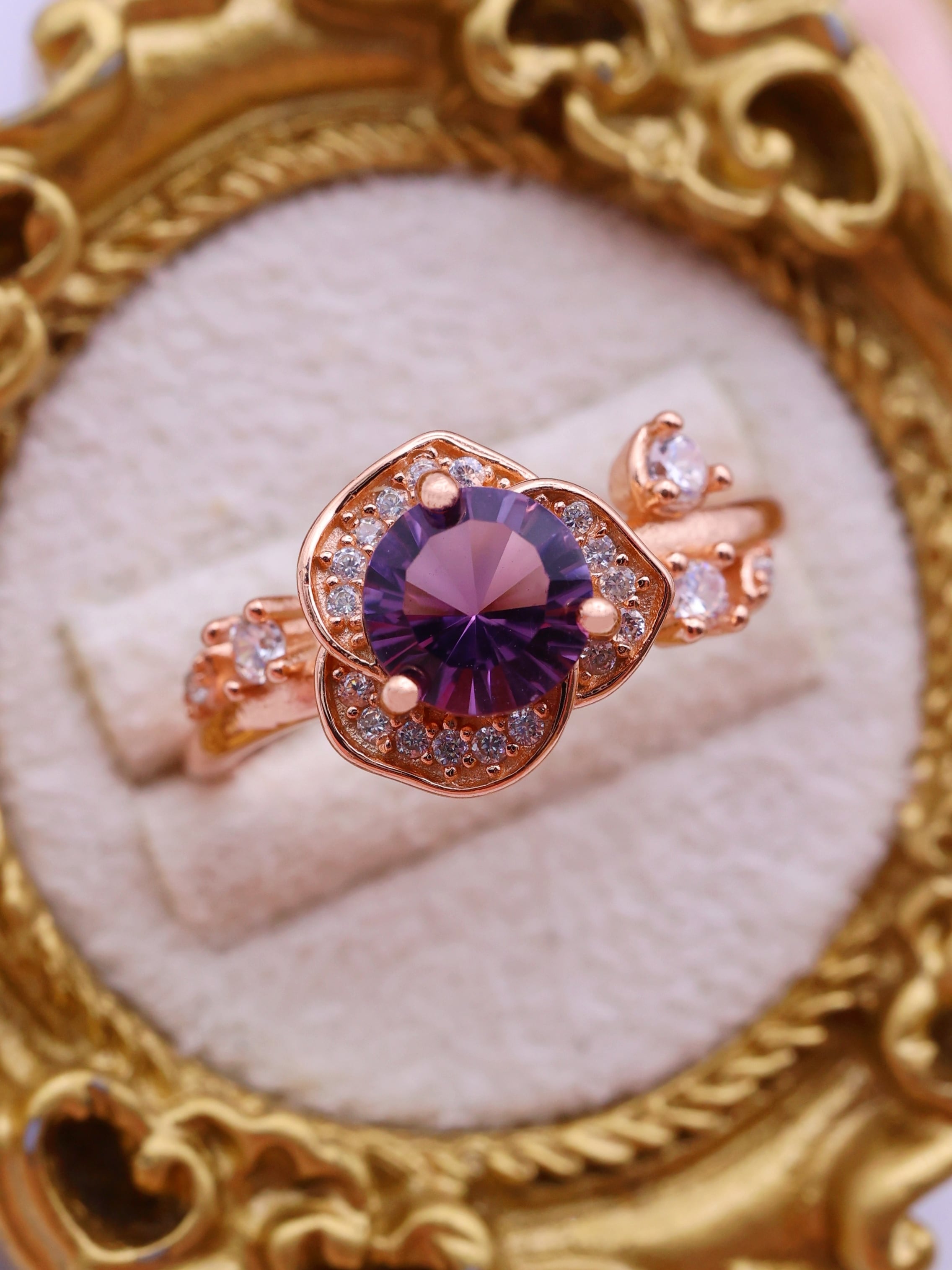 K18ピンクゴールドの柔らかな輝きが、アメジストの紫にほのかな温もりを添え、全体を優雅でロマンティックな印象に仕立てています。