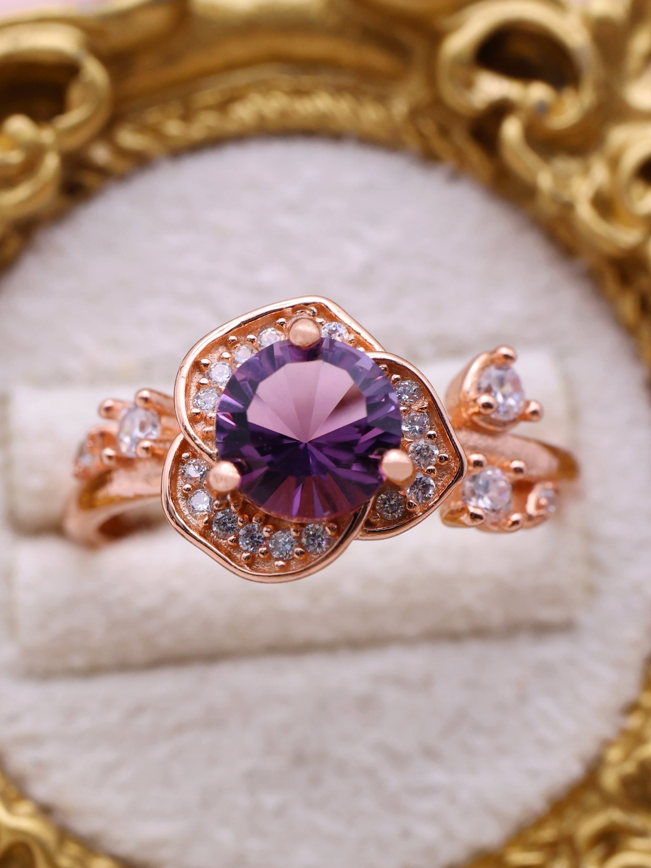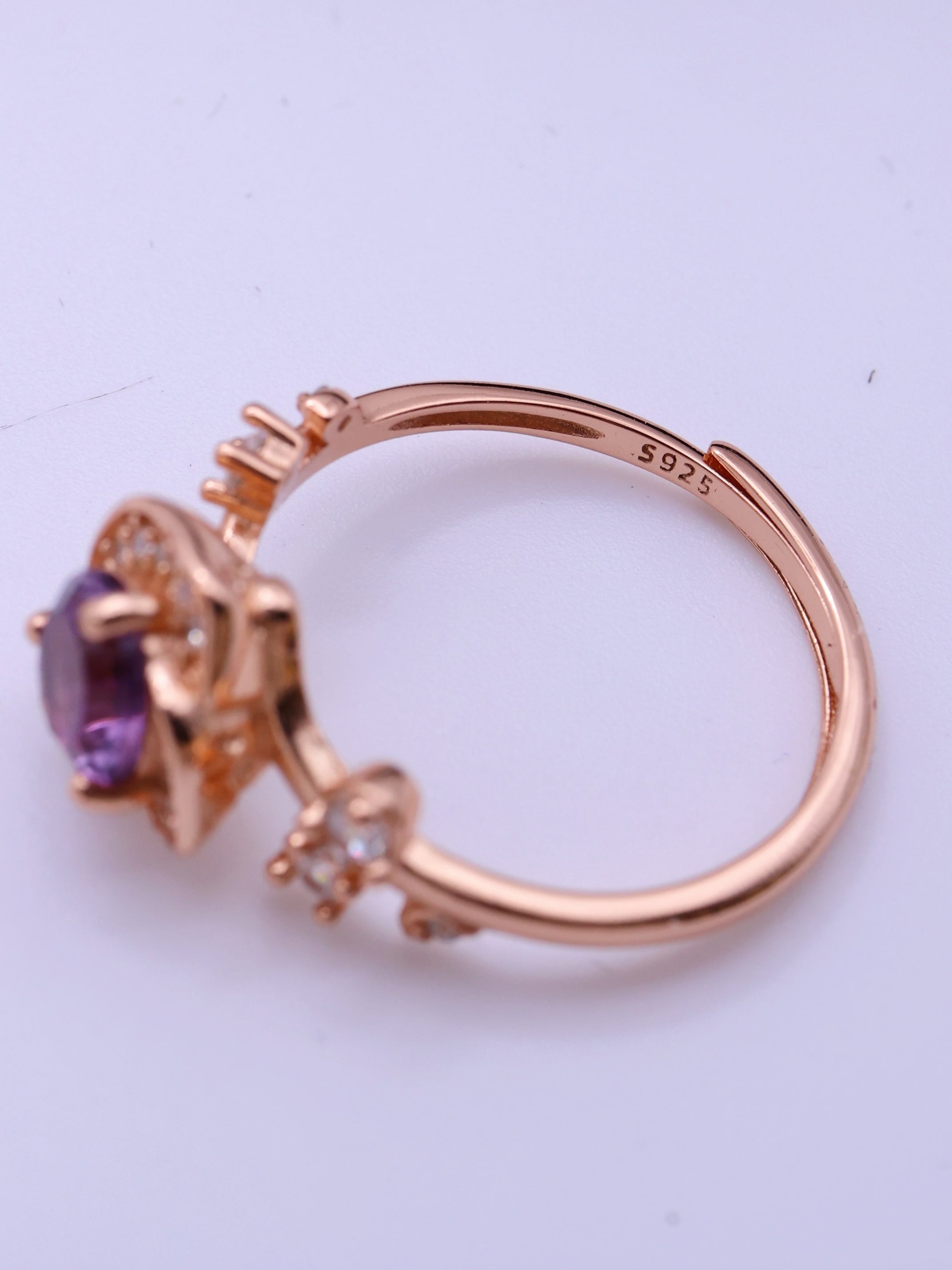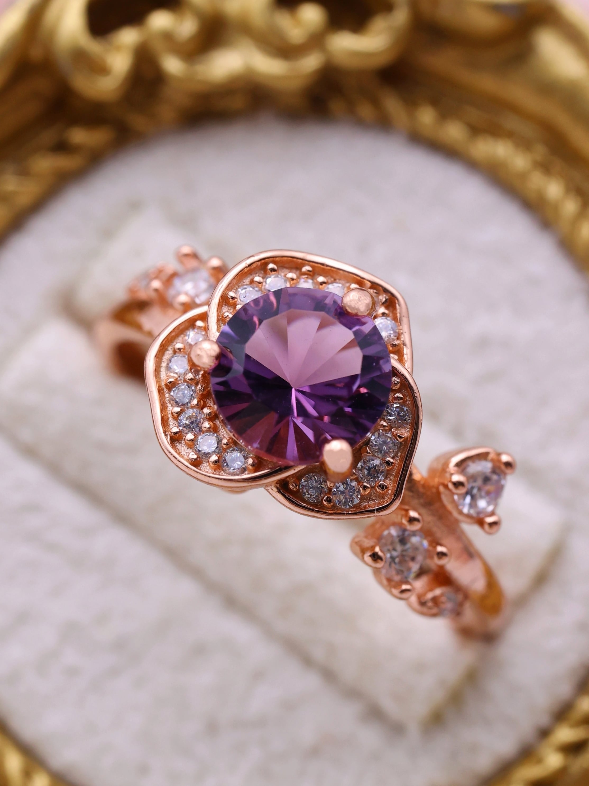 K18ピンクゴールドの柔らかな輝きが、アメジストの紫にほのかな温もりを添え、全体を優雅でロマンティックな印象に仕立てています。