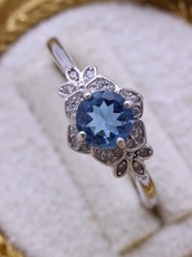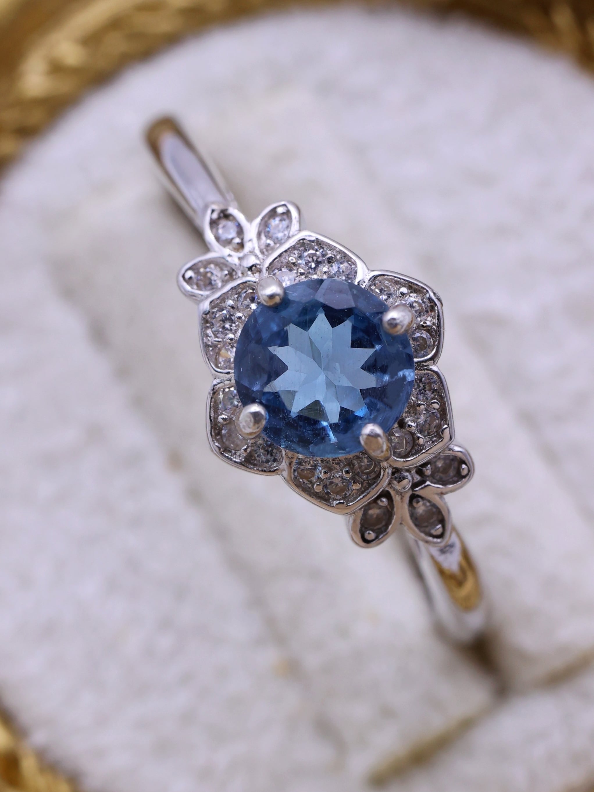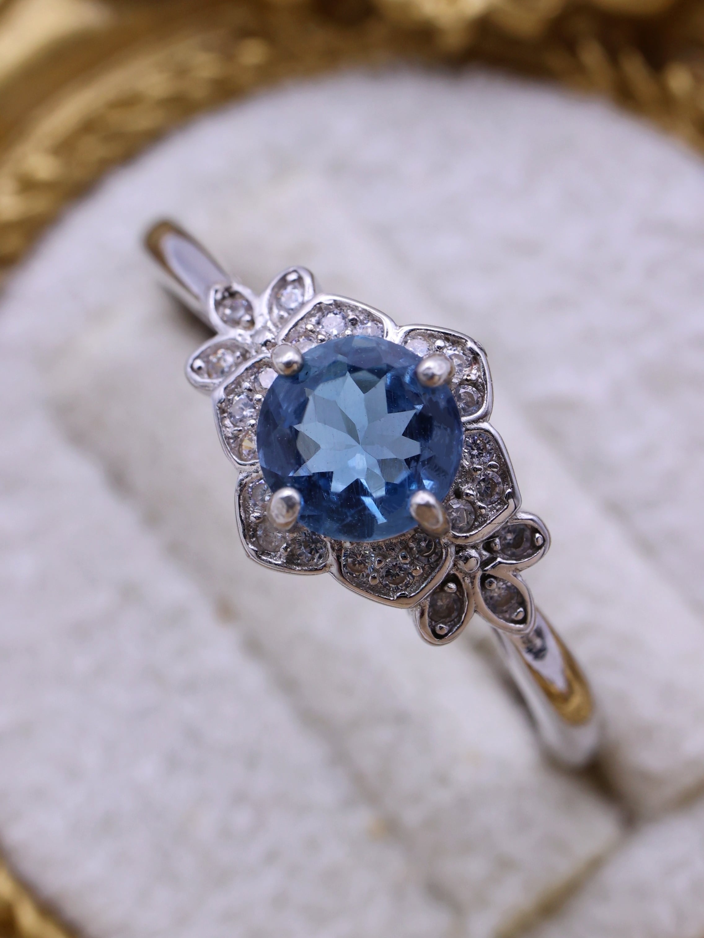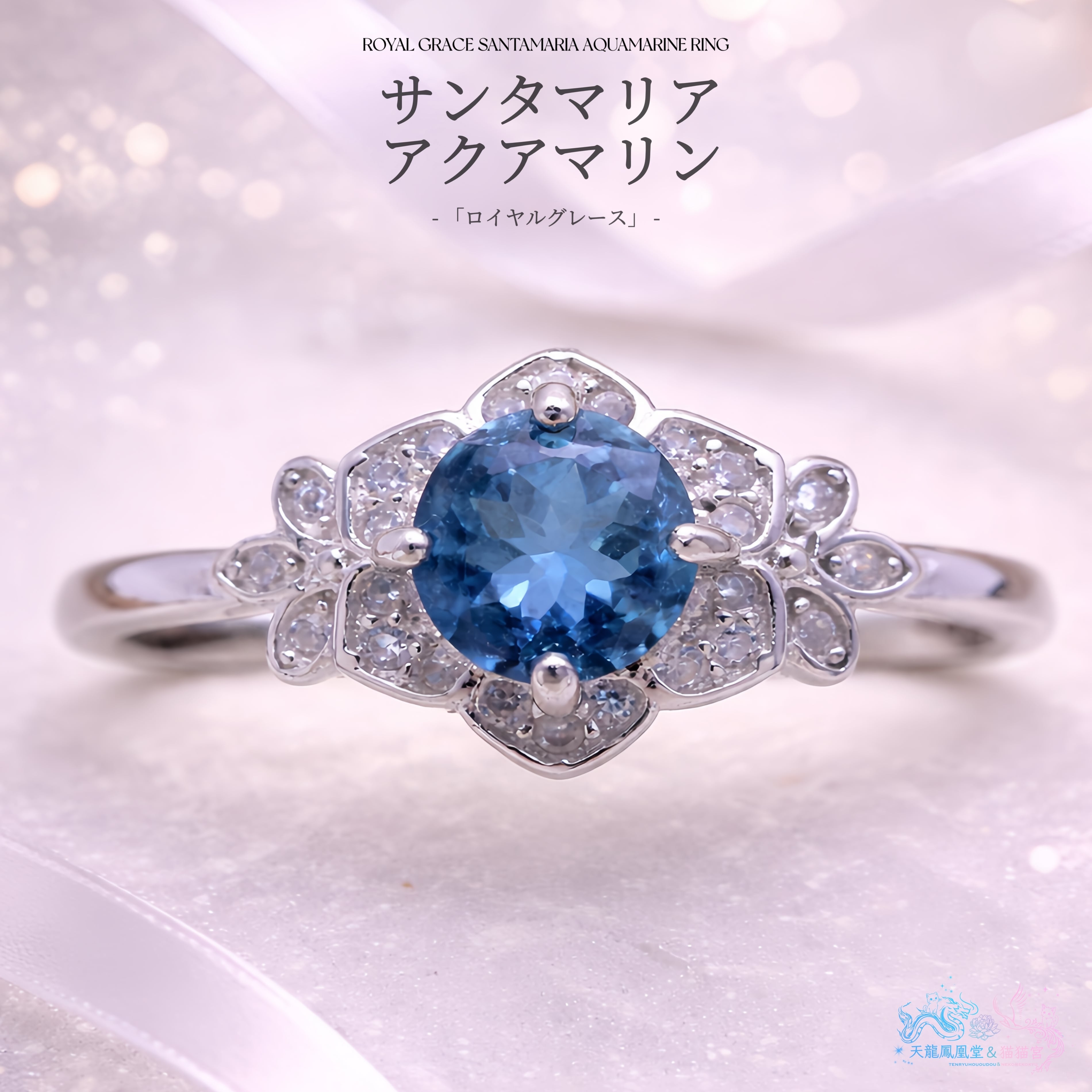 石座には、7Aグレードの高品質ジルコニアを花の花弁のように配置し、中央のアクアマリンを優しく包み込むようなデザインに。