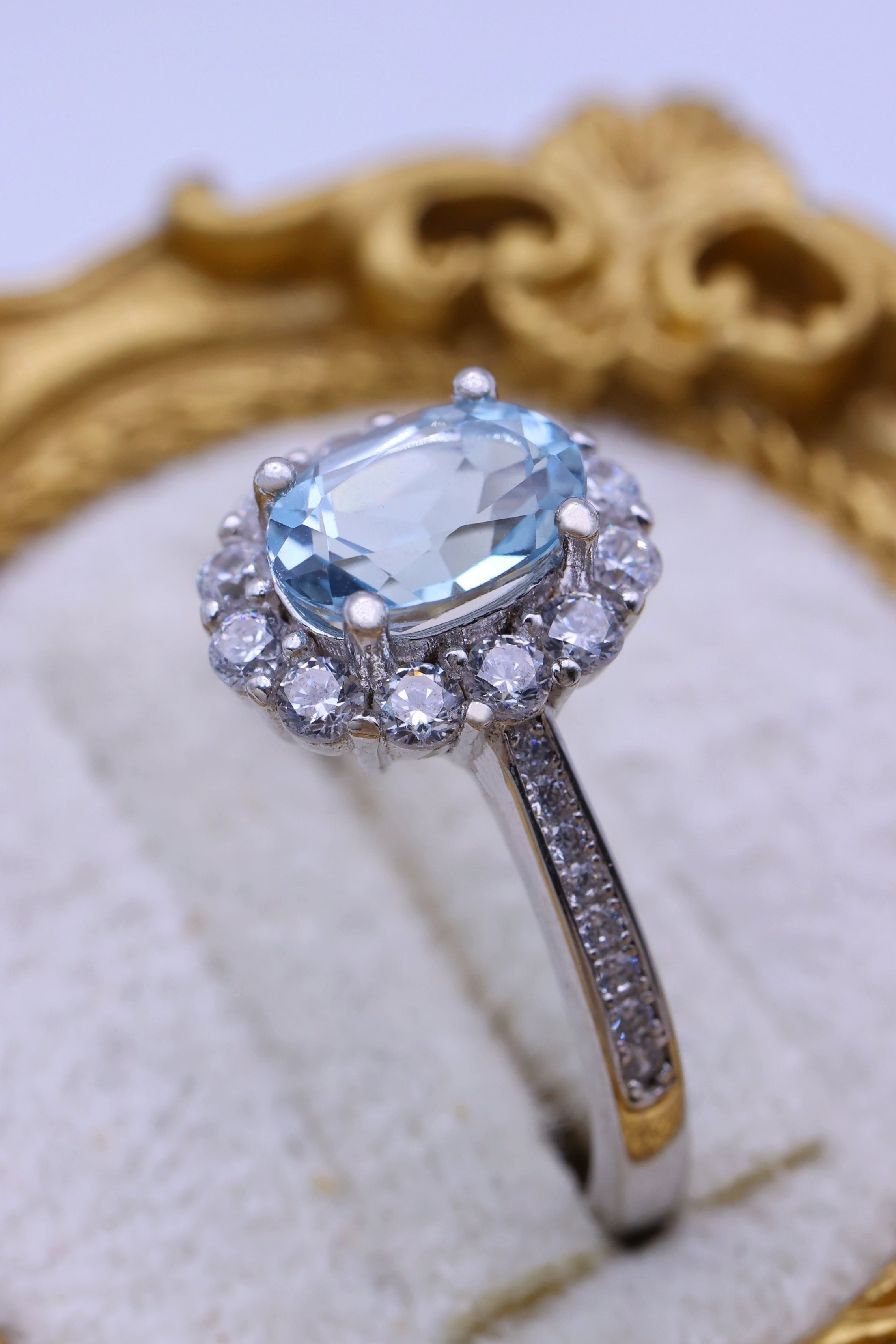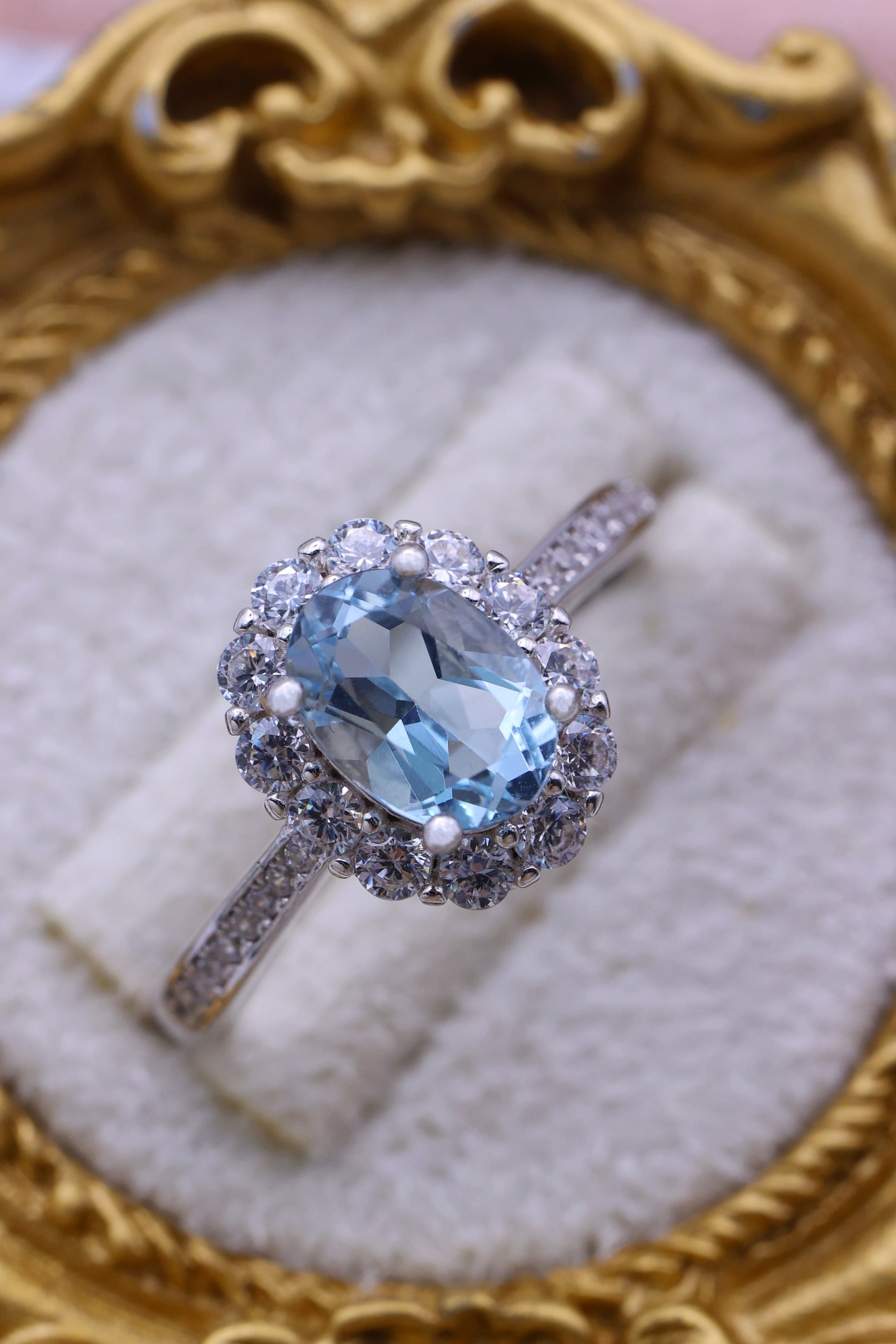 淡いブルーの中に、凛とした青の芯を感じさせるアクアマリンを主役に仕立てたリングです。