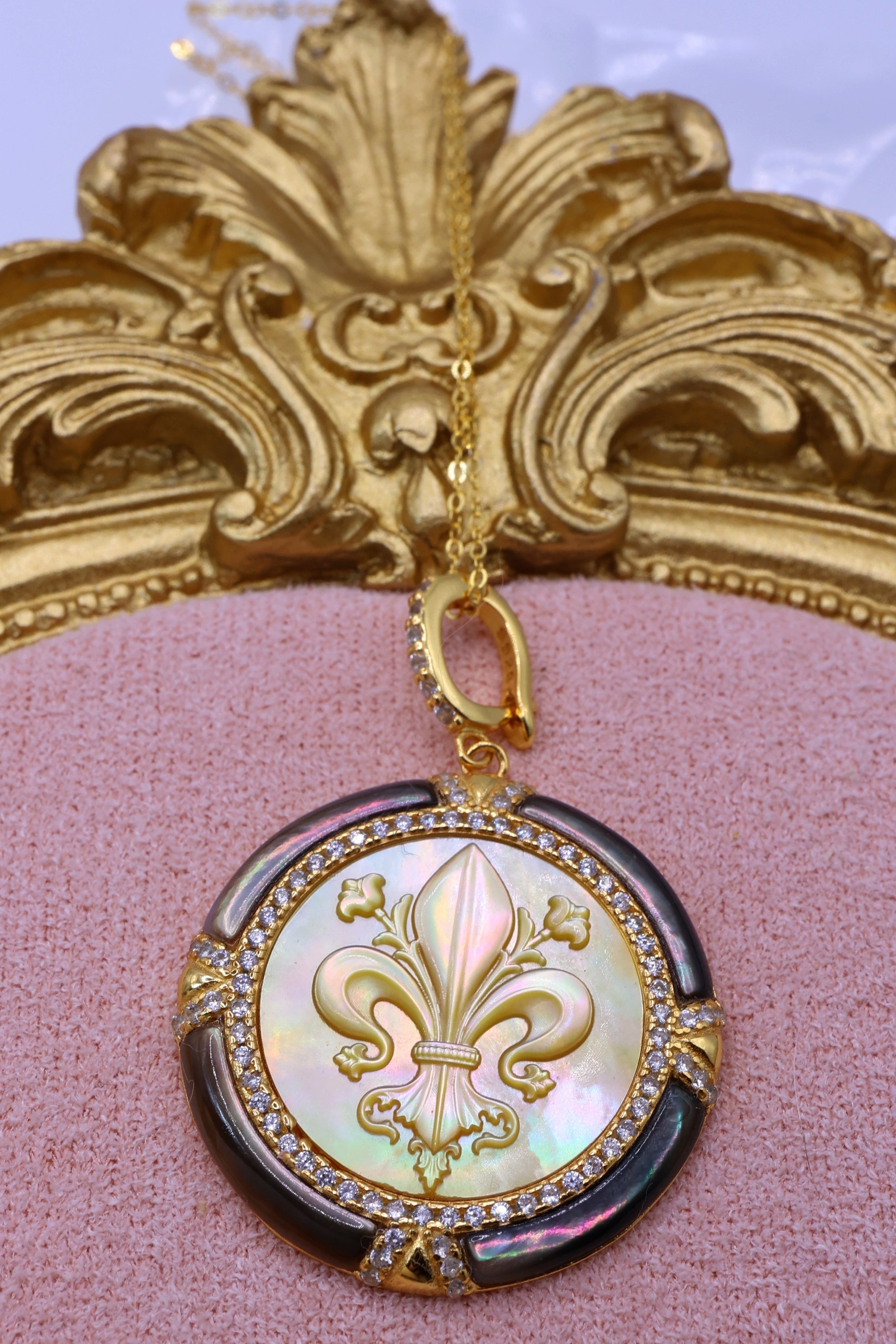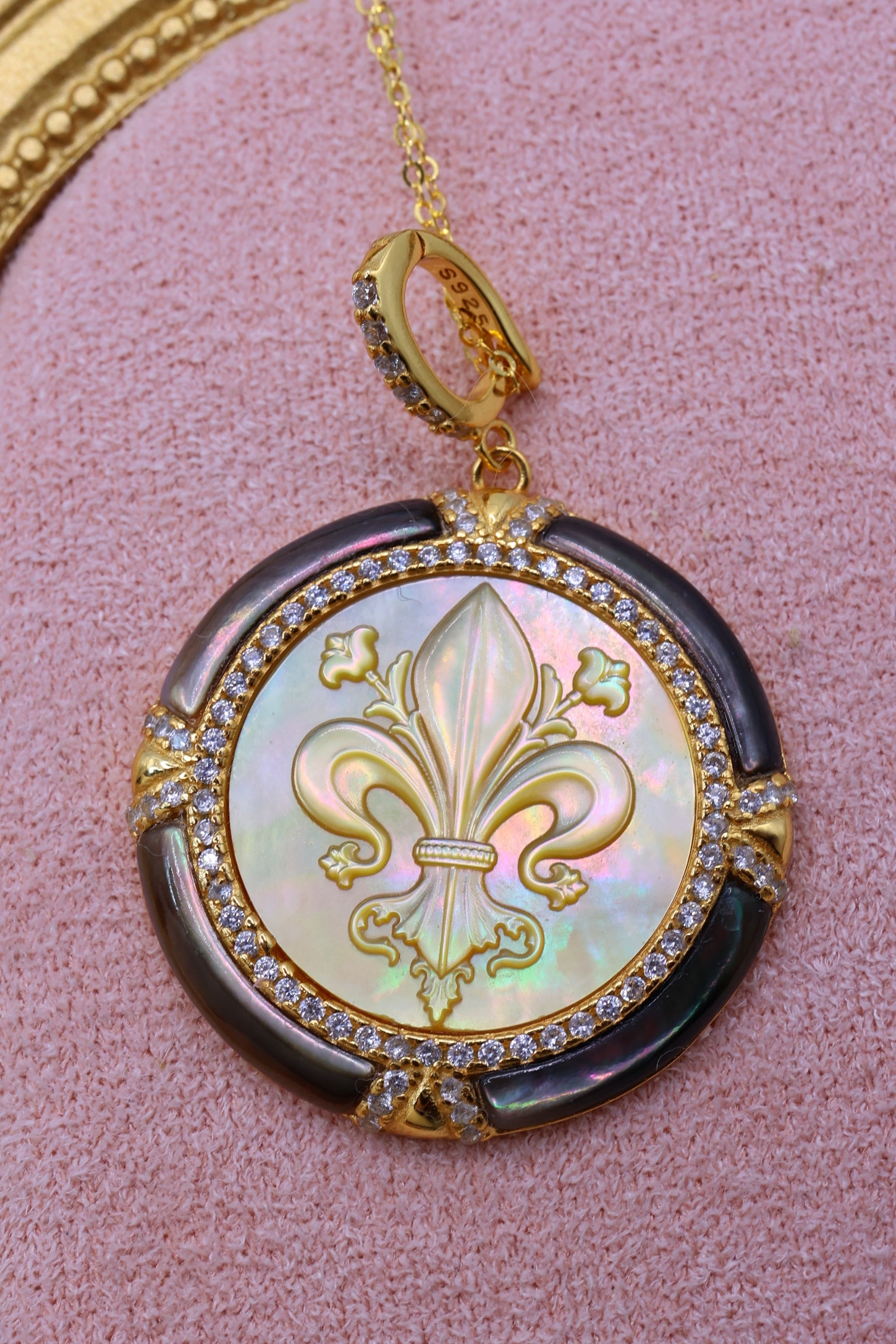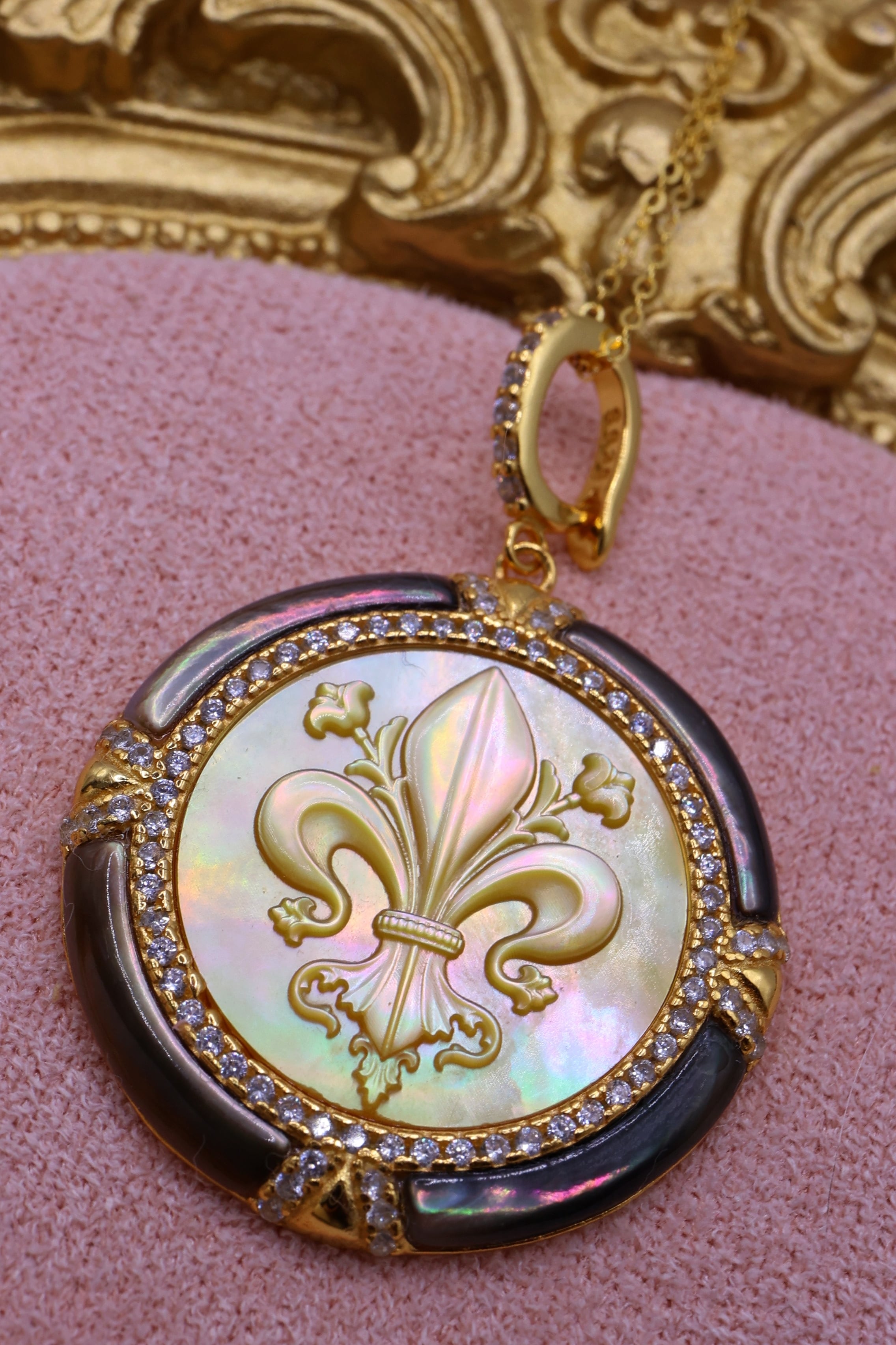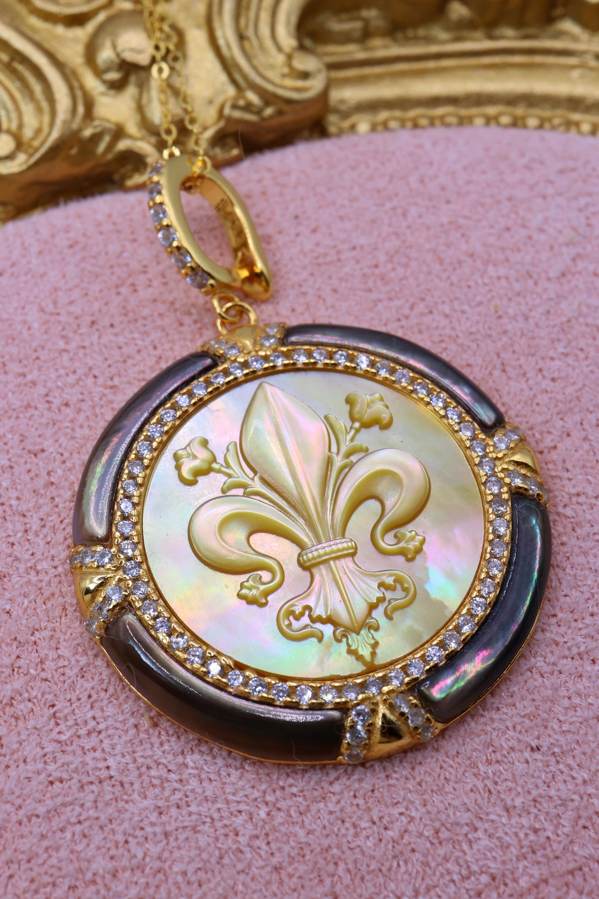 本作は、その貴重な母貝を贅沢に使用し、王家の紋章としても知られるフルールドリス(百合の紋章)を精緻に彫刻。