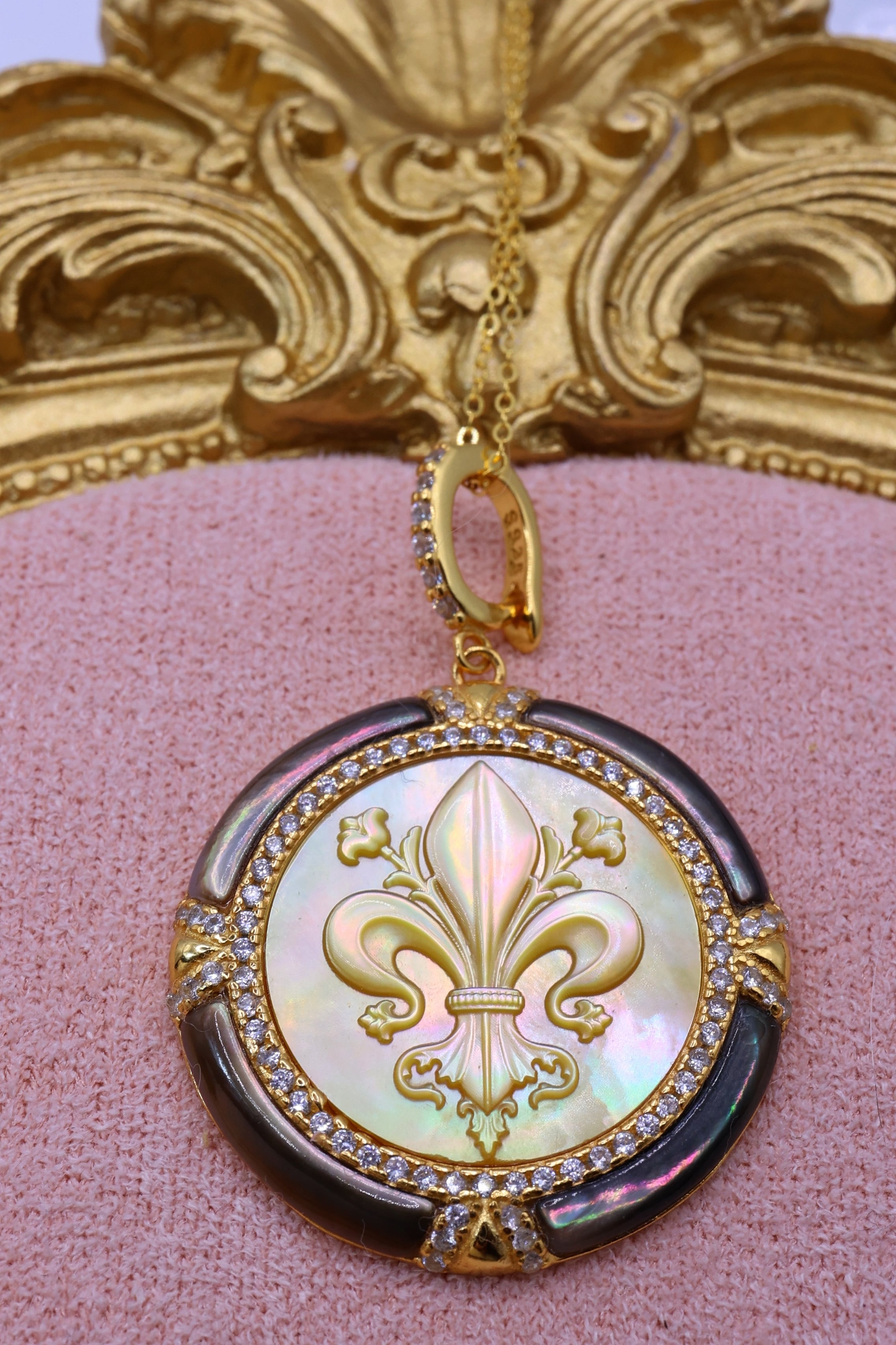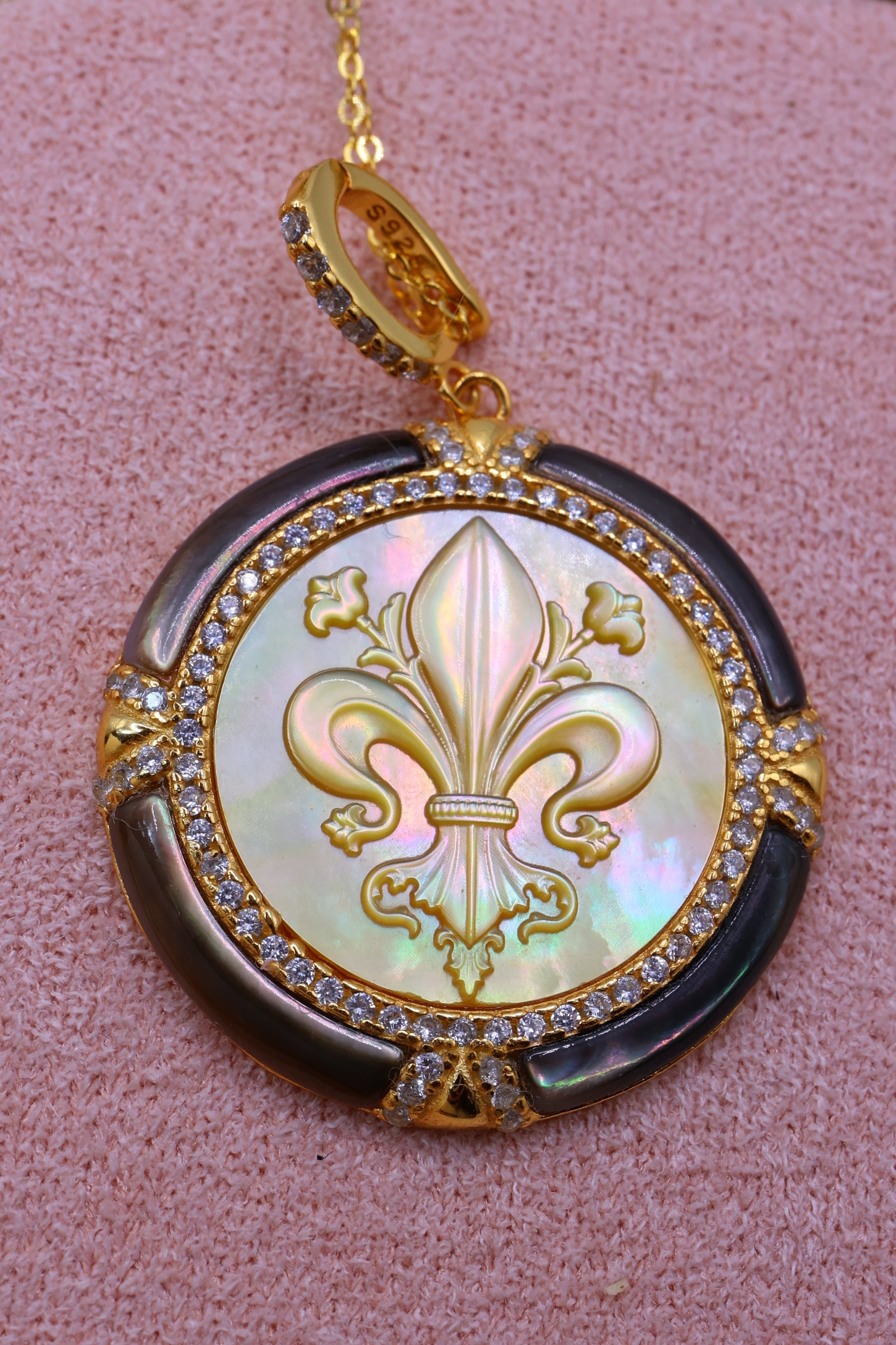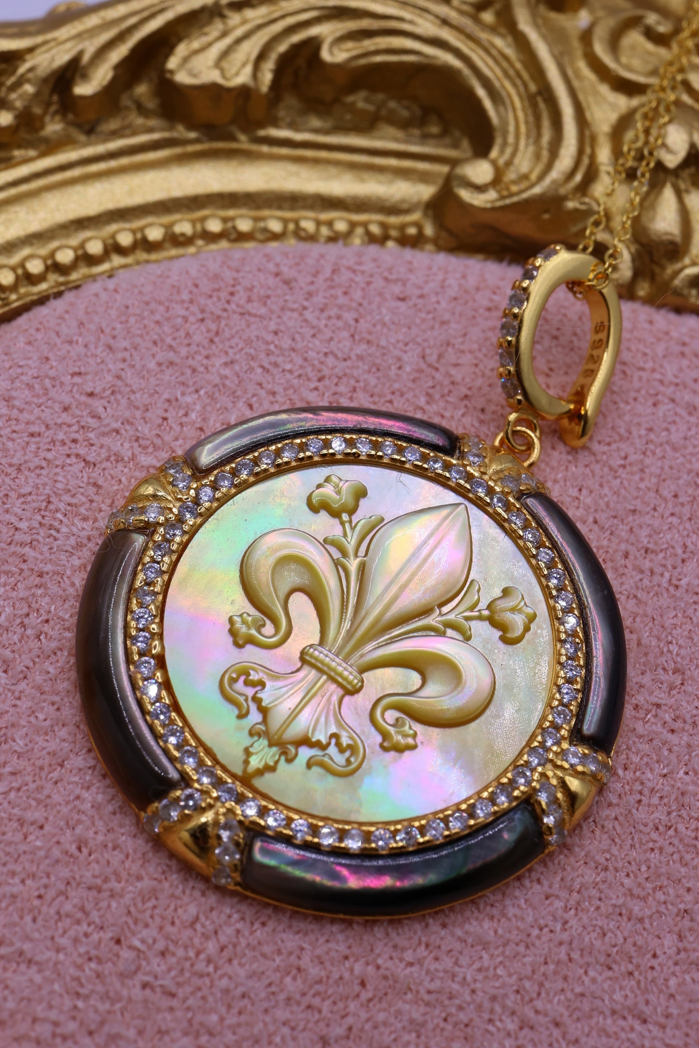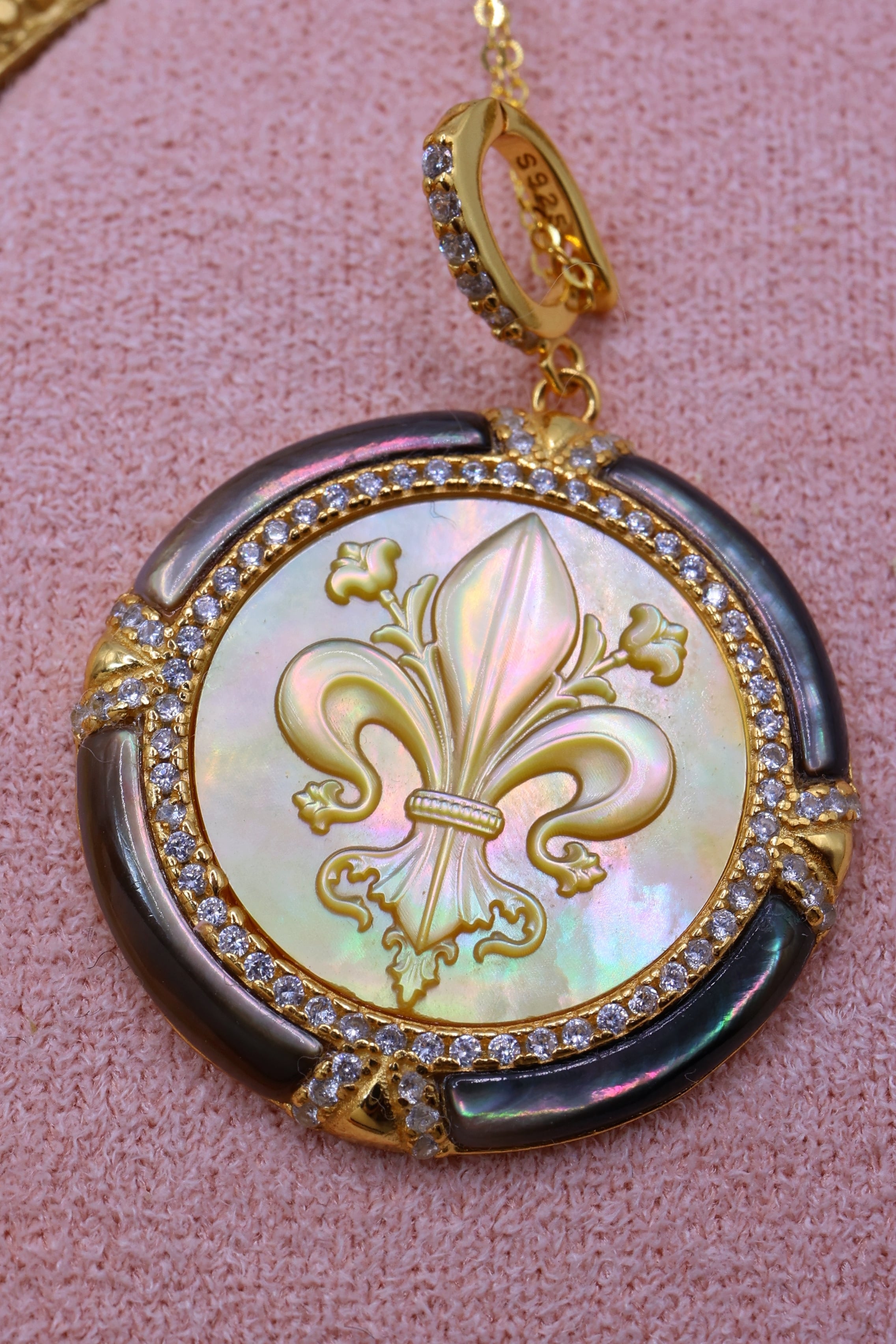 本作は、その貴重な母貝を贅沢に使用し、王家の紋章としても知られるフルールドリス(百合の紋章)を精緻に彫刻。