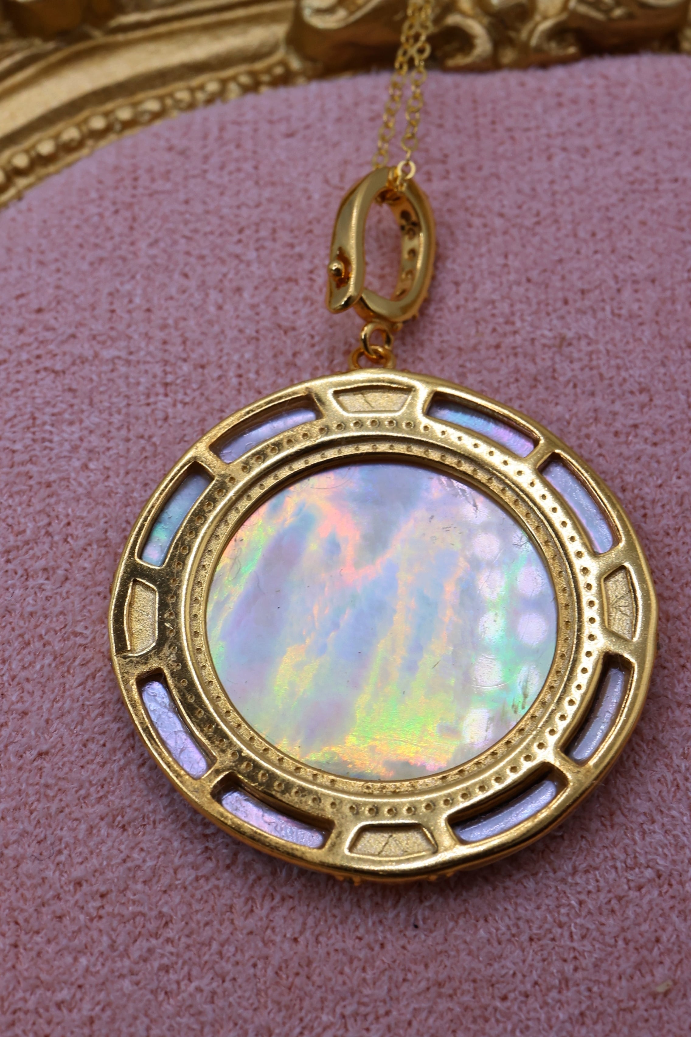 ピーコックグリーンや紫を帯びた艶が、中央のゴールドリップ白蝶貝の輝きをより引き立てます。