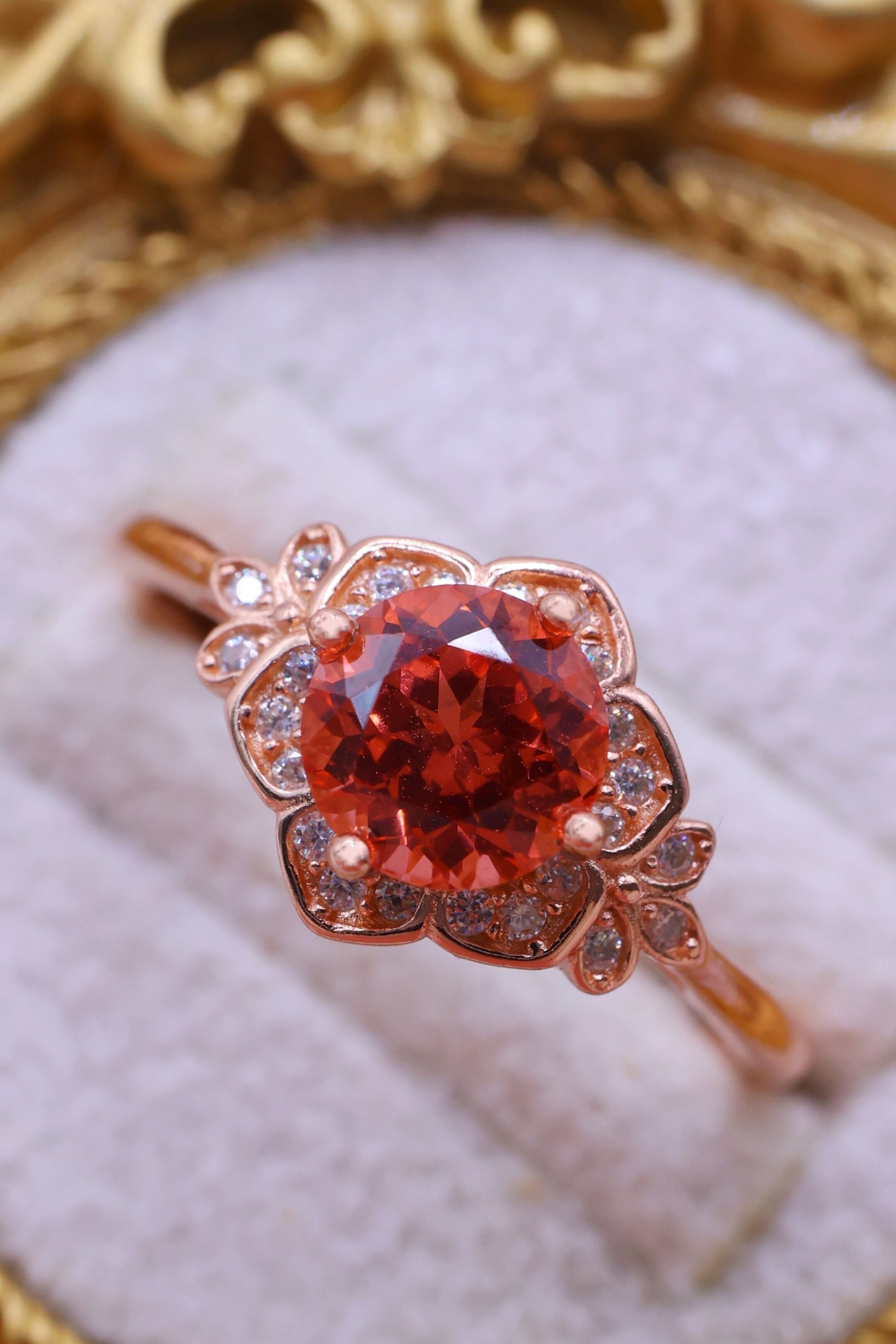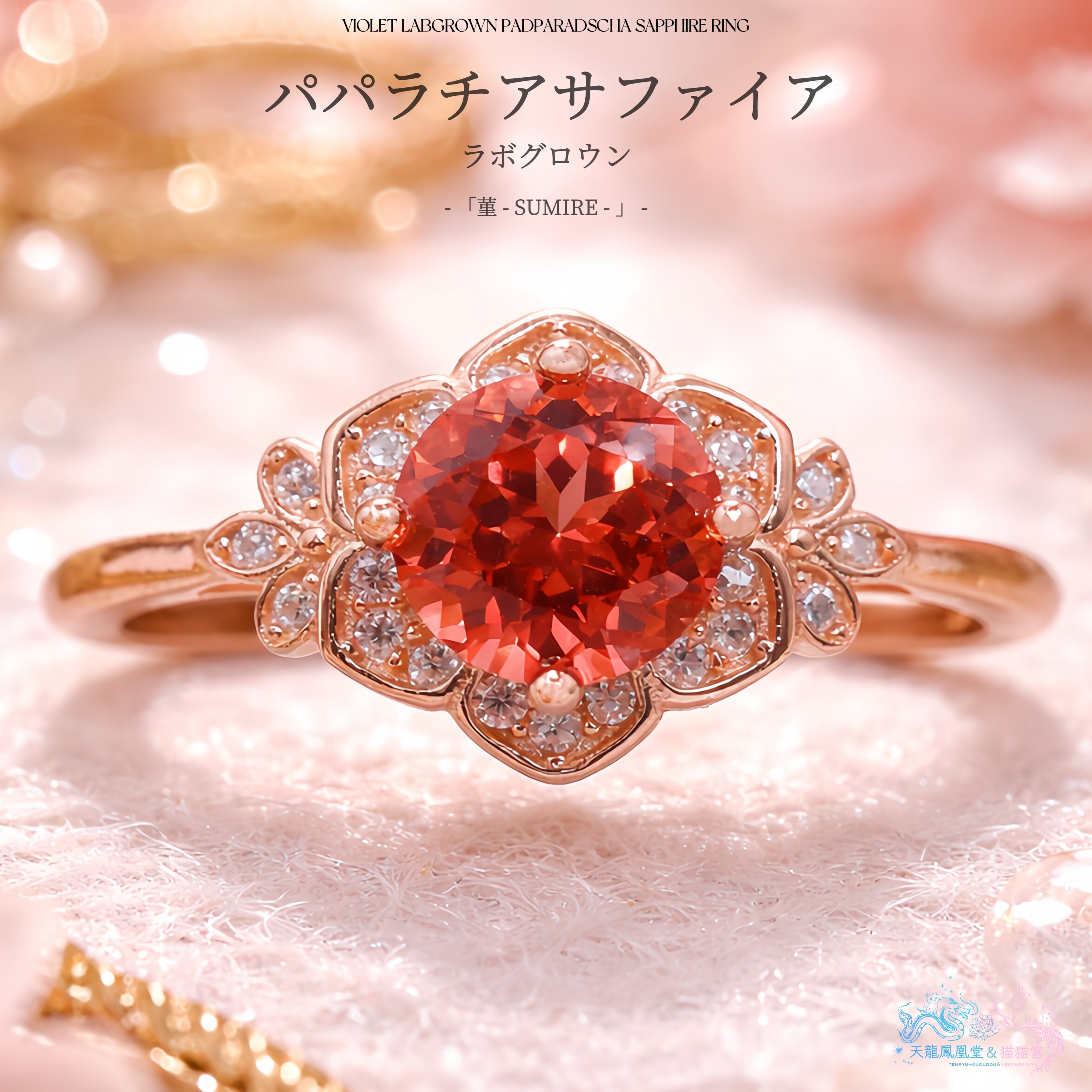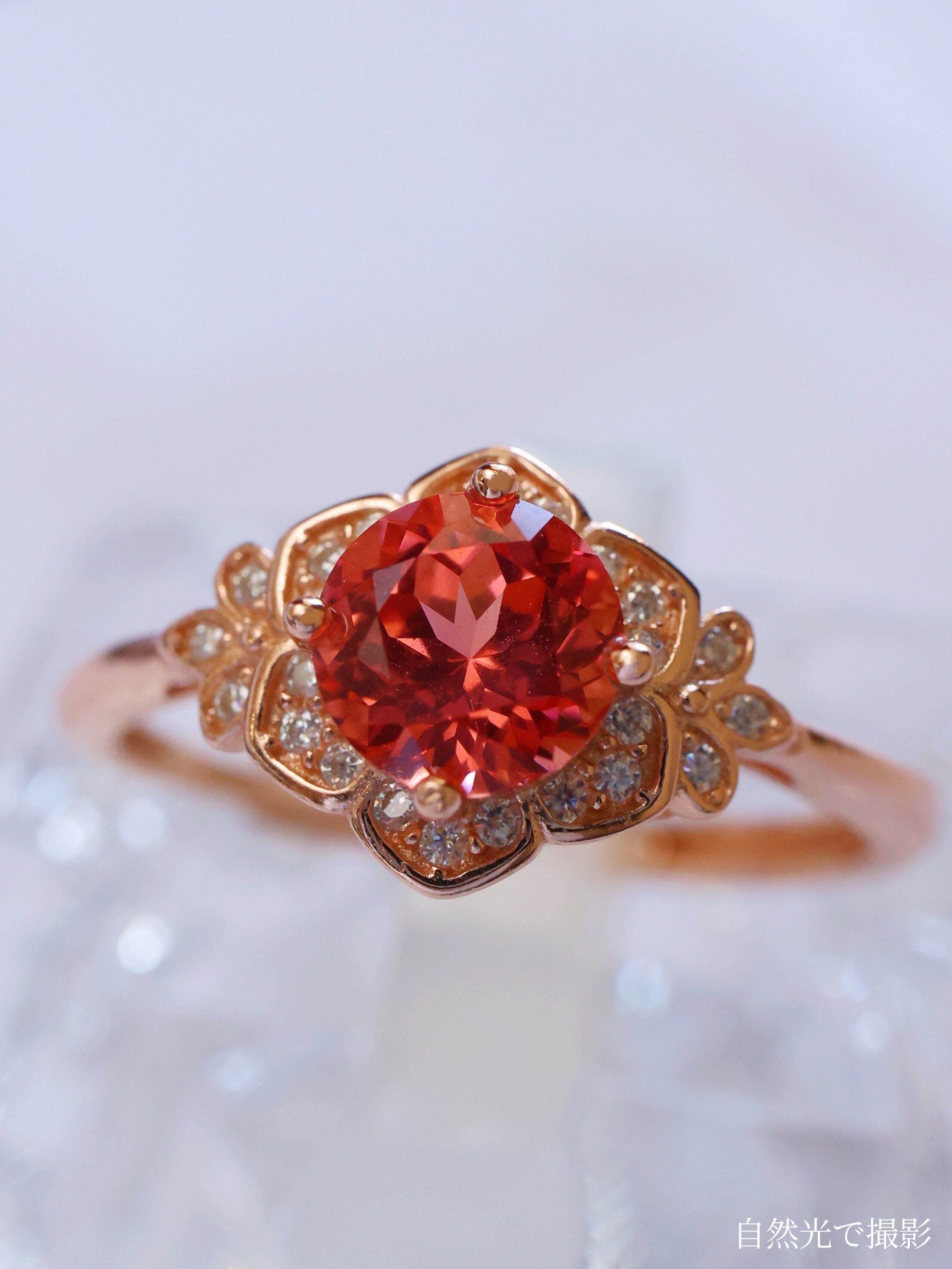 ロシアの宝石研究所より直送された、ラボグロウン・パパラチアサファイアを主石に使用したリングです。